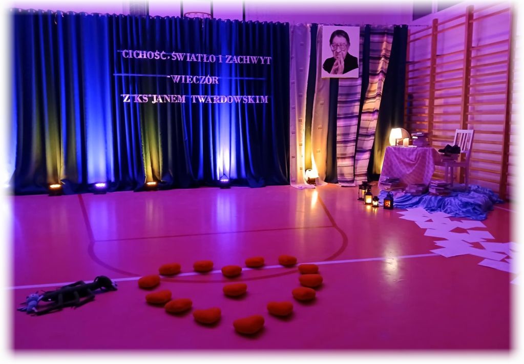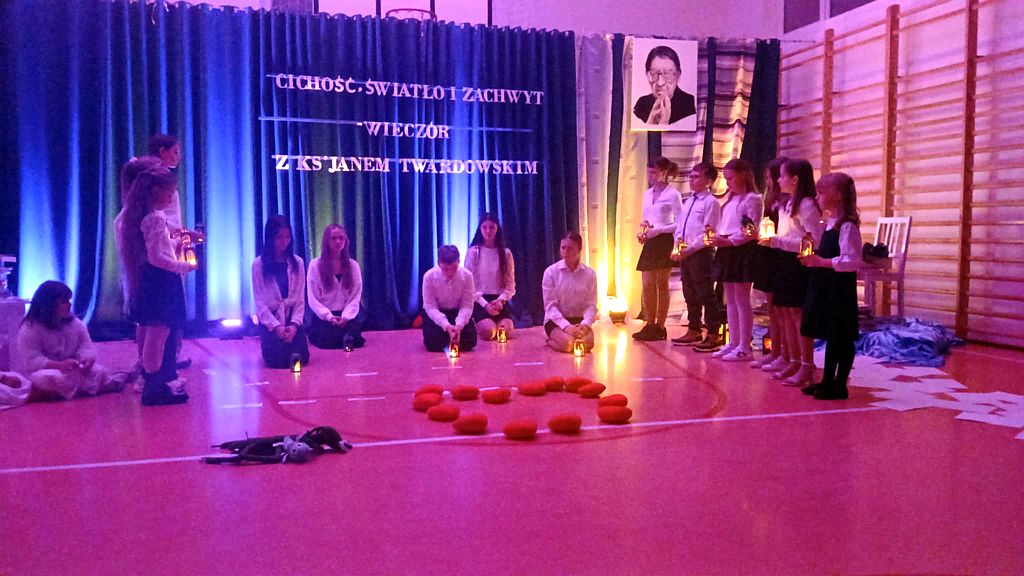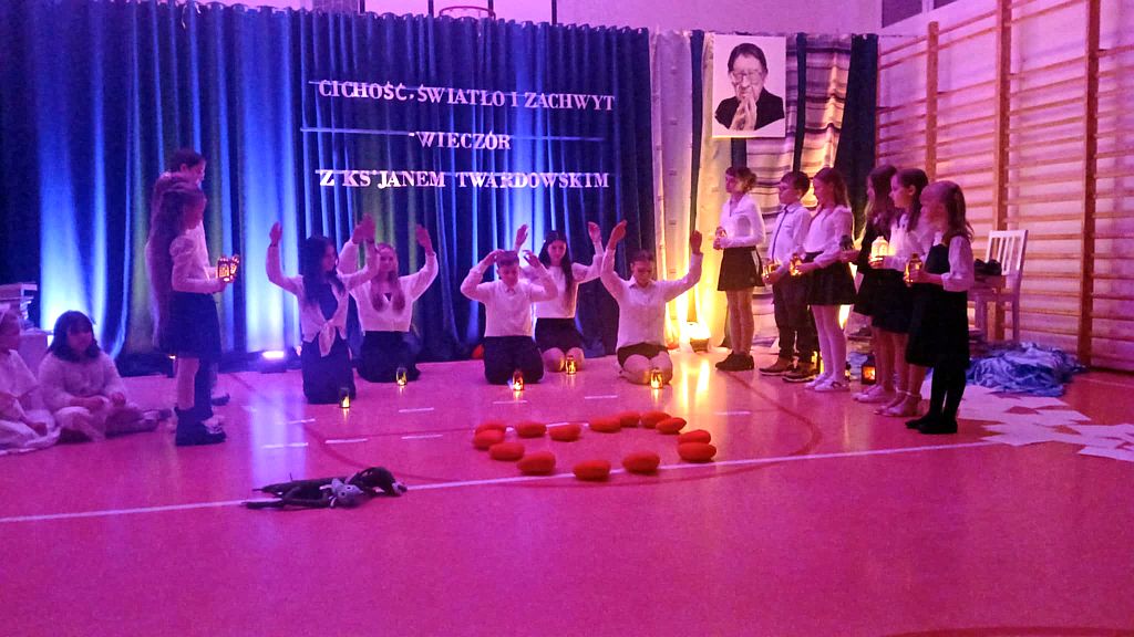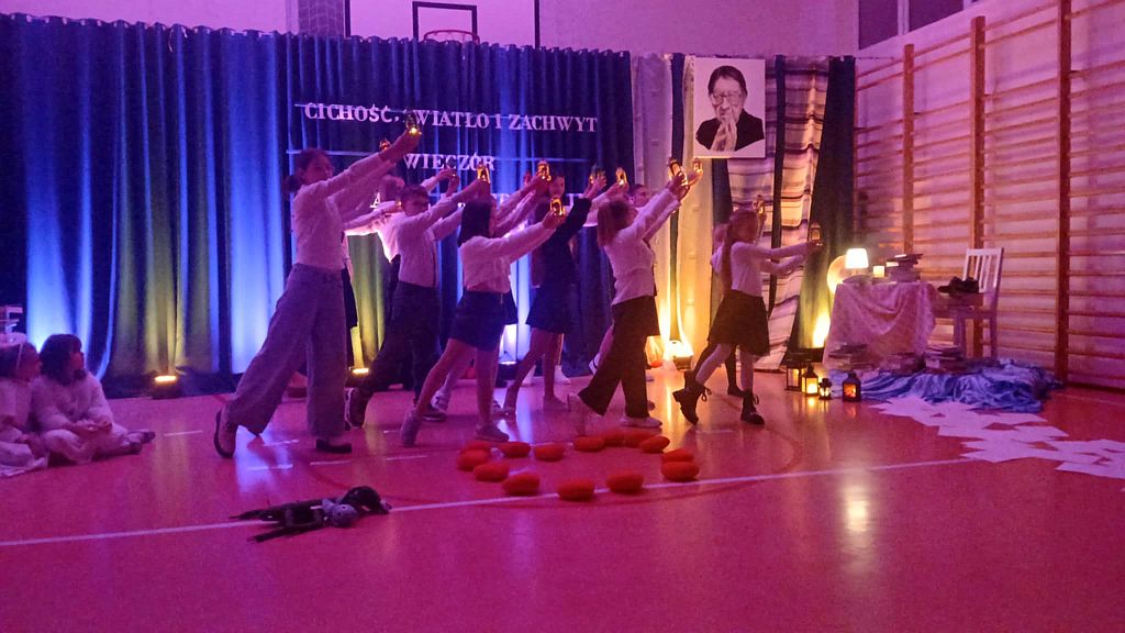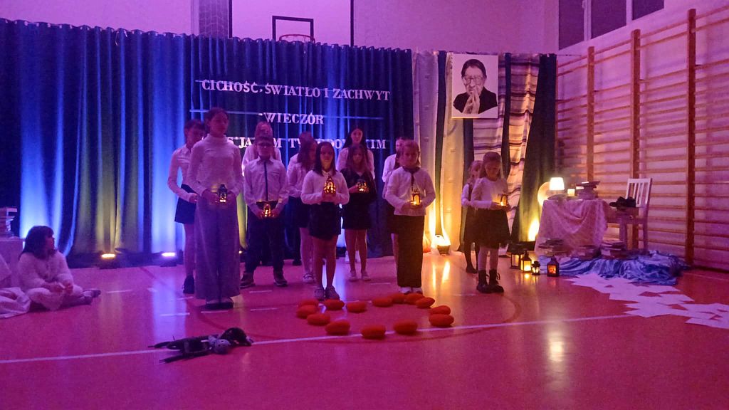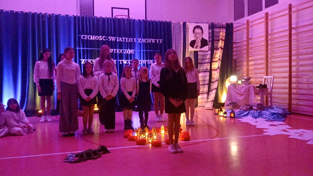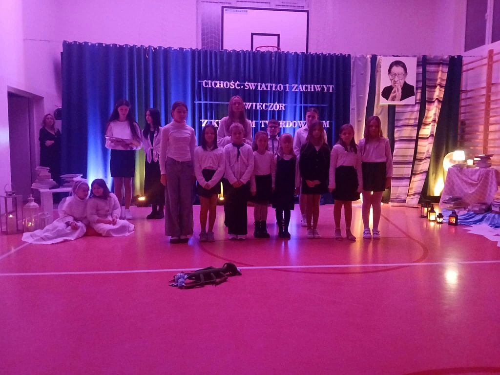 W dzisiejszym świecie pełnym pośpiechu ważne jest, aby umieć znaleźć chwilę, w której możemy zwolnić, spotkać się ze sobą nawzajem i przypomnieć sobie o wartościach, które naprawdę budują wspólnotę. Z takiej potrzeby narodził się pomysł zorganizowania wieczornicy w naszej szkole - wydarzenia, które nie tylko przypomina o twórczości ks. Jana Twardowskiego, patrona naszej placówki, ale także stwarza przestrzeń do spokojnej rozmowy, refleksji i wspólnego przeżywania. Celem spotkania było pokazanie, że poezja ks. Jana Twardowskiego wciąż pozostaje aktualna i inspirująca, a jej przesłanie może pomóc zarówno dzieciom, jak i dorosłym zatrzymać się choć na moment i pomyśleć o tym, co naprawdę ważne. Tegoroczna wieczornica, zorganizowana 25 listopada, odbyła się pod hasłem „Cichość, światło i zachwyt”. Wydarzenie rozpoczęła Dyrektor szkoły, Hanna Kirchhof, witając wszystkich zebranych gości i podkreślając, jak cenne są chwile, w których uczniowie, rodzice, nauczyciele i wszyscy inni uczestnicy mogą spotkać się w atmosferze skupienia i życzliwości. Jej słowa stworzyły spokojne wprowadzenie do części artystycznej i nadały całemu wieczorowi uroczysty charakter. Nasi uczniowie recytowali wiersze patrona szkoły, starając się jak najpiękniej oddać ich sens i przekaz. W ich interpretacjach można było poczuć emocje, szczerość i prawdziwe przejęcie. Program wzbogaciły również nastrojowe układy taneczne oraz pantomima, która bez słów opowiadała o bliskości, miłości i prostocie. Odpowiednio dobrane dekoracje i światło dodatkowo podkreślały wyjątkową atmosferę wieczoru. Całe wydarzenie niosło w sobie wiele ciepła i duchowości. Poezja ks. Twardowskiego - prosta, a jednocześnie pełna mądrości - stała się dla wszystkich zgromadzonych okazją do refleksji. Widzowie z uwagą wsłuchiwali się w każde słowo, a delikatne światło i muzyka tworzyły spokojny, harmonijny klimat, w którym każdy mógł poczuć głębię hasła „Cichość, światło i zachwyt”. Cieszy nas, że wieczornica została przyjęta z tak dużym wzruszeniem i uznaniem. Oklaski oraz ciepłe podziękowania po występach były najpiękniejszym dowodem, że praca i zaangażowanie uczniów oraz wszystkich osób, które przygotowywały to wydarzenie, zostały zauważone. Pragniemy także serdecznie podziękować wszystkim uczestnikom za obecność i wspólne przeżywanie tego wyjątkowego wieczoru. To dzięki Wam cała atmosfera nabrała wyjątkowego znaczenia. Wierzymy, że wspólne przeżycia tego wieczoru pozostaną na długo w pamięci uczestników i staną się zachętą zarówno do dostrzegania piękna w codzienności, jak i do dalszego odkrywania wartości obecnych w twórczości ks. Jana Twardowskiego.
