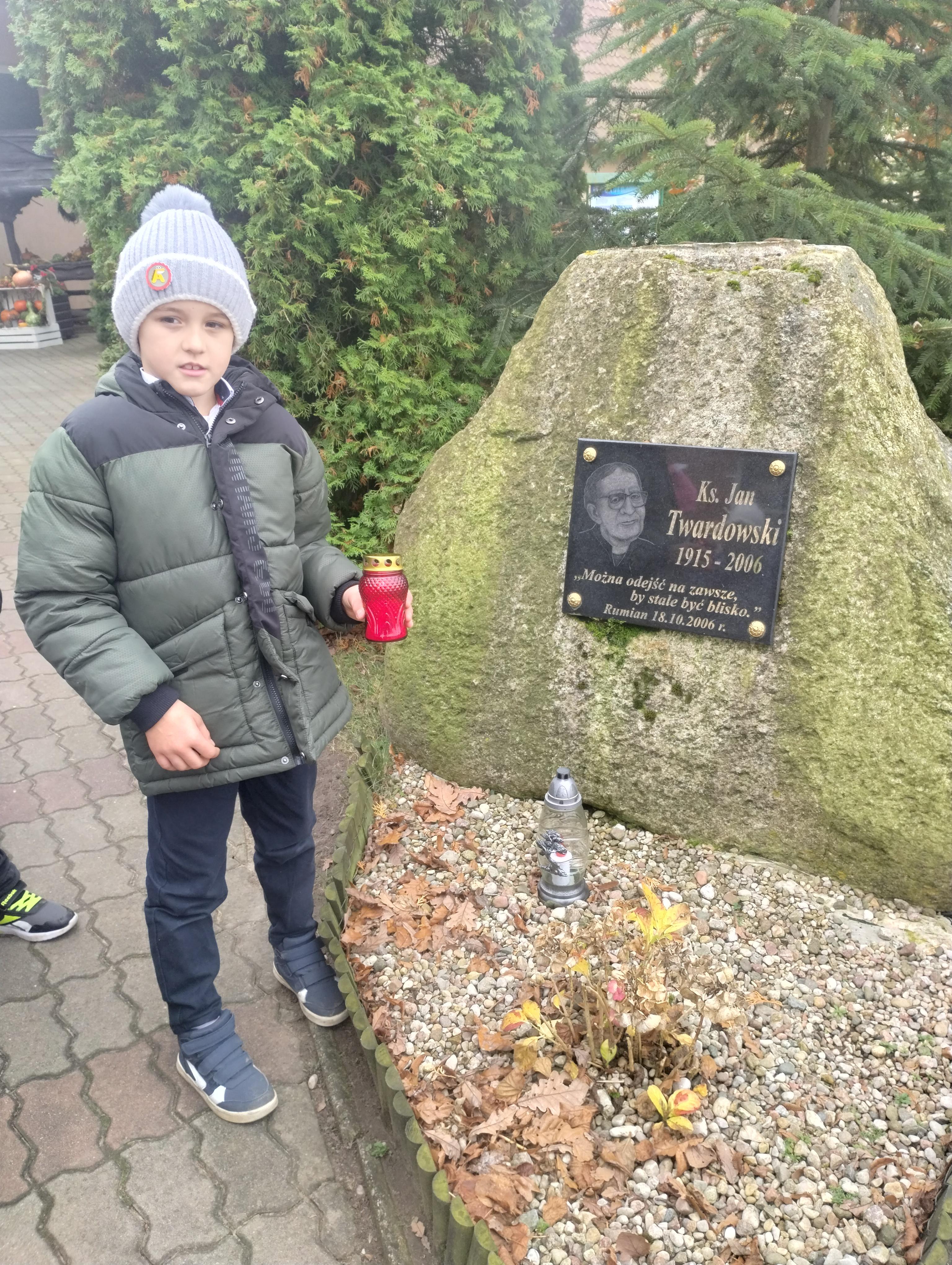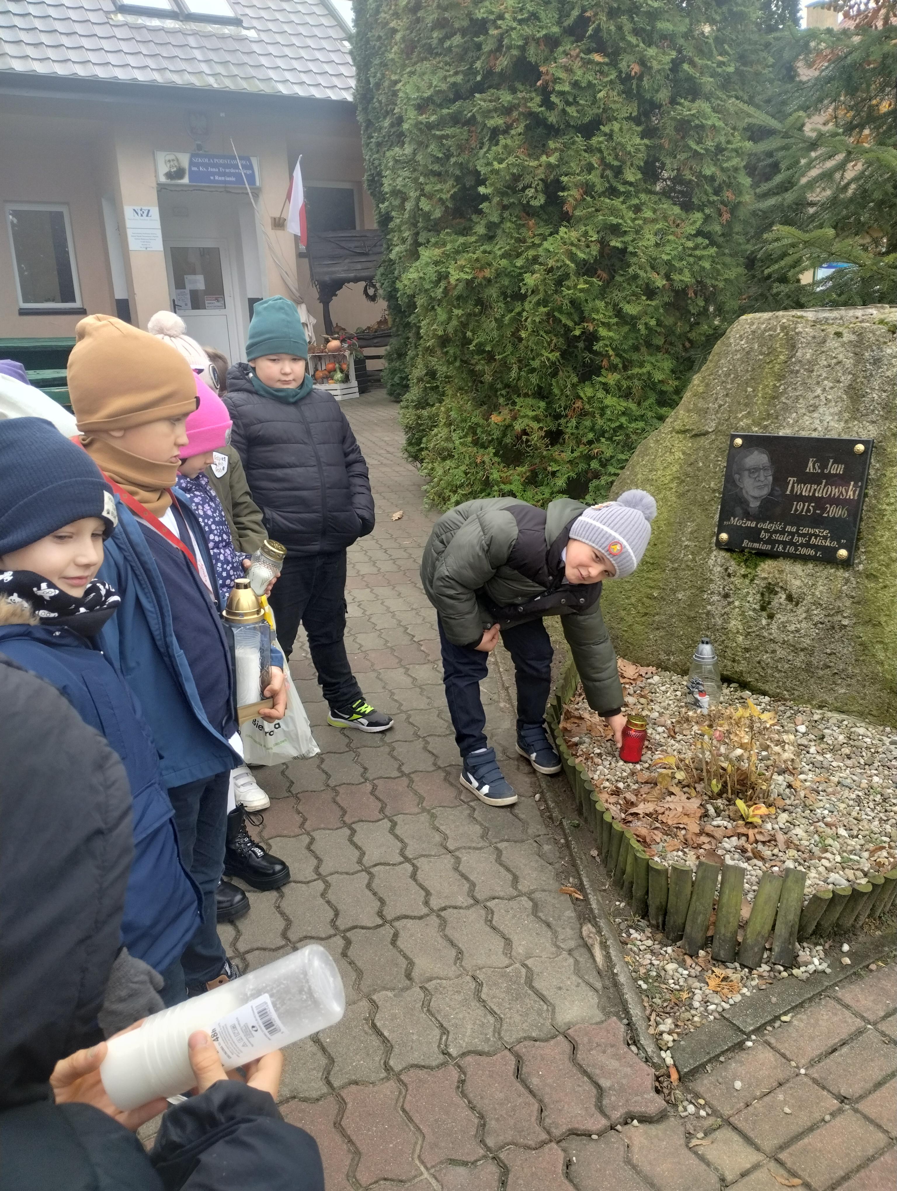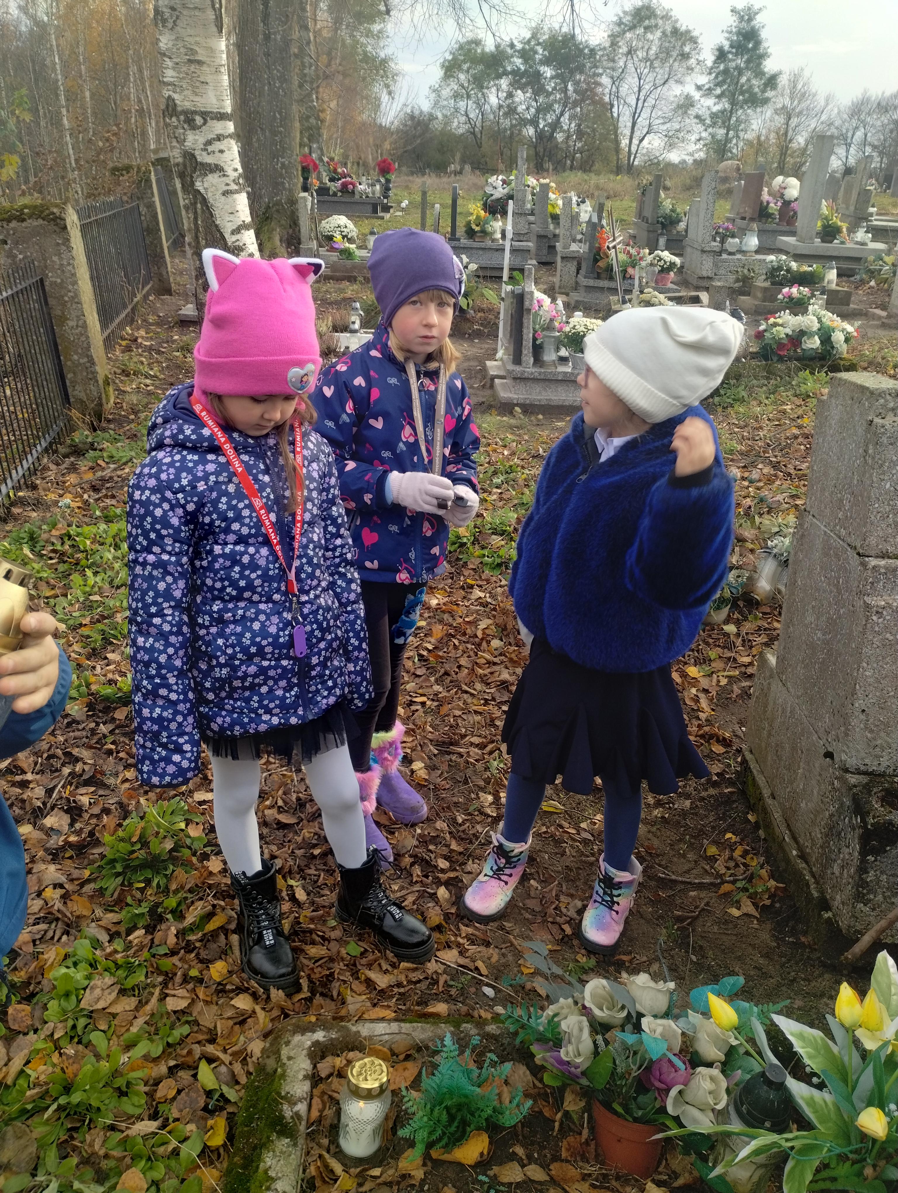 Uczniowie klasy I na cmentarzu parafialnym w Rumianie zapalili światełka na grobach bezimiennych, opuszczonych, o których nikt już nie pamięta. Odwiedzili grób zmarłej w tym roku nauczycielki, która przez wiele lat sprawowała funkcję dyrektora w naszej szkole. Zapalili lampkę i modlili się na grobach Kapłanów, którzy pracowali w tutejszej parafii. Znicz pamięci zapalili również przy tablicy pamiątkowej zmarłego patrona naszej szkoły Księdza Jana Twardowskiego, który pisał: „Śpieszmy się kochać ludzi tak szybko odchodzą…”.