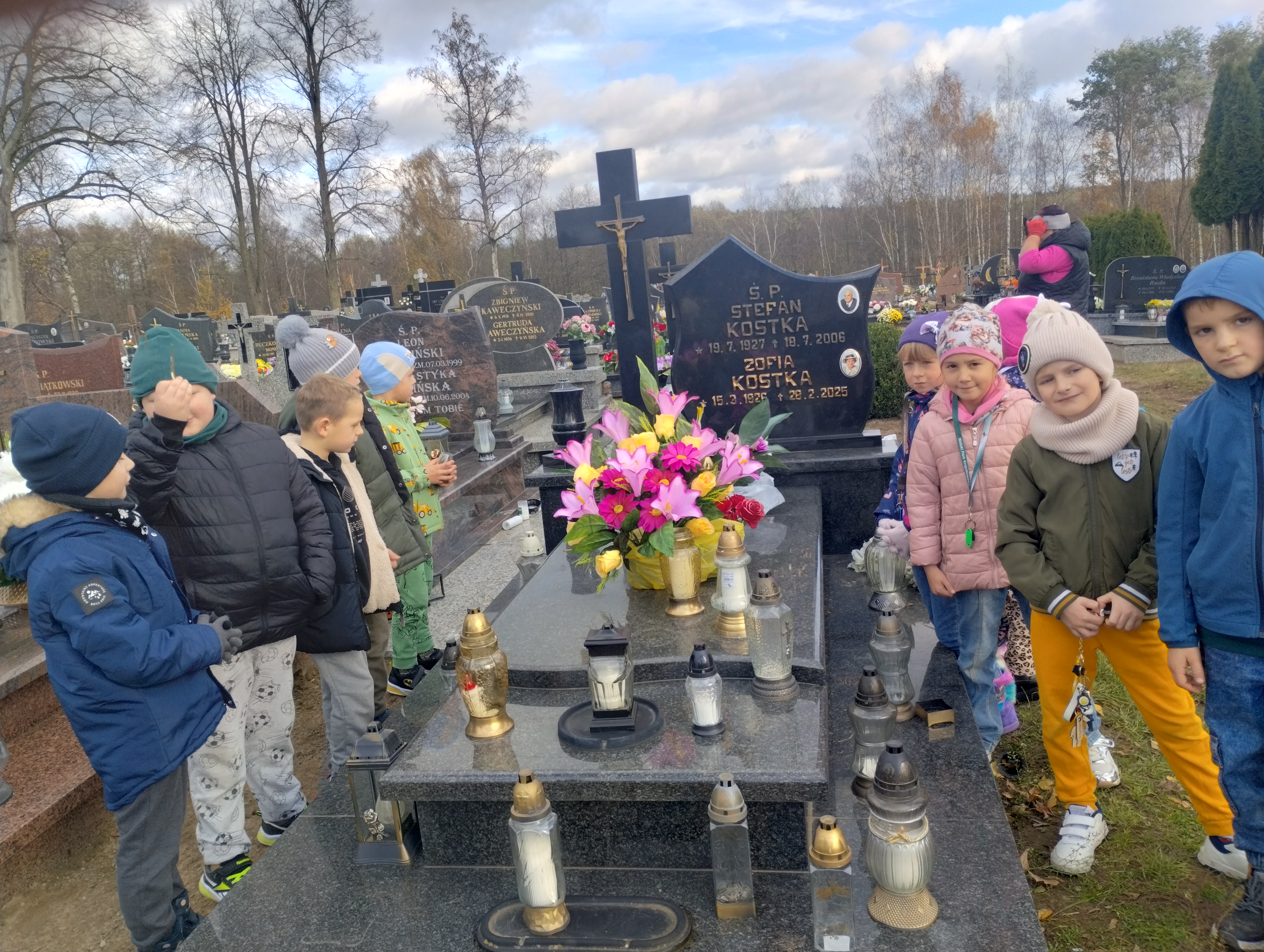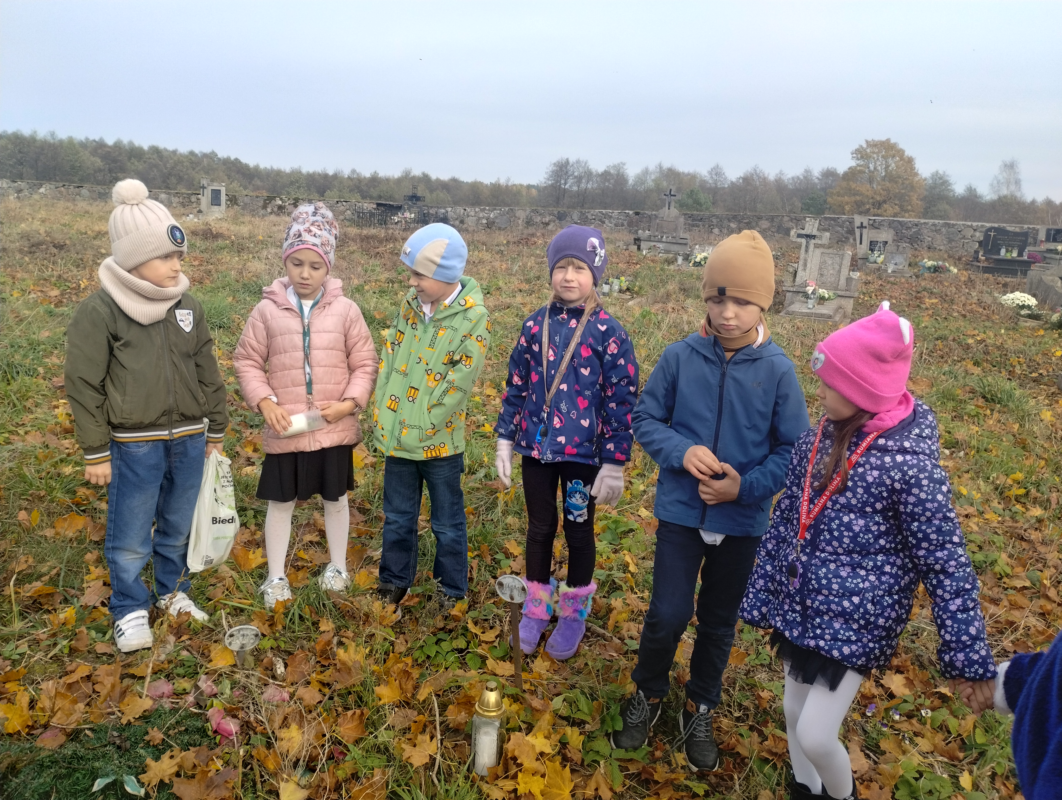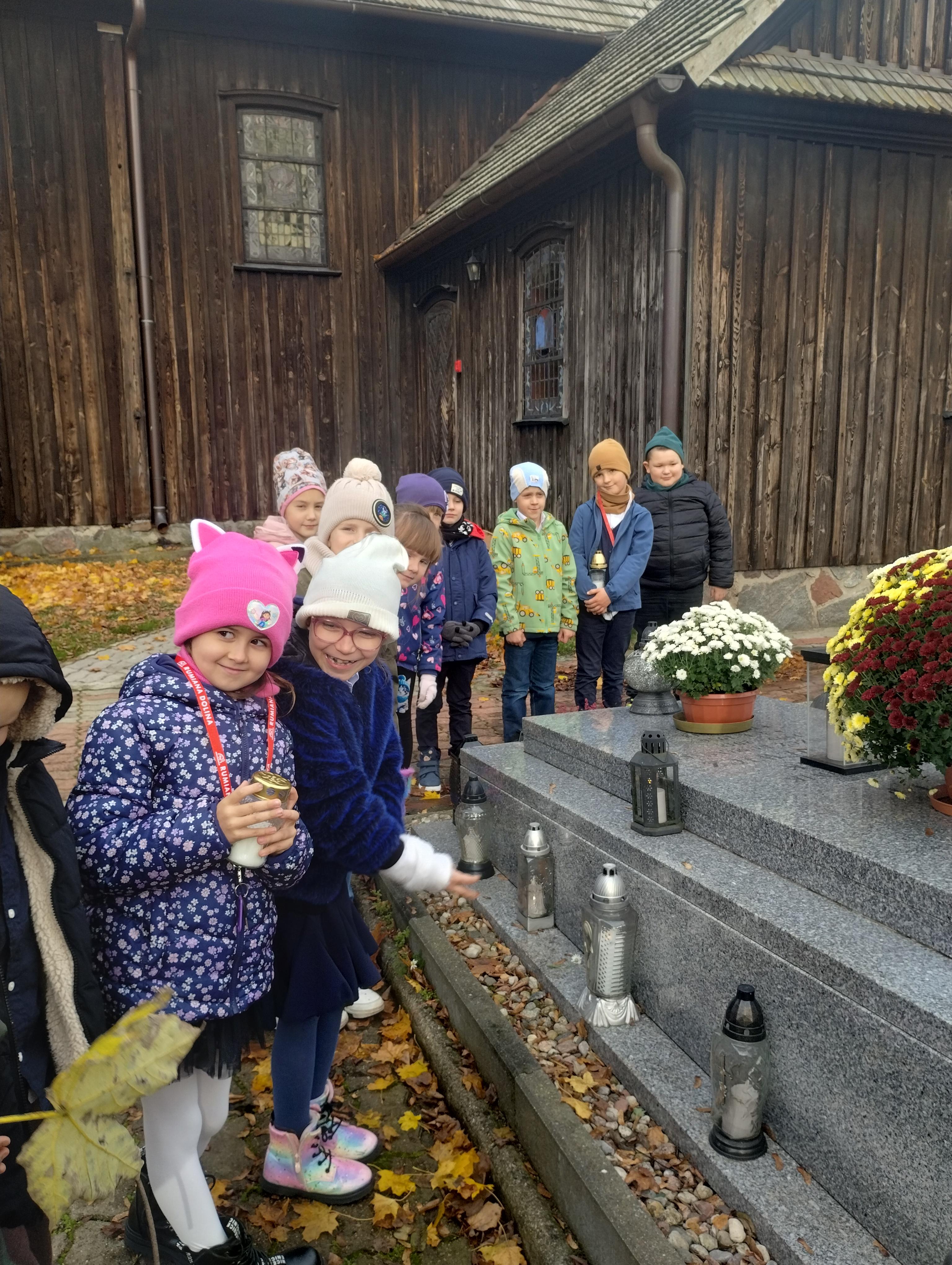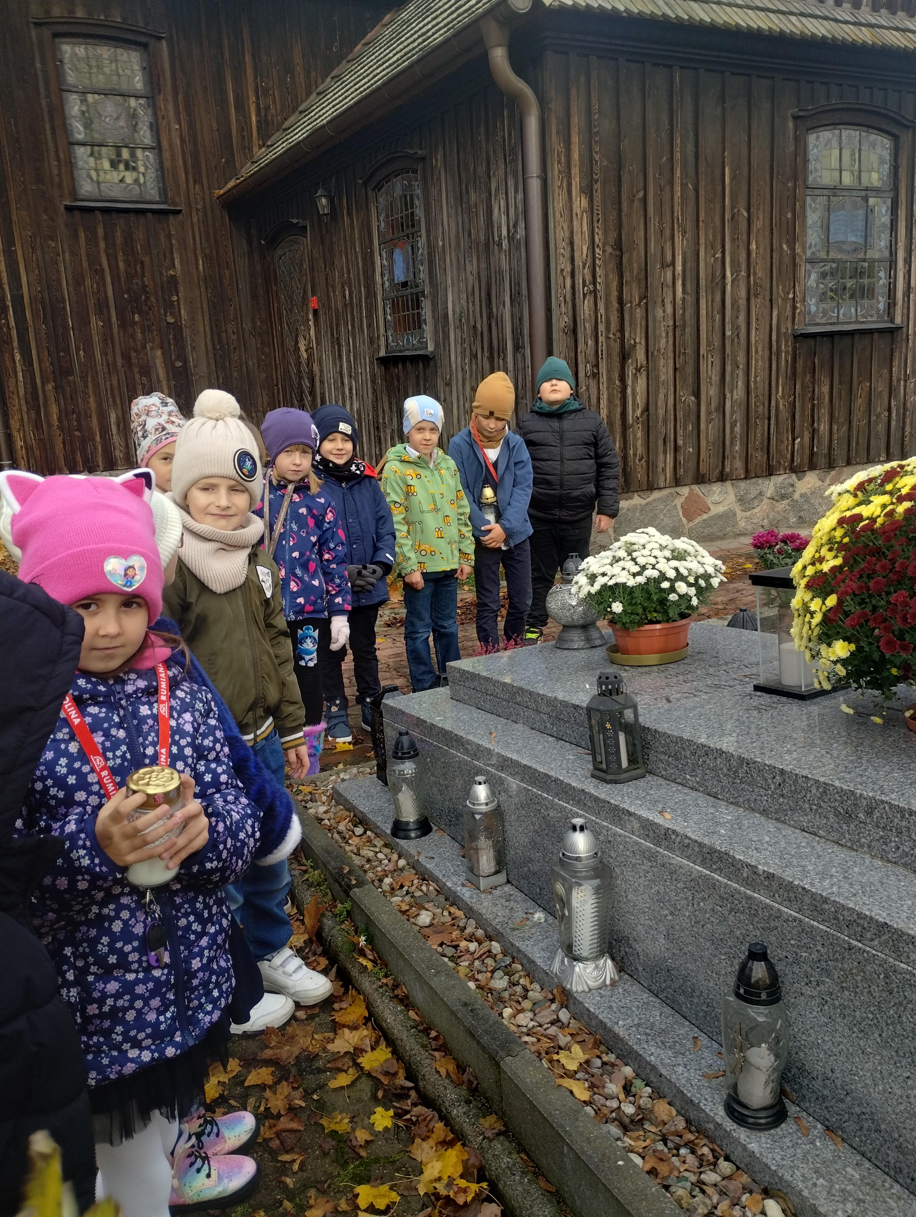 Uczniowie klasy I na cmentarzu parafialnym w Rumianie zapalili światełka na grobach bezimiennych, opuszczonych, o których nikt już nie pamięta. Odwiedzili grób zmarłej w tym roku nauczycielki, która przez wiele lat sprawowała funkcję dyrektora w naszej szkole. Zapalili lampkę i modlili się na grobach Kapłanów, którzy pracowali w tutejszej parafii. Znicz pamięci zapalili również przy tablicy pamiątkowej zmarłego patrona naszej szkoły Księdza Jana Twardowskiego, który pisał: „Śpieszmy się kochać ludzi tak szybko odchodzą…”.
