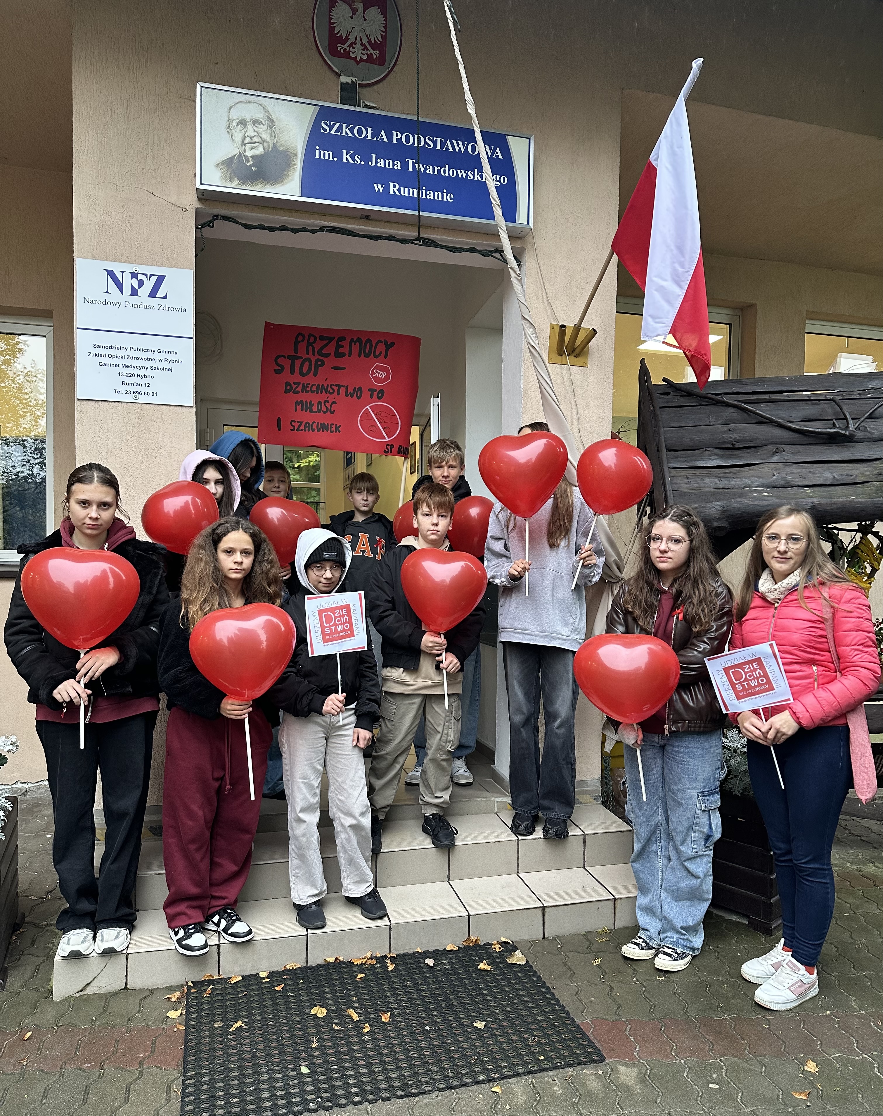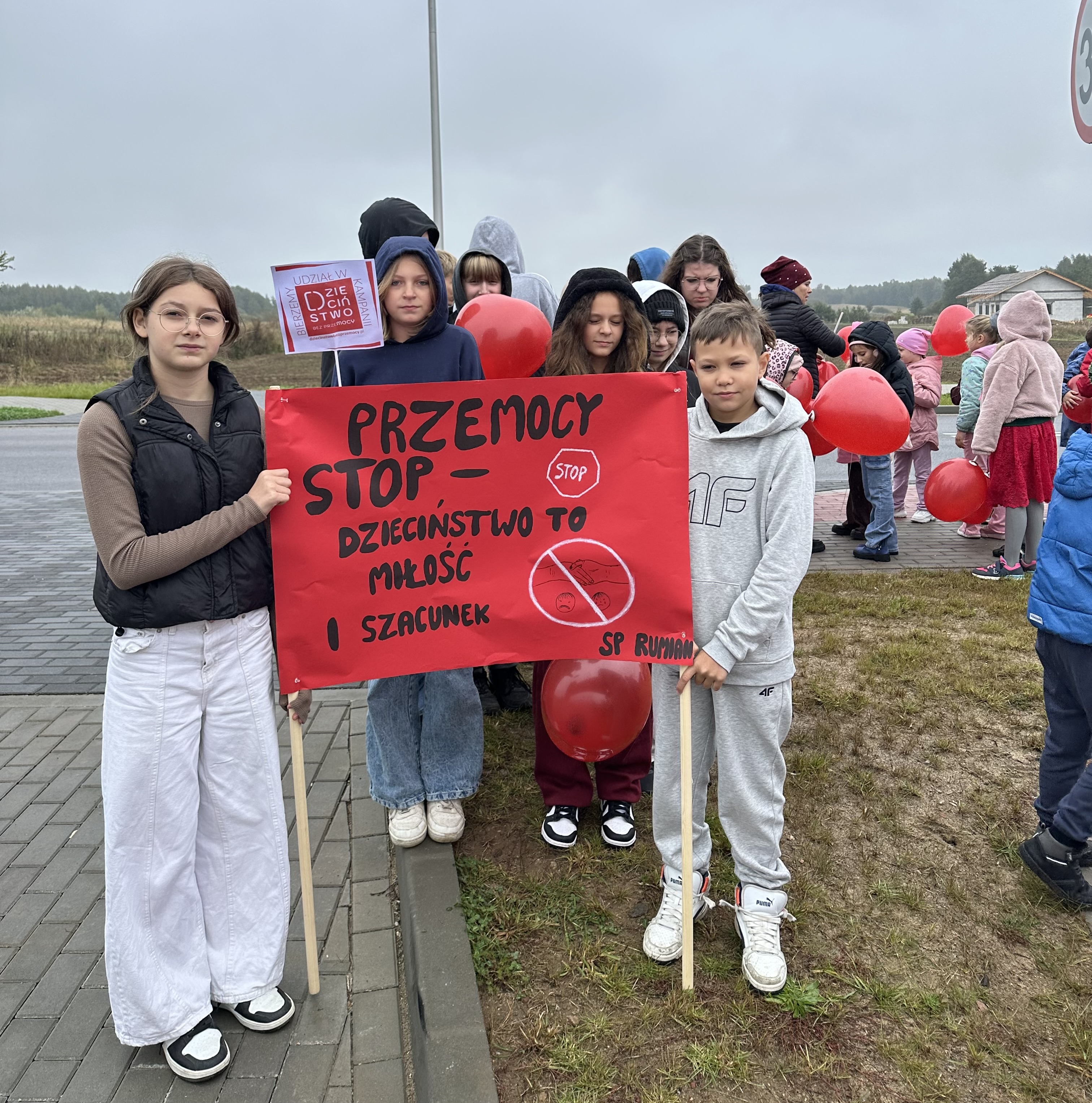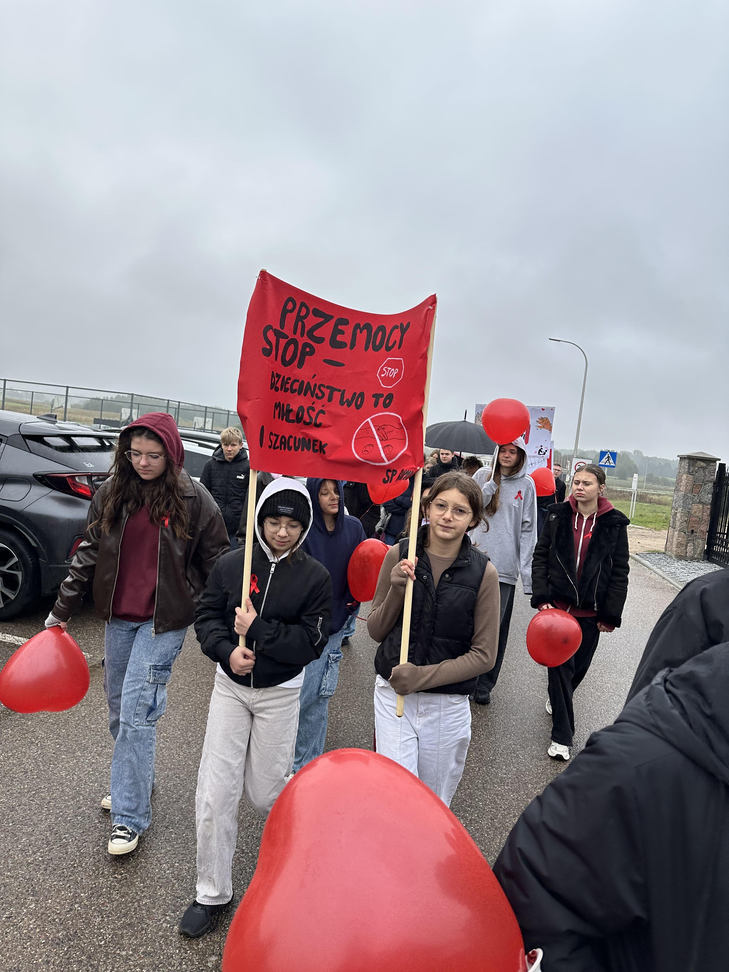 Nasza szkoła po raz drugi przystąpiła do ogólnopolskiej kampanii „Dzieciństwo bez przemocy”. Celem tej inicjatywy jest zwiększenie świadomości na temat przemocy wobec dzieci, a także rozwijanie umiejętności rozpoznawania zagrożeń, szukania pomocy oraz reagowania na przemoc. 6 października 2025 roku przedstawiciele naszej szkoły spotkali się z uczniami ze szkół z gminy Rybno, by wziąć udział w marszu organizowanym przez Gminny Zespół Interdyscyplinarny ds. Przeciwdziałania Przemocy w Rodzinie. Marsz, który przeszedł ulicami Rybna, zainaugurował kampanię pod hasłem „Razem możemy wszystko!”.