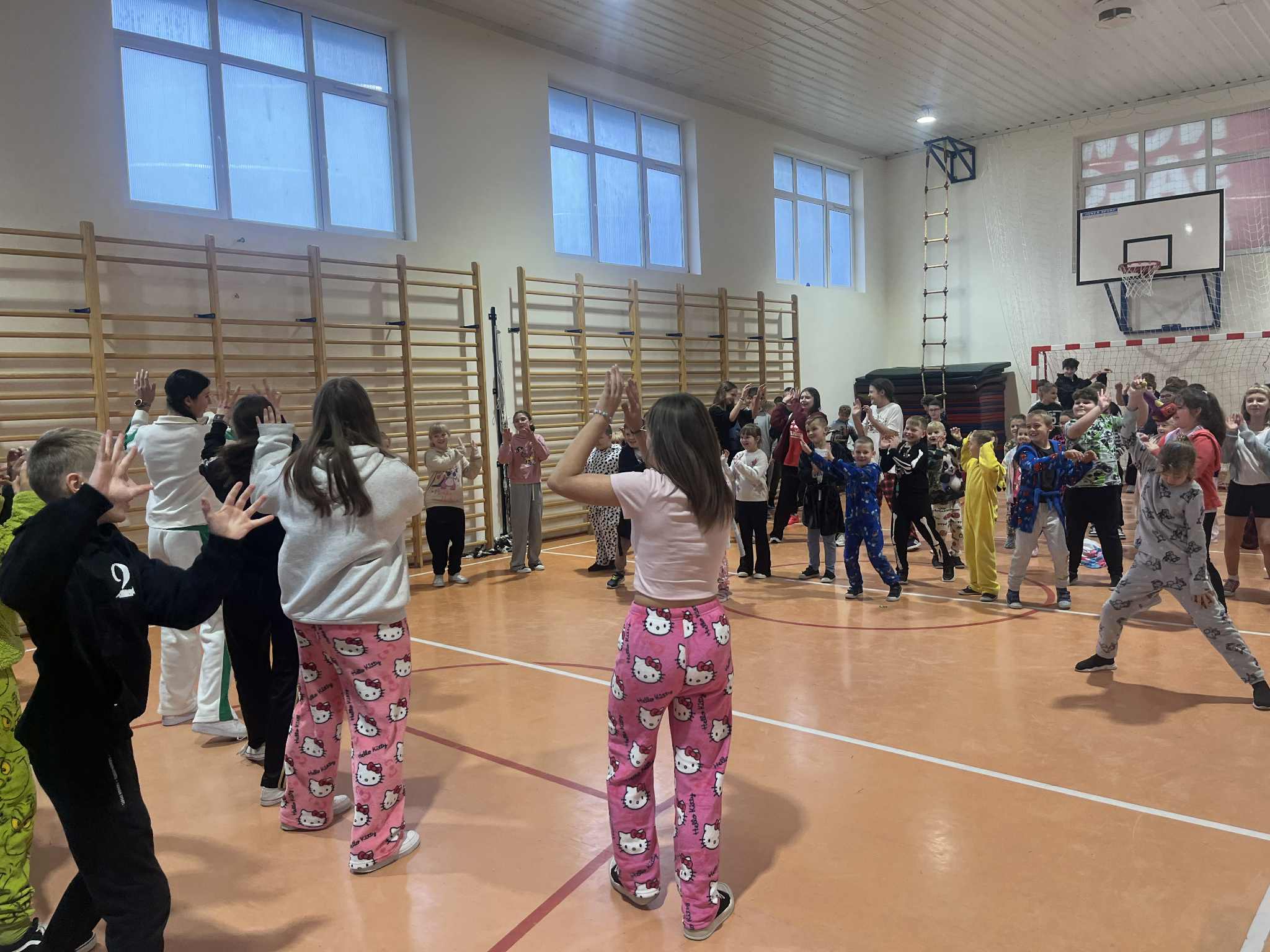 Dzień w Piżamie był także okazją do wspólnej zabawy i integracji. Podczas aktywnej przerwy cała społeczność szkolna tańczyła, śpiewała i ćwiczyła przy rytmicznej muzyce. Pokazy ruchów i układów tanecznych prowadziły uczennice z Samorządu Uczniowskiego oraz ósmoklasiści, którzy zarażali wszystkich pozytywną energią.