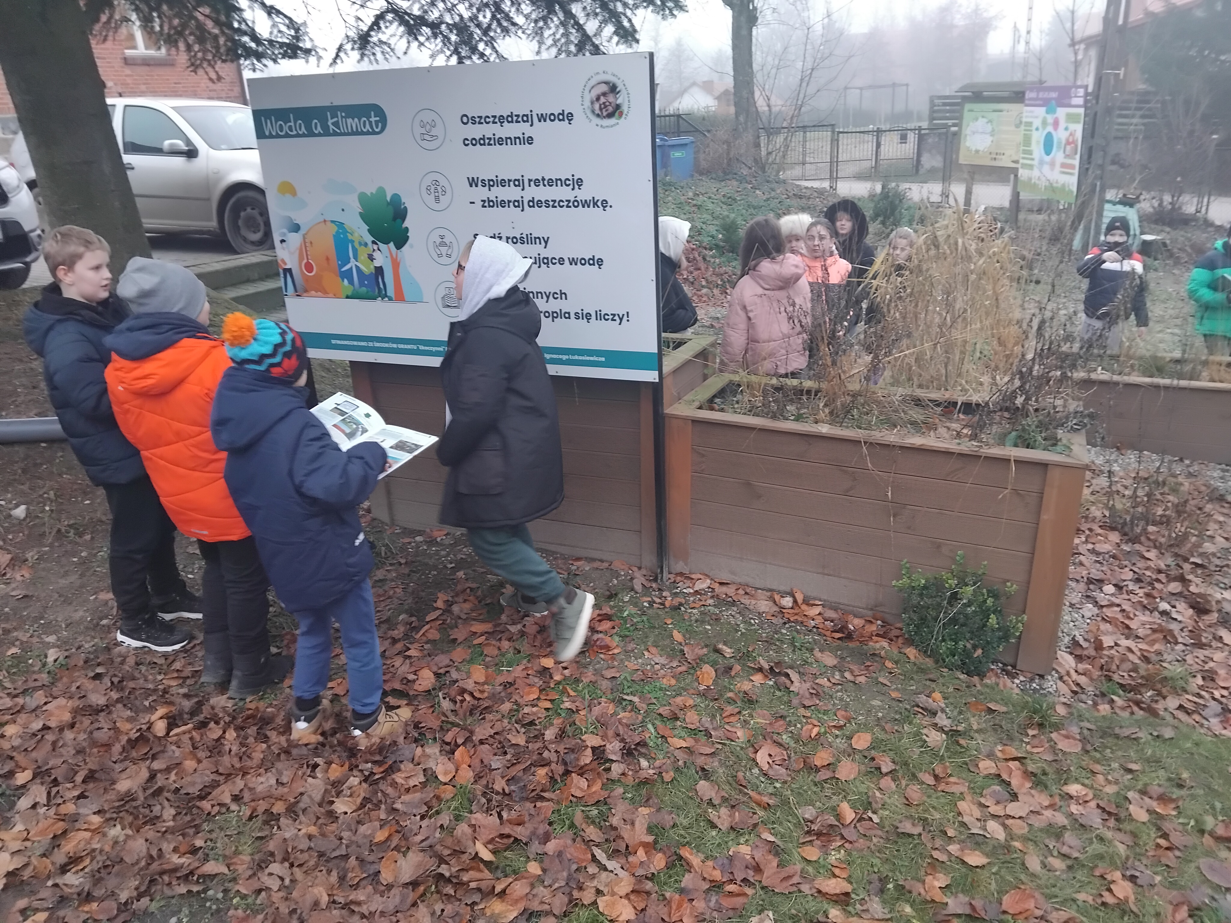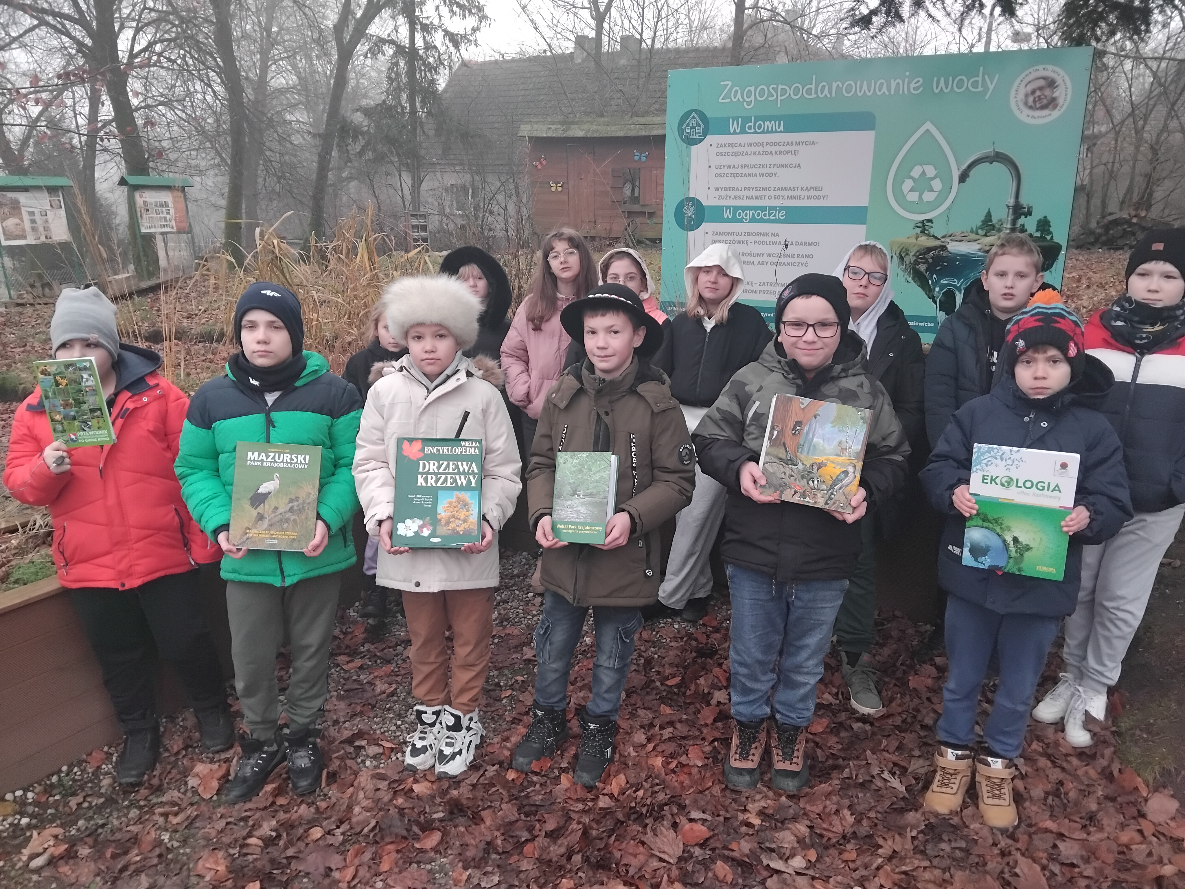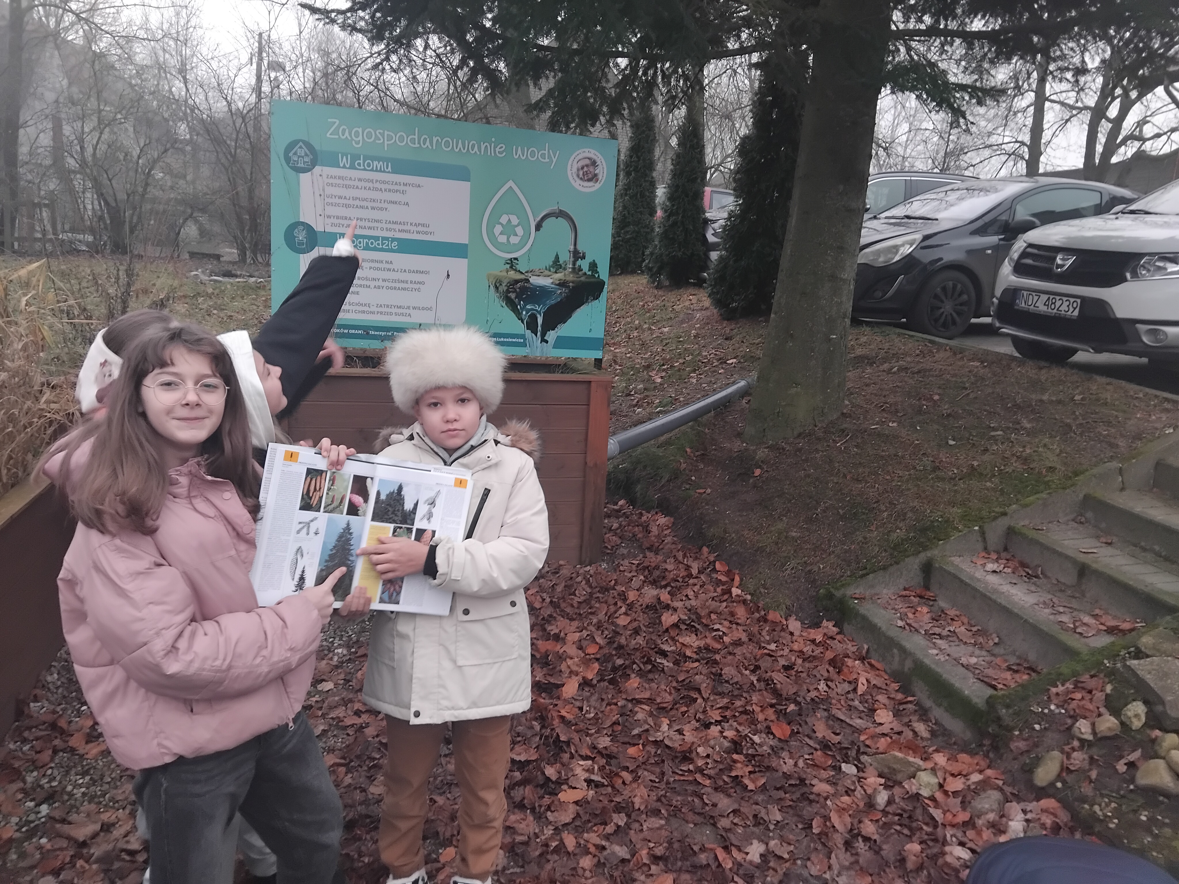15grudnia 2025r. uczniowie klasy 4 Szkoły Podstawowej Im. Ks. Jana Twardowskiego uczestniczyli w niezwykłej lekcji bibliotecznej. Po wyszukaniu i wybraniu w bibliotece szkolnej odpowiedniej literatury w postaci atlasów, słowników, czasopism oraz broszur udali się do ogrodu deszczowego, aby rozpocząć przygodę z poszukiwaniem i rozpoznawaniem gatunków roślin których obszarem występowania są mokradła oraz rozlewiska. Uczniowie z tablic edukacyjnych dowiedzieli się czym jest ogród dydaktyczny oraz jak funkcjonuje obieg wody w przyrodzie.