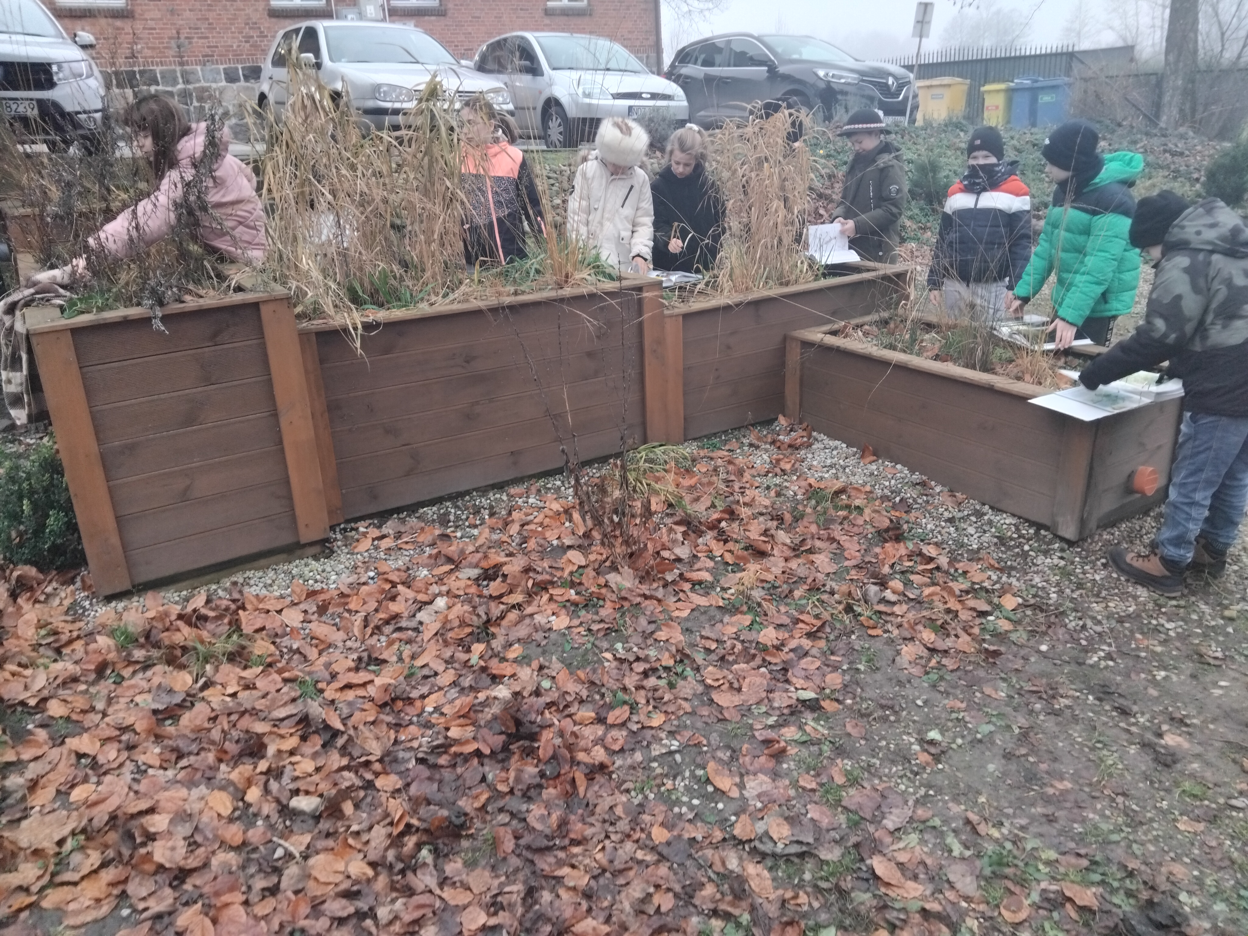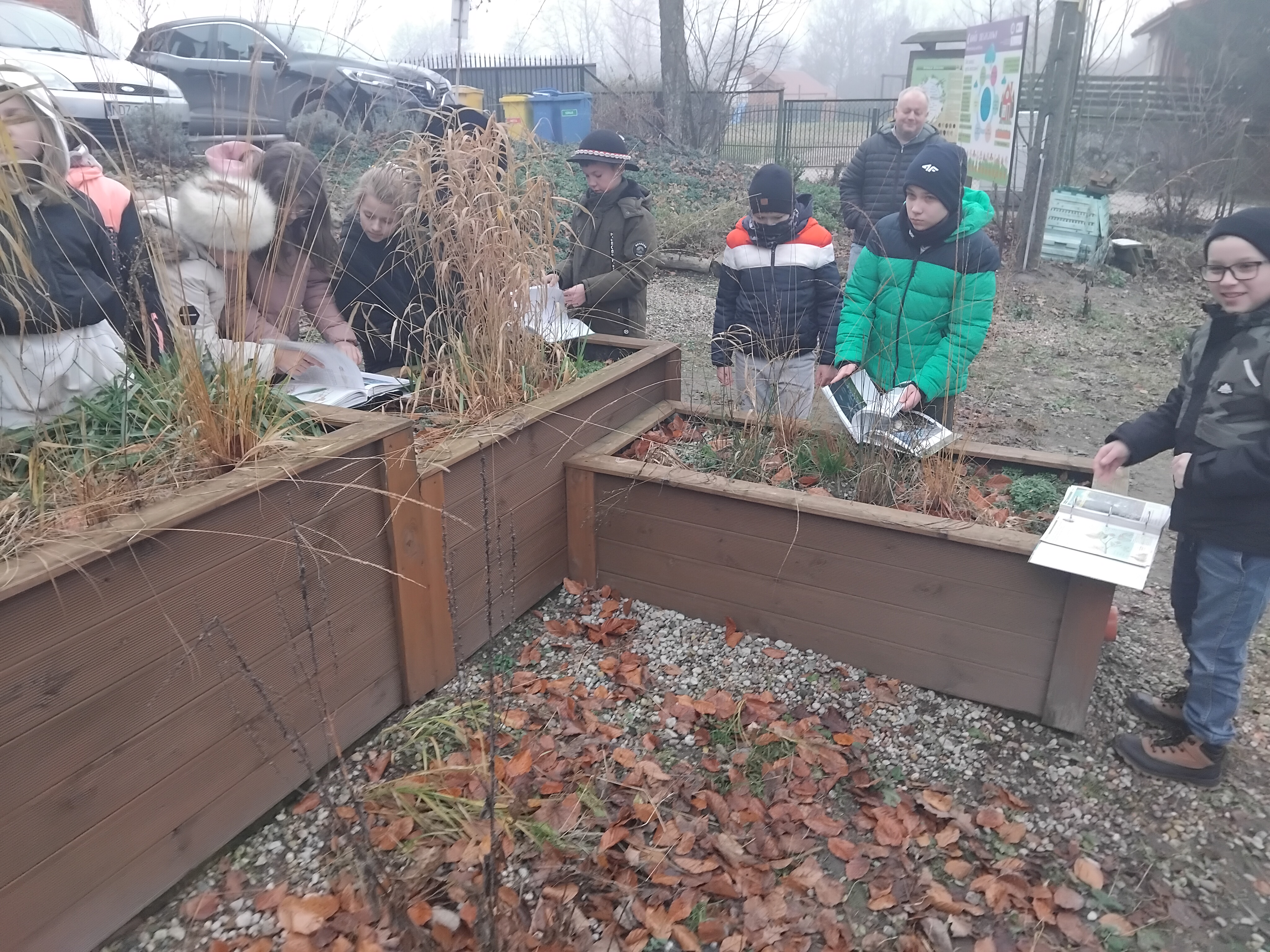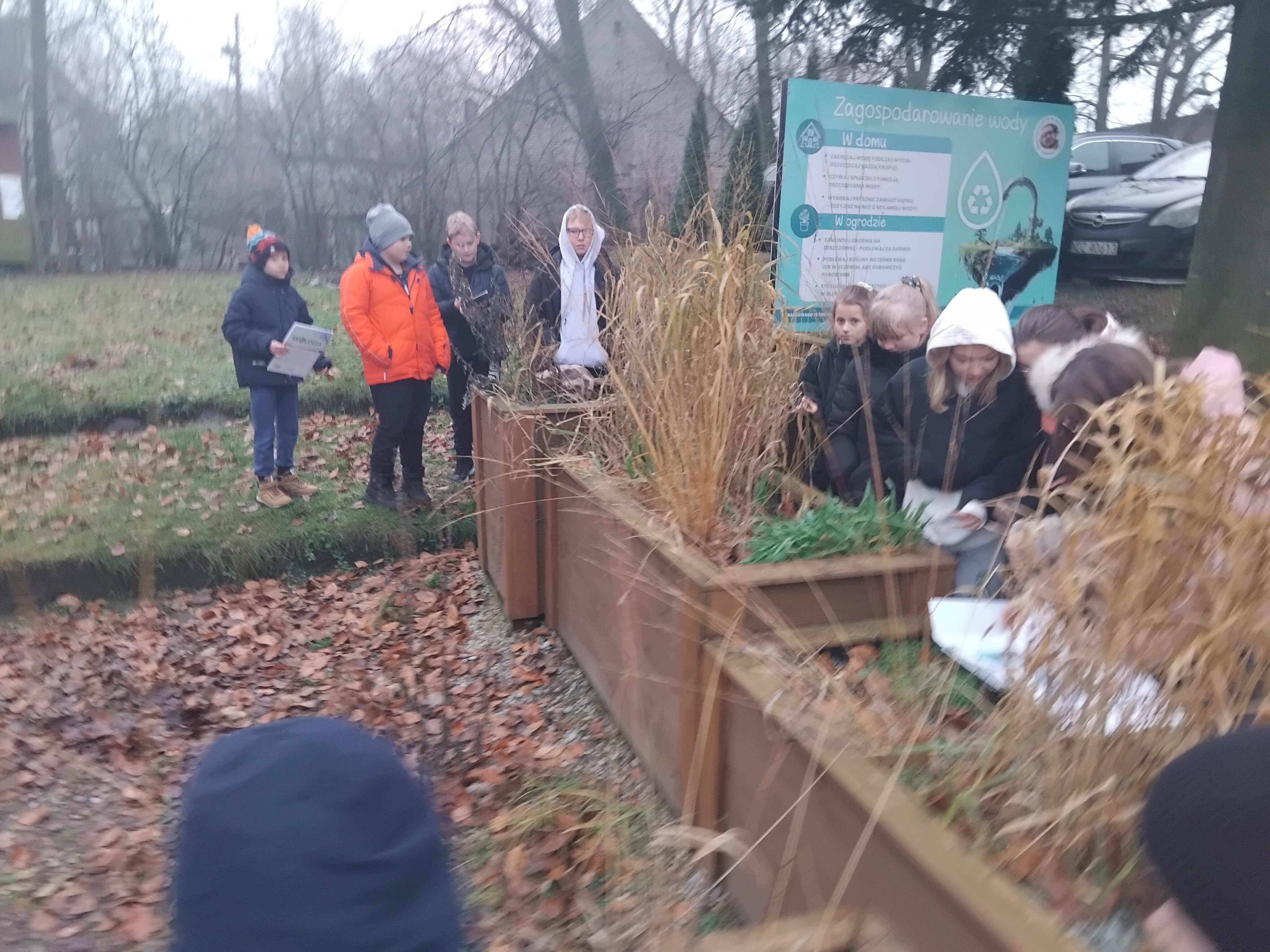 15grudnia 2025r. uczniowie klasy 4 Szkoły Podstawowej Im. Ks. Jana Twardowskiego uczestniczyli w niezwykłej lekcji bibliotecznej. Po wyszukaniu i wybraniu w bibliotece szkolnej odpowiedniej literatury w postaci atlasów, słowników, czasopism oraz broszur udali się do ogrodu deszczowego, aby rozpocząć przygodę z poszukiwaniem i rozpoznawaniem gatunków roślin których obszarem występowania są mokradła oraz rozlewiska. Uczniowie z tablic edukacyjnych dowiedzieli się czym jest ogród dydaktyczny oraz jak funkcjonuje obieg wody w przyrodzie.