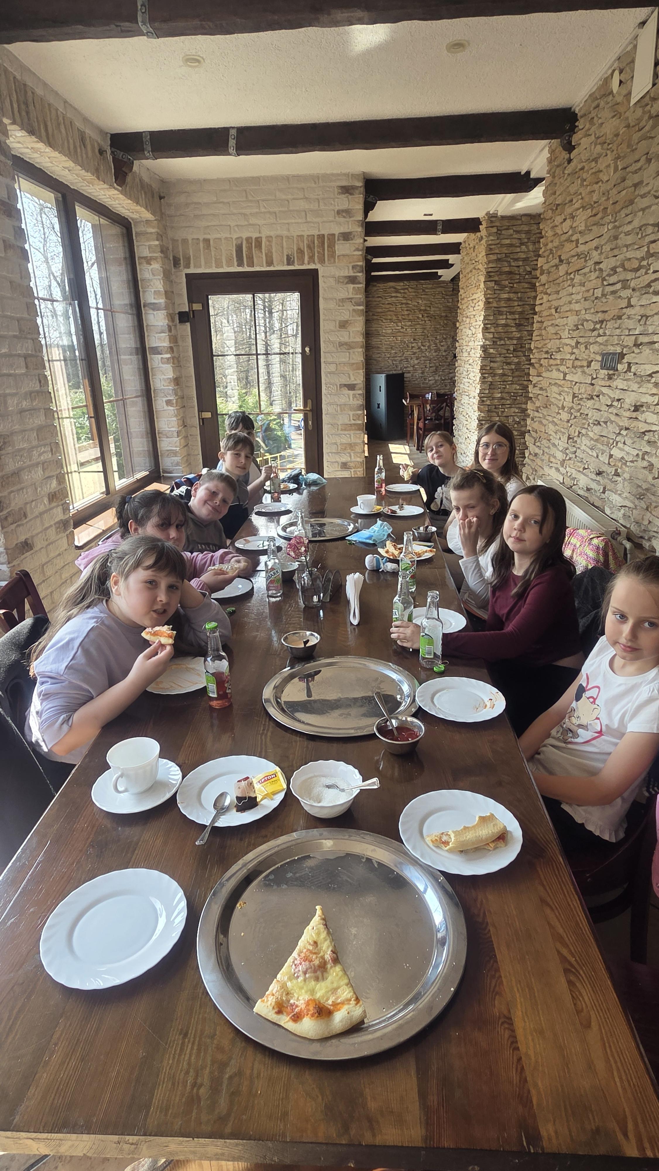 Na zakończenie pełnego wrażeń dnia cała grupa udała się do restauracji Jezioranka, gdzie na dzieci czekała pyszna pizza. Był to doskonały moment na wspólne rozmowy i podsumowanie zdobytych doświadczeń. To była niezwykle wartościowa i inspirująca wyprawa, która nie tylko poszerzyła wiedzę uczniów, ale także dostarczyła im wielu radosnych chwil. Serdeczne podziękowania kierujemy do Pani Oli i Pani Julity oraz wszystkich zaangażowanych osób odpowiedzialnych za przeprowadzenie ciekawych zajęć, a także za przekazane upominki, które sprawiły nam ogromną radość. Dzięki życzliwości, zaangażowaniu i otwartości Pań uczniowie mogli przeżyć wyjątkowy dzień pełen odkryć i inspiracji.