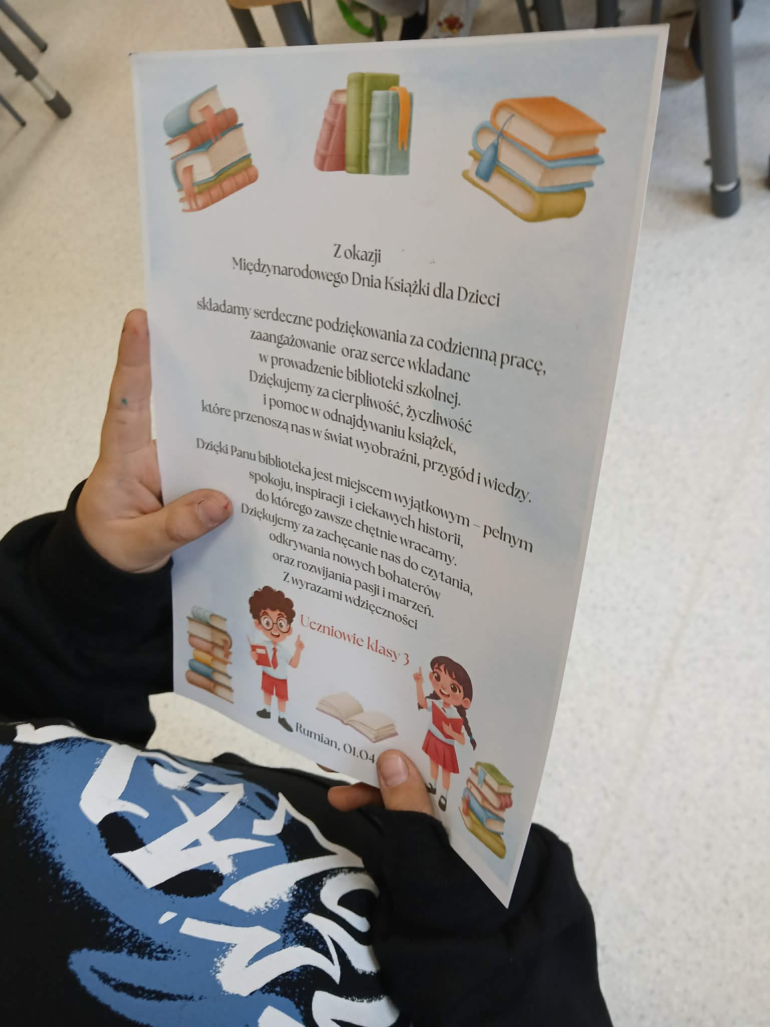 Uczniowie klasy trzeciej z radością uczcili Międzynarodowy Dzień Książki dla Dzieci, uczestnicząc w zajęciach i wizycie w szkolnej bibliotece. Celem tych zajęć było wspieranie czytelnictwa wśród uczniów i zachęcanie ich do codziennego sięgania po książki.