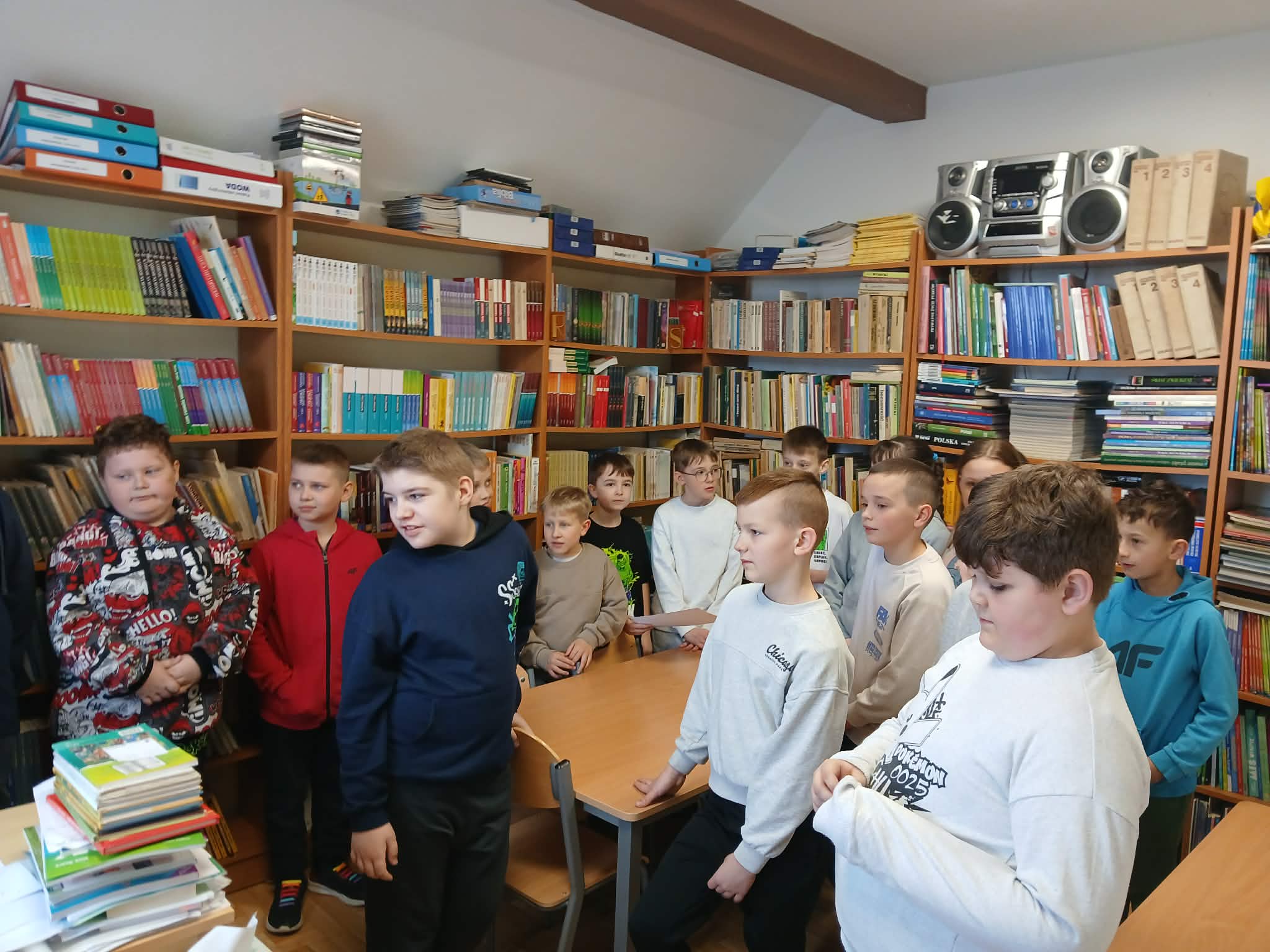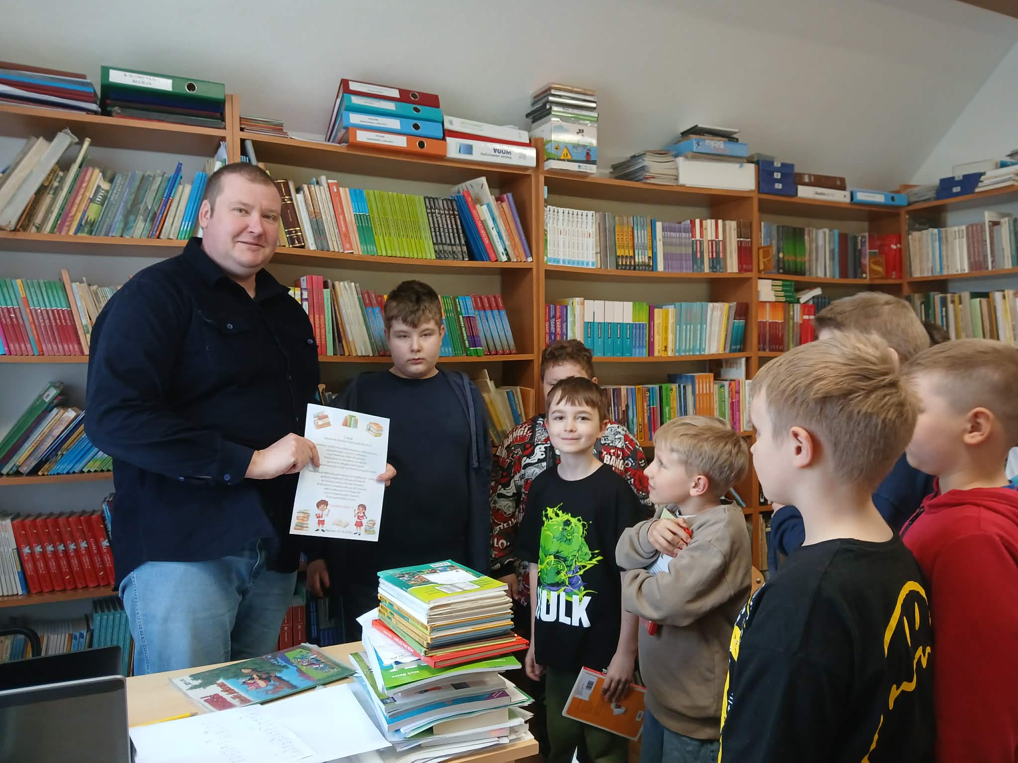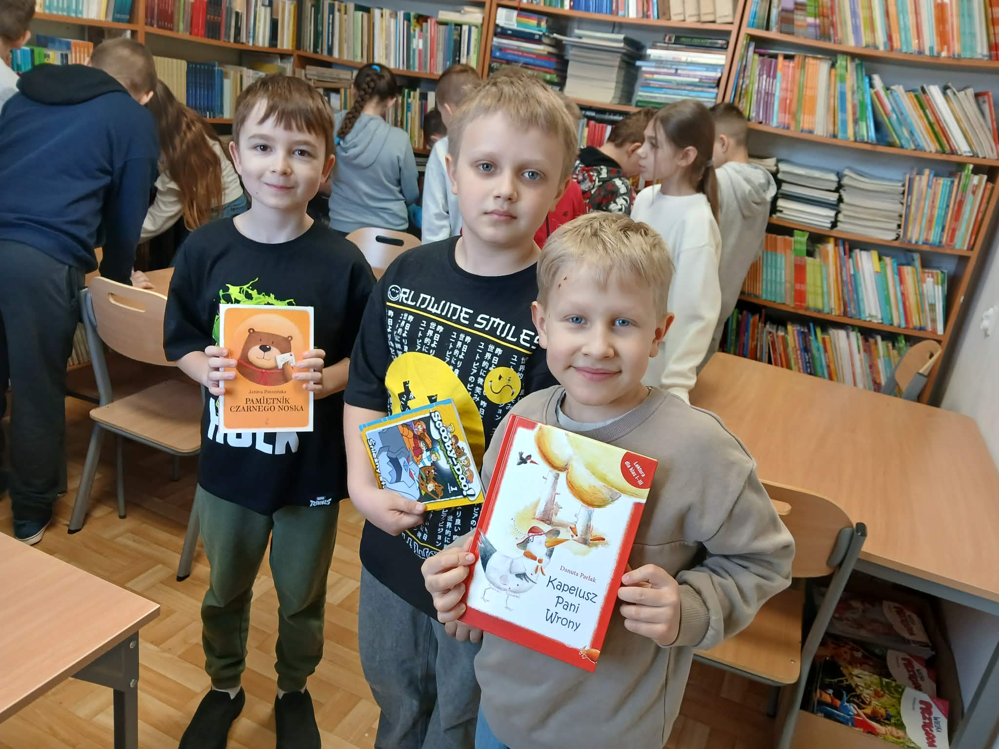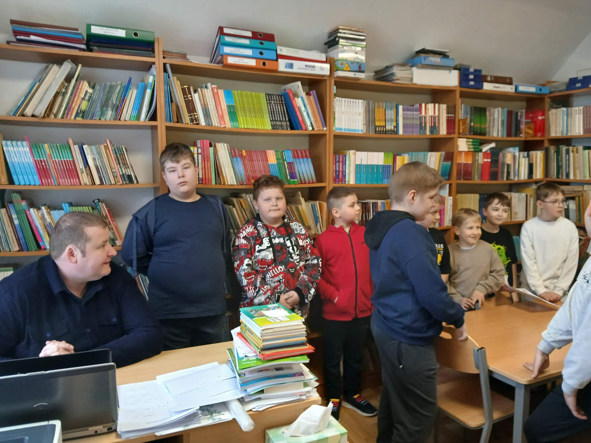 Następnie uczniowie udali się do biblioteki szkolnej, gdzie mogli zapoznać się z bogatym księgozbiorem oraz wypożyczyć wybrane pozycje do czytania w domu. Spotkanie odbyło się w miłej i przyjaznej atmosferze, a dzieci złożyły serdeczne podziękowania panu bibliotekarzowi za przygotowanie zajęć i zachęcanie do odkrywania nowych światów dzięki książkom.