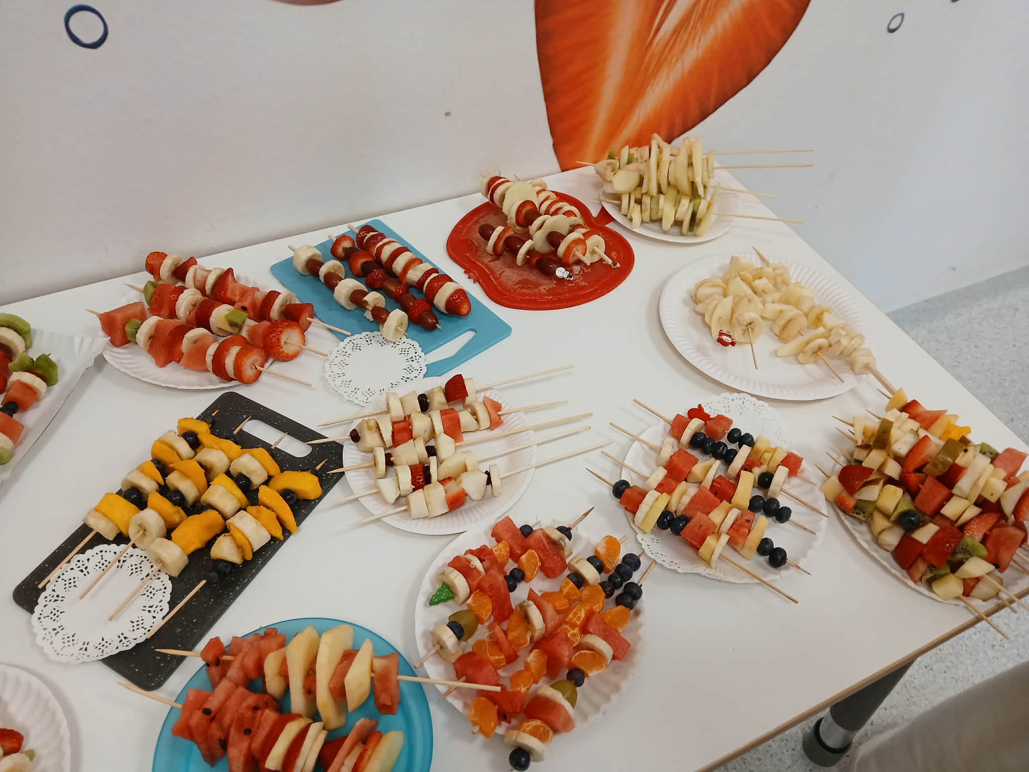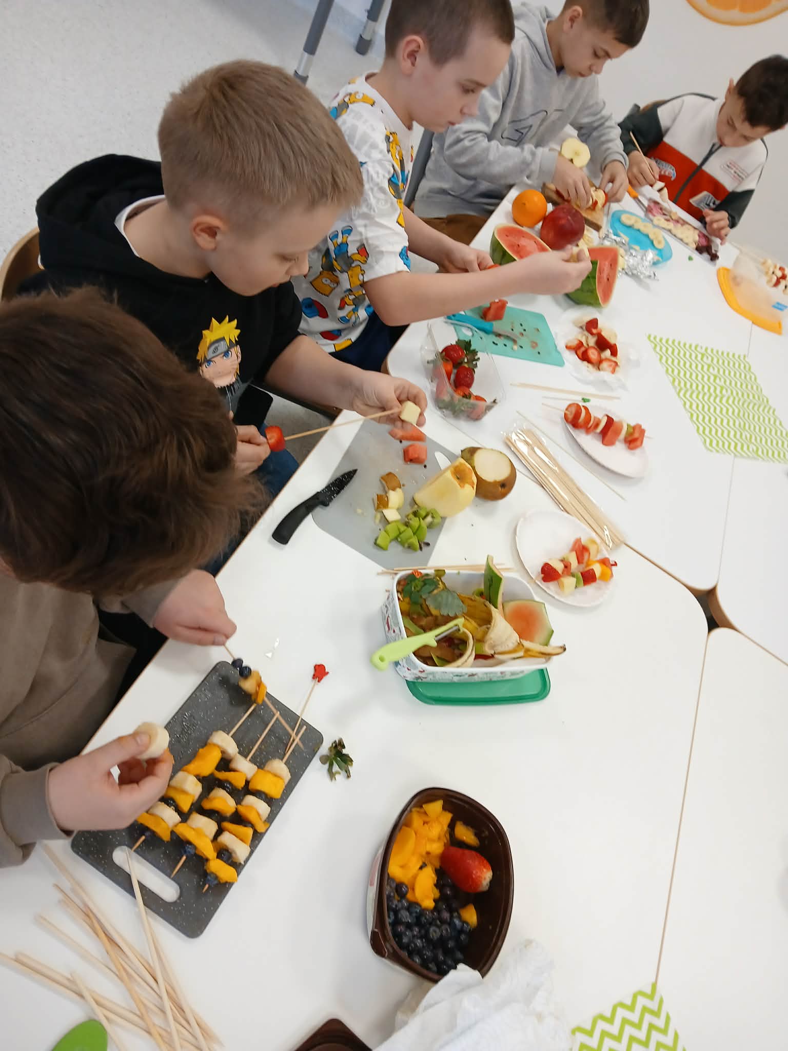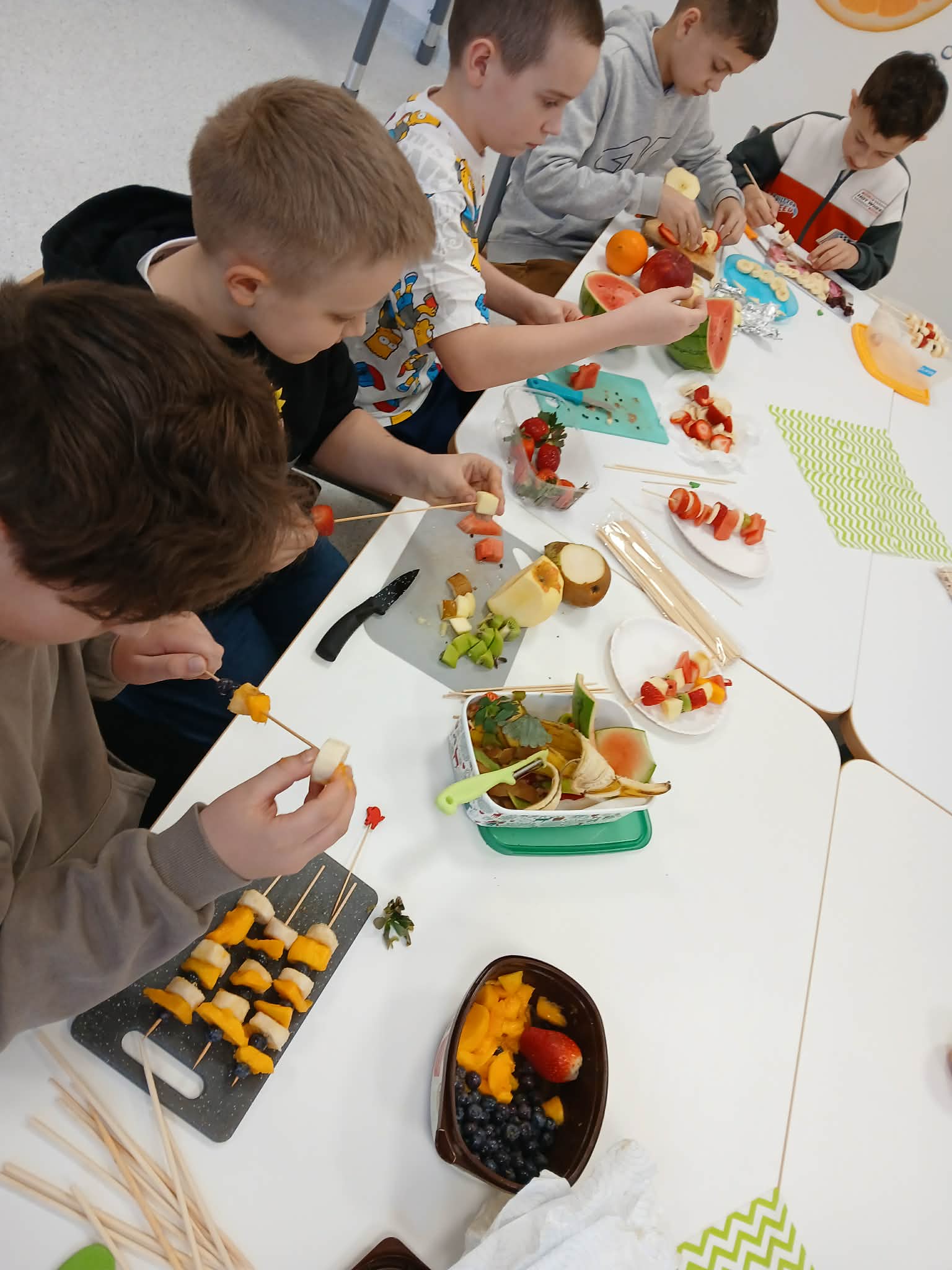 Dziś odbyły się bardzo ciekawe i smaczne zajęcia w klasie 3. Uczniowie przygotowywali kolorowe owocowe szaszłyki. Na stołach pojawiły się różne owoce, między innymi winogrona, banany, jabłka i mandarynki. Uczniowie z dużym zaangażowaniem kroili owoce i nadziewali je na patyczki, tworząc piękne i apetyczne kompozycje.