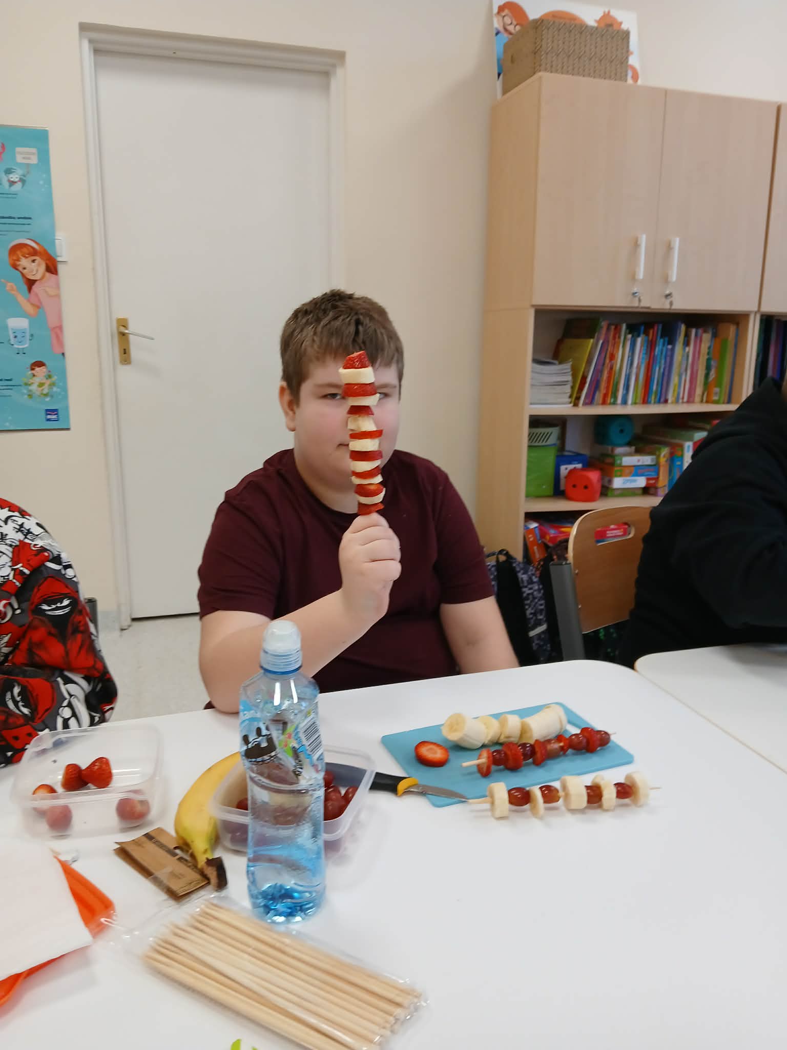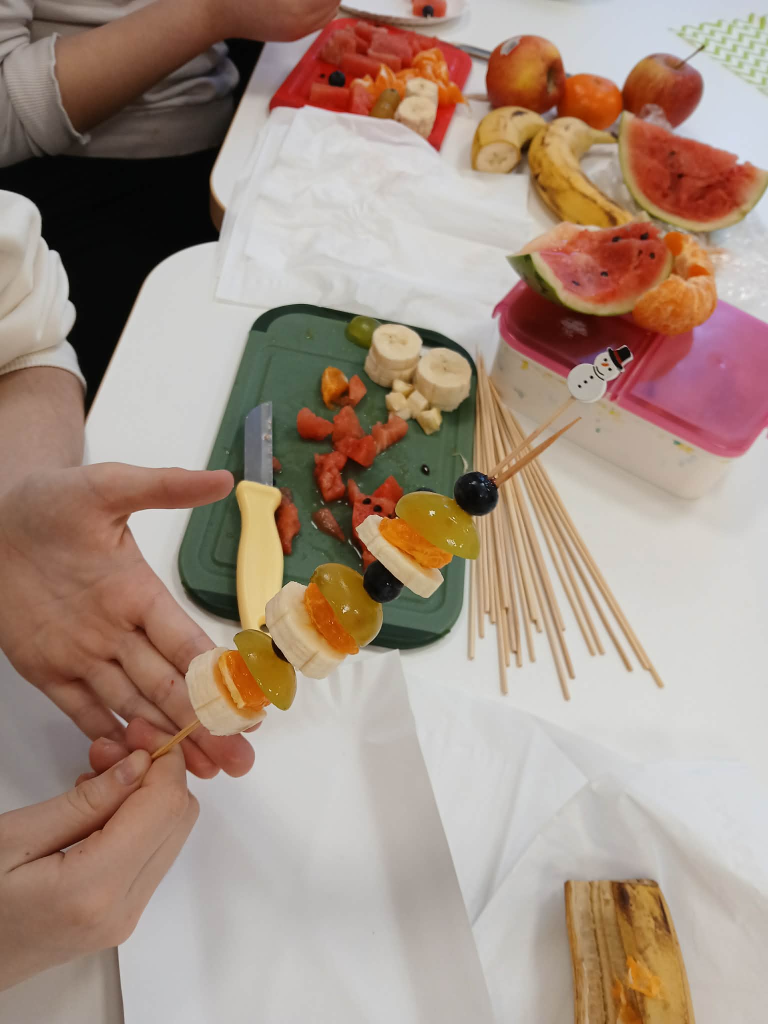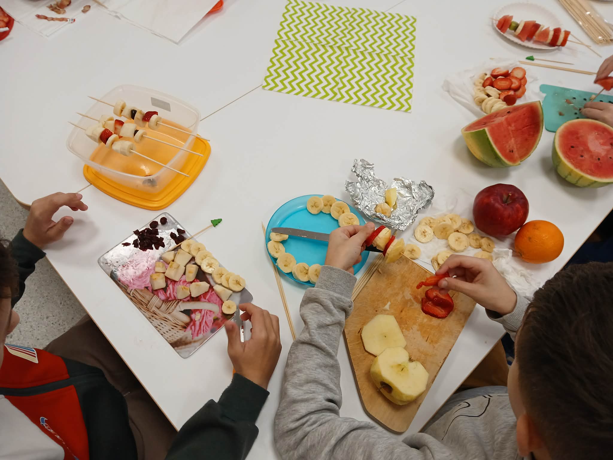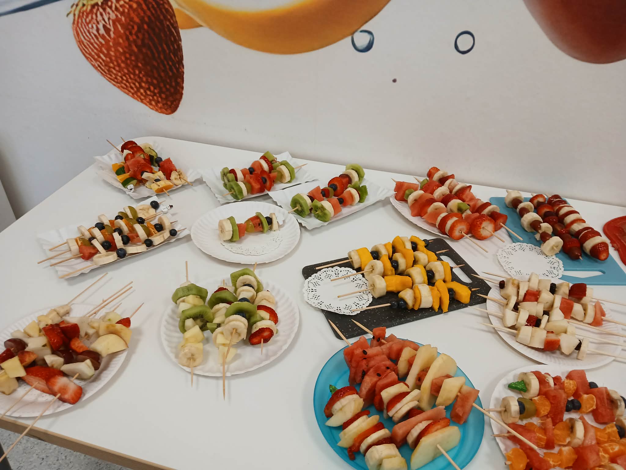 Dziś odbyły się bardzo ciekawe i smaczne zajęcia w klasie 3. Uczniowie przygotowywali kolorowe owocowe szaszłyki. Na stołach pojawiły się różne owoce, między innymi winogrona, banany, jabłka i mandarynki. Uczniowie z dużym zaangażowaniem kroili owoce i nadziewali je na patyczki, tworząc piękne i apetyczne kompozycje.