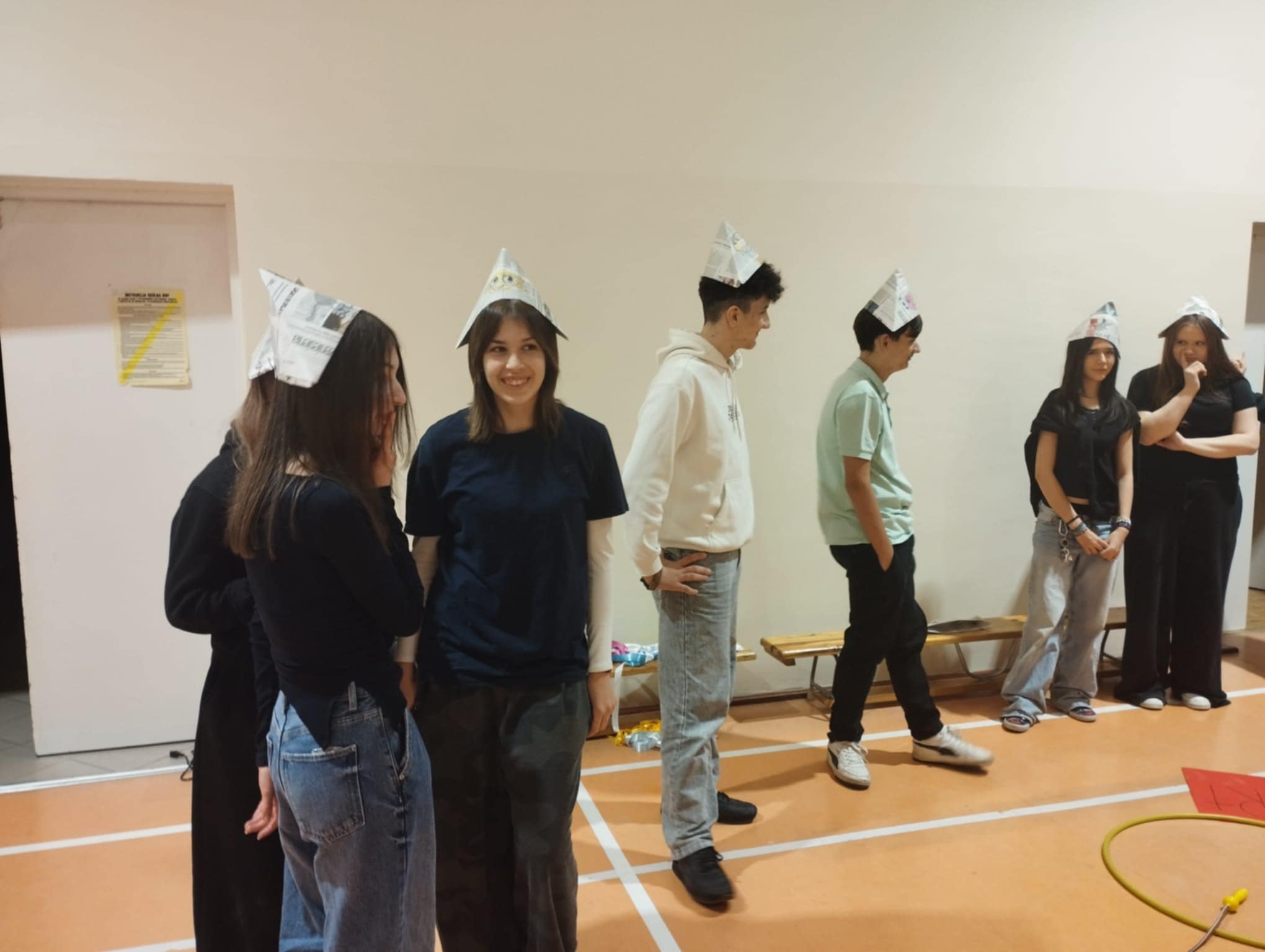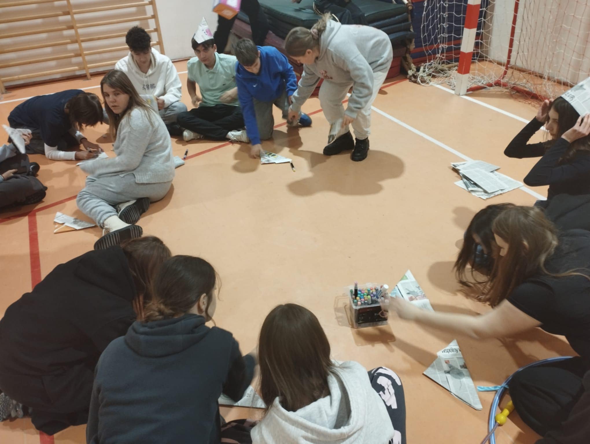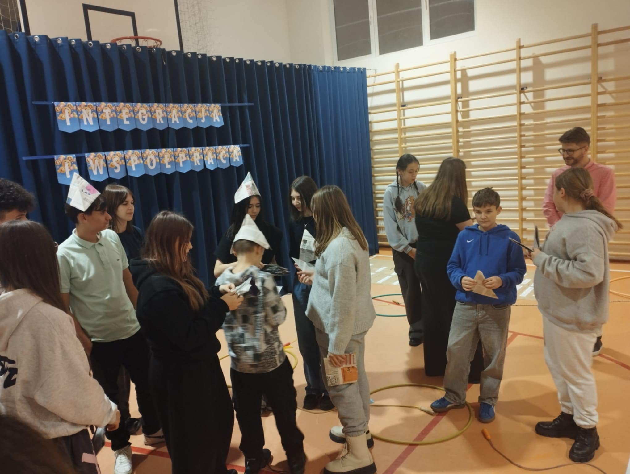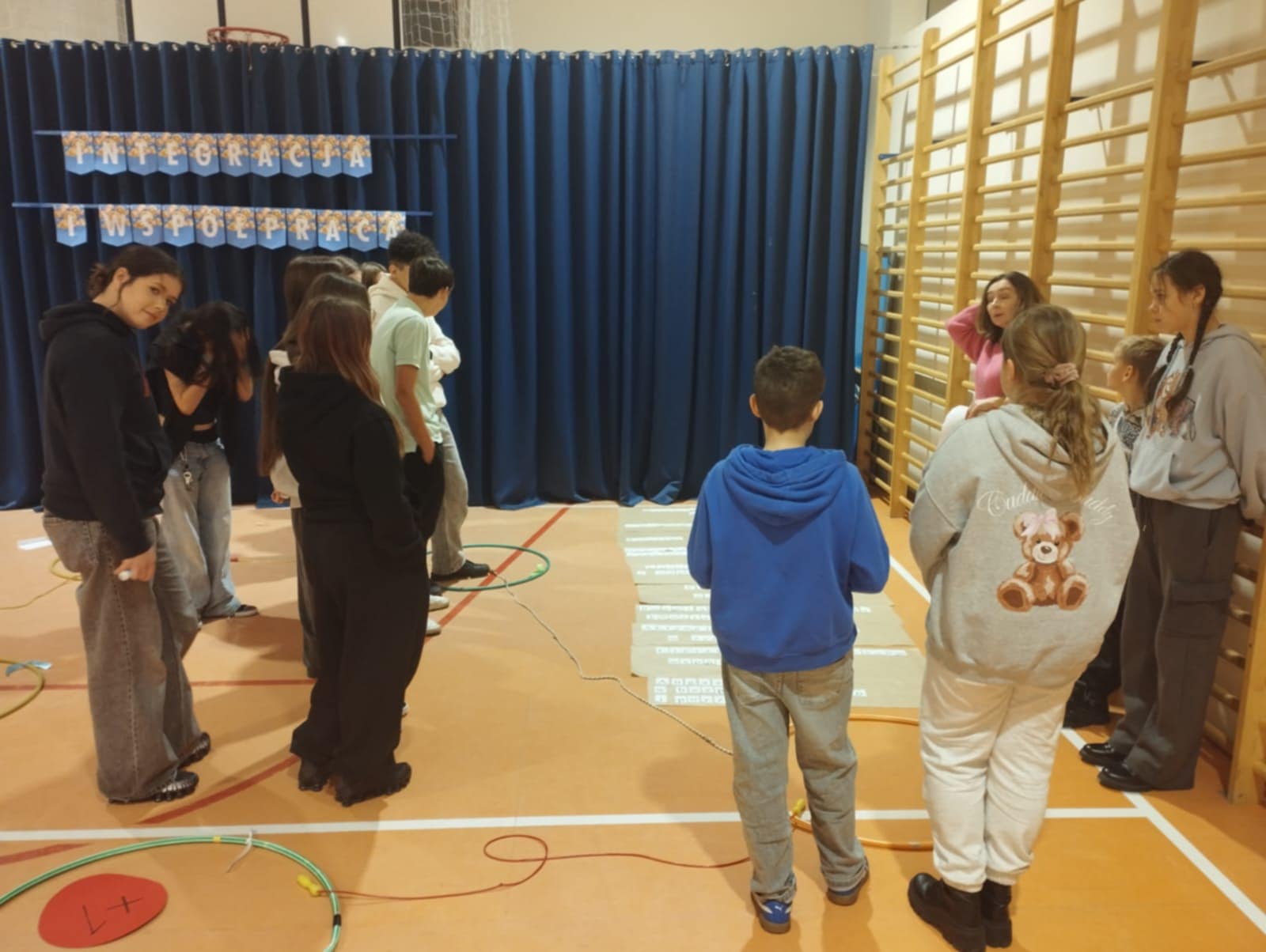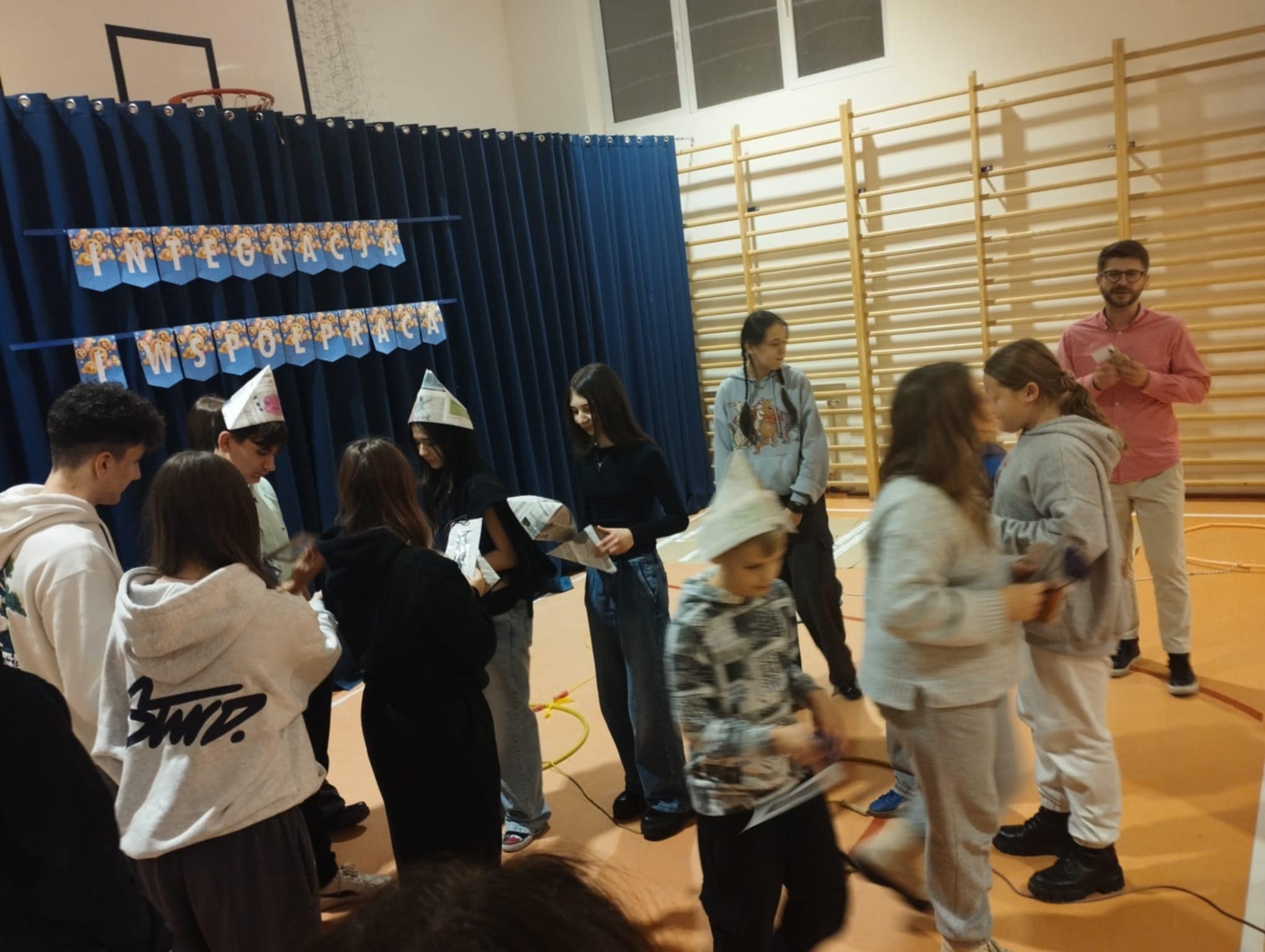 Po krótkim poczęstunku przyszedł czas na zabawy integracyjne w sali gimnastycznej. Uczniowie szybko złapali wspólny język, poznawali się i „budowali mosty”, tworząc zadania wymagające współpracy. Atmosfera była bardzo swobodna, a młodzież chętnie dzieliła się swoimi pomysłami i doświadczeniami.