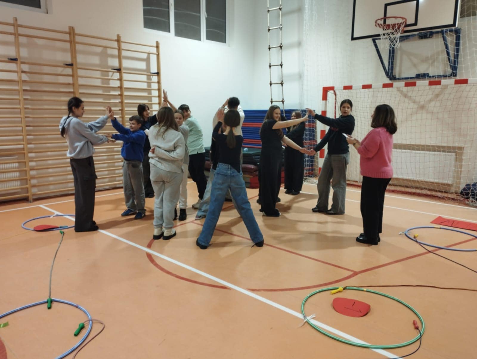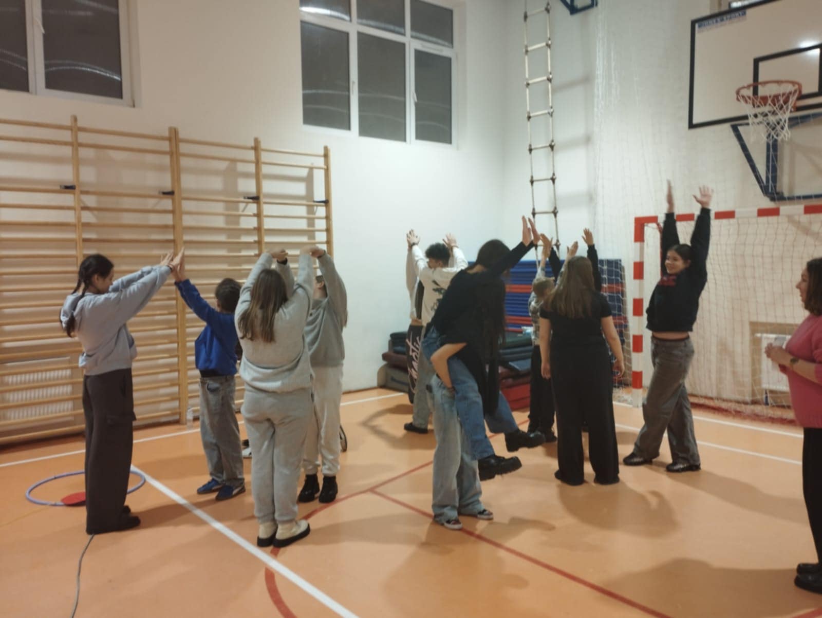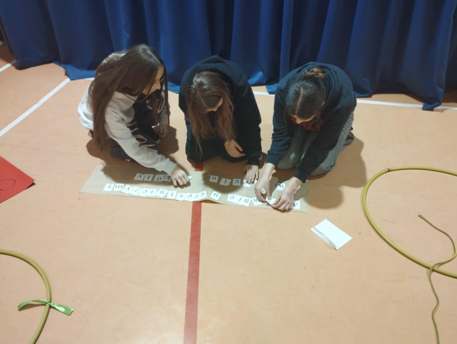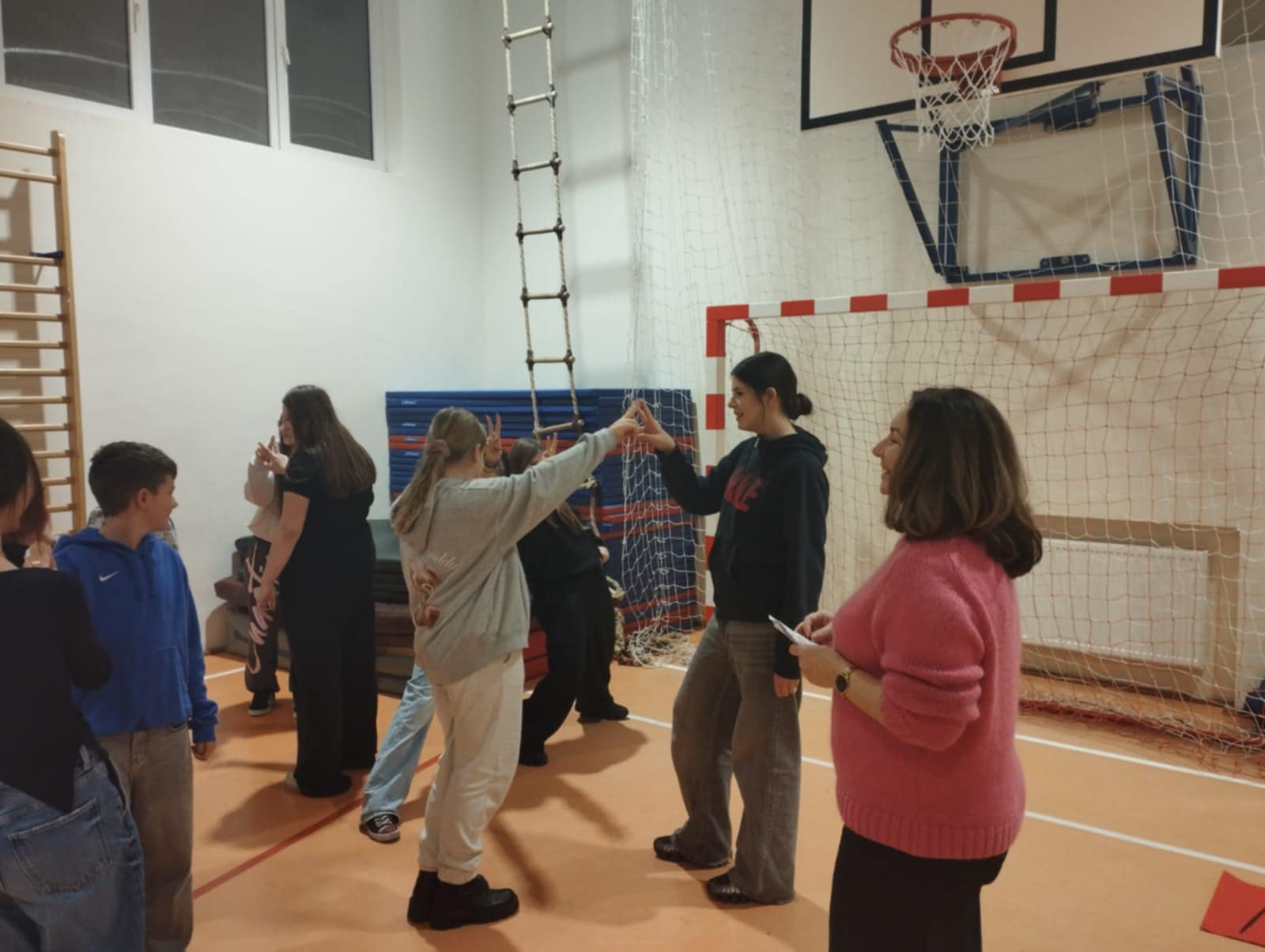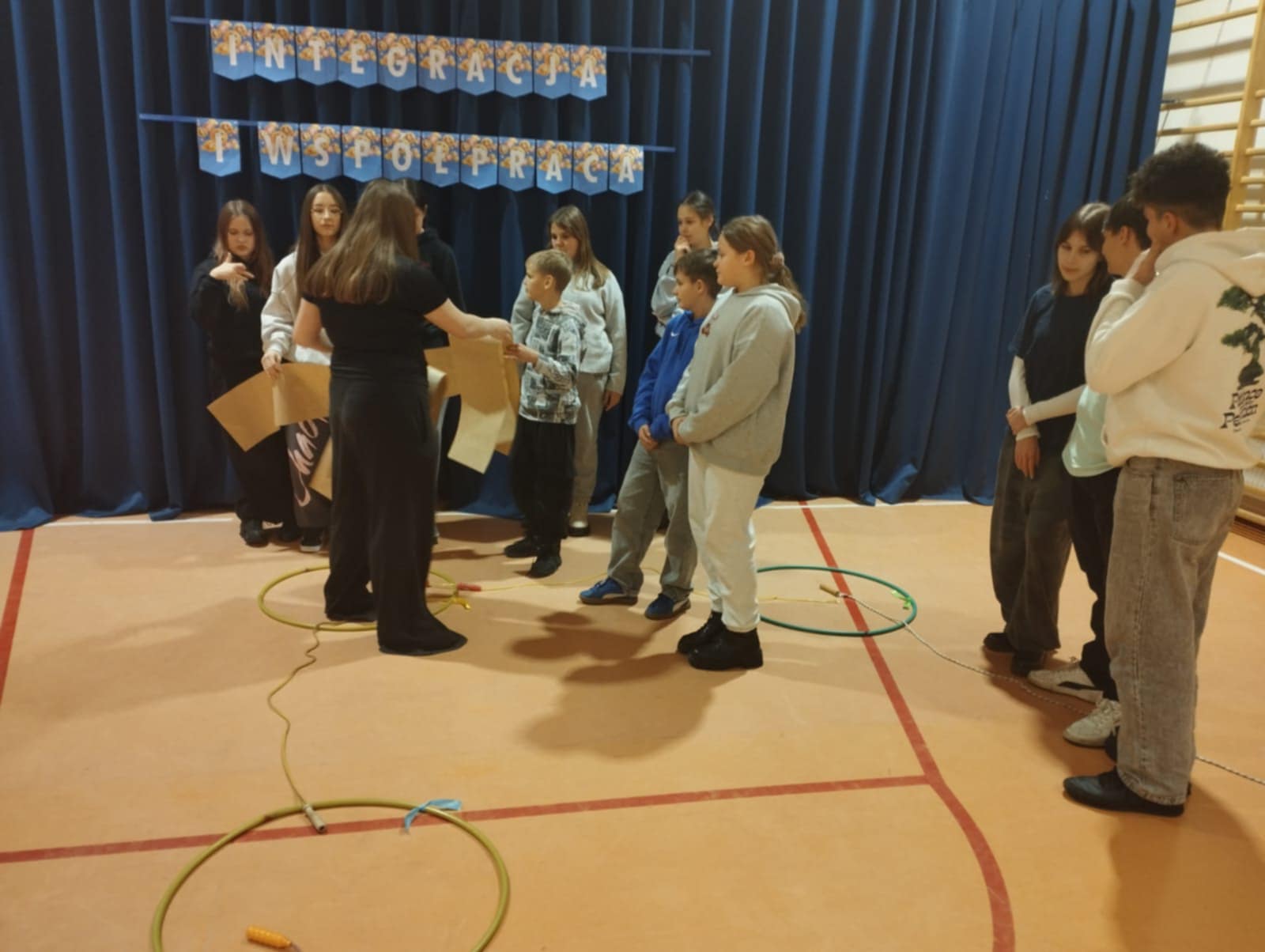 Po krótkim poczęstunku przyszedł czas na zabawy integracyjne w sali gimnastycznej. Uczniowie szybko złapali wspólny język, poznawali się i „budowali mosty”, tworząc zadania wymagające współpracy. Atmosfera była bardzo swobodna, a młodzież chętnie dzieliła się swoimi pomysłami i doświadczeniami.
