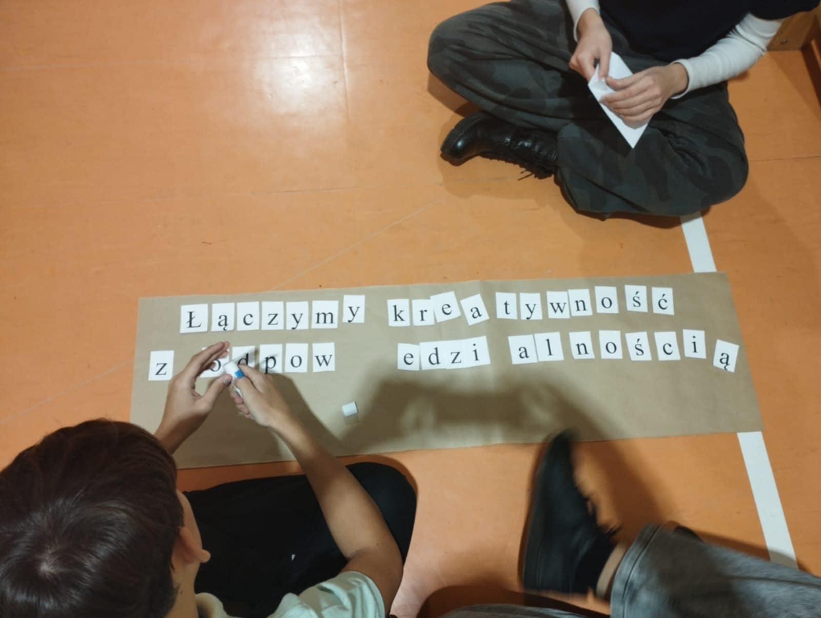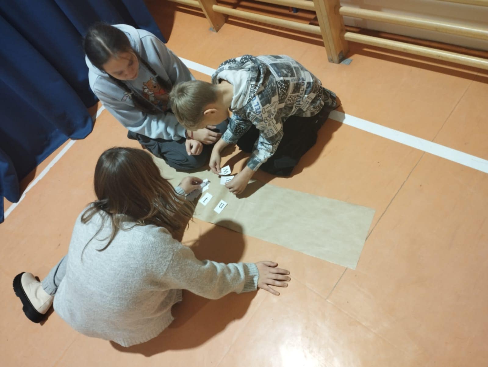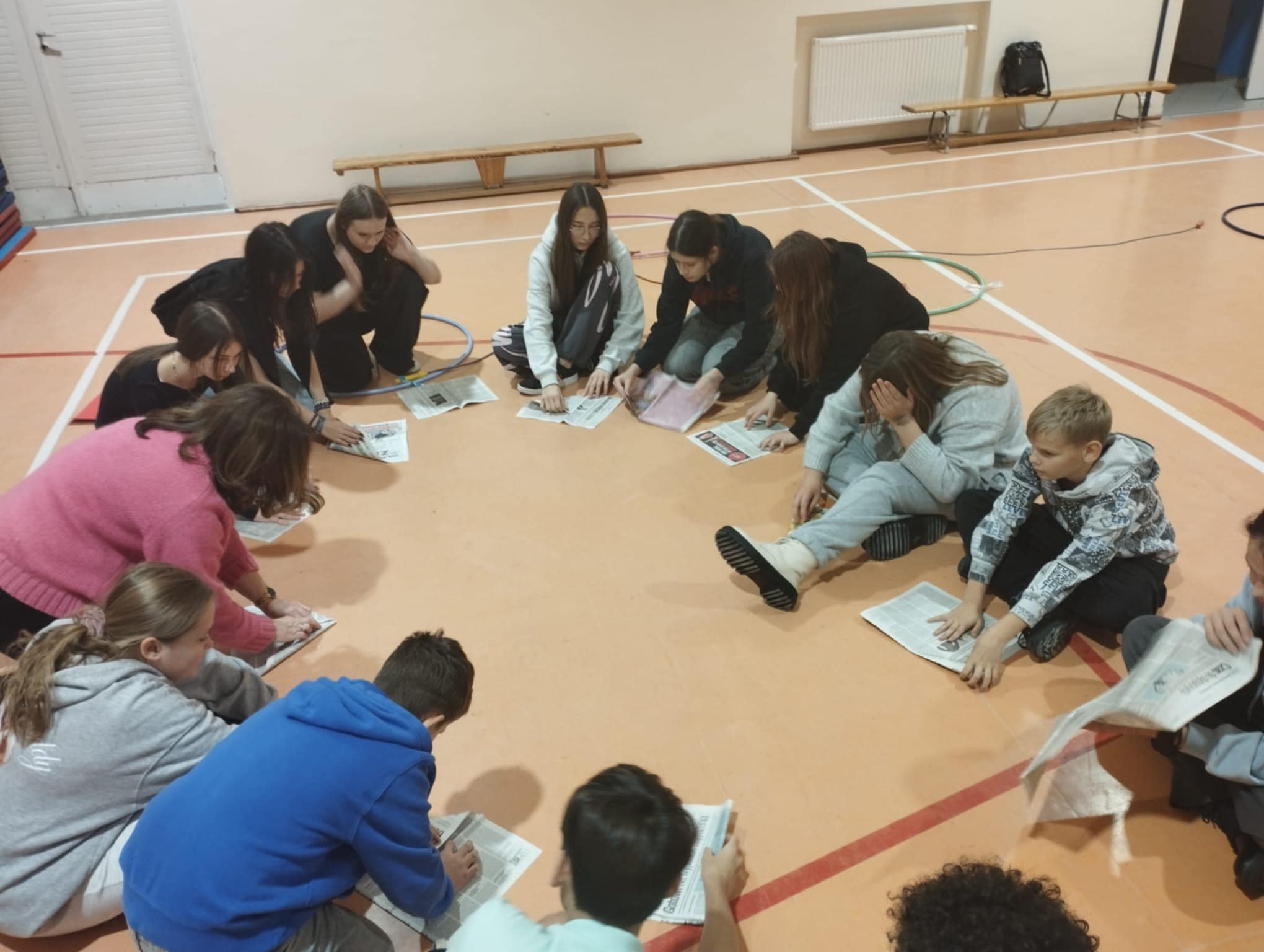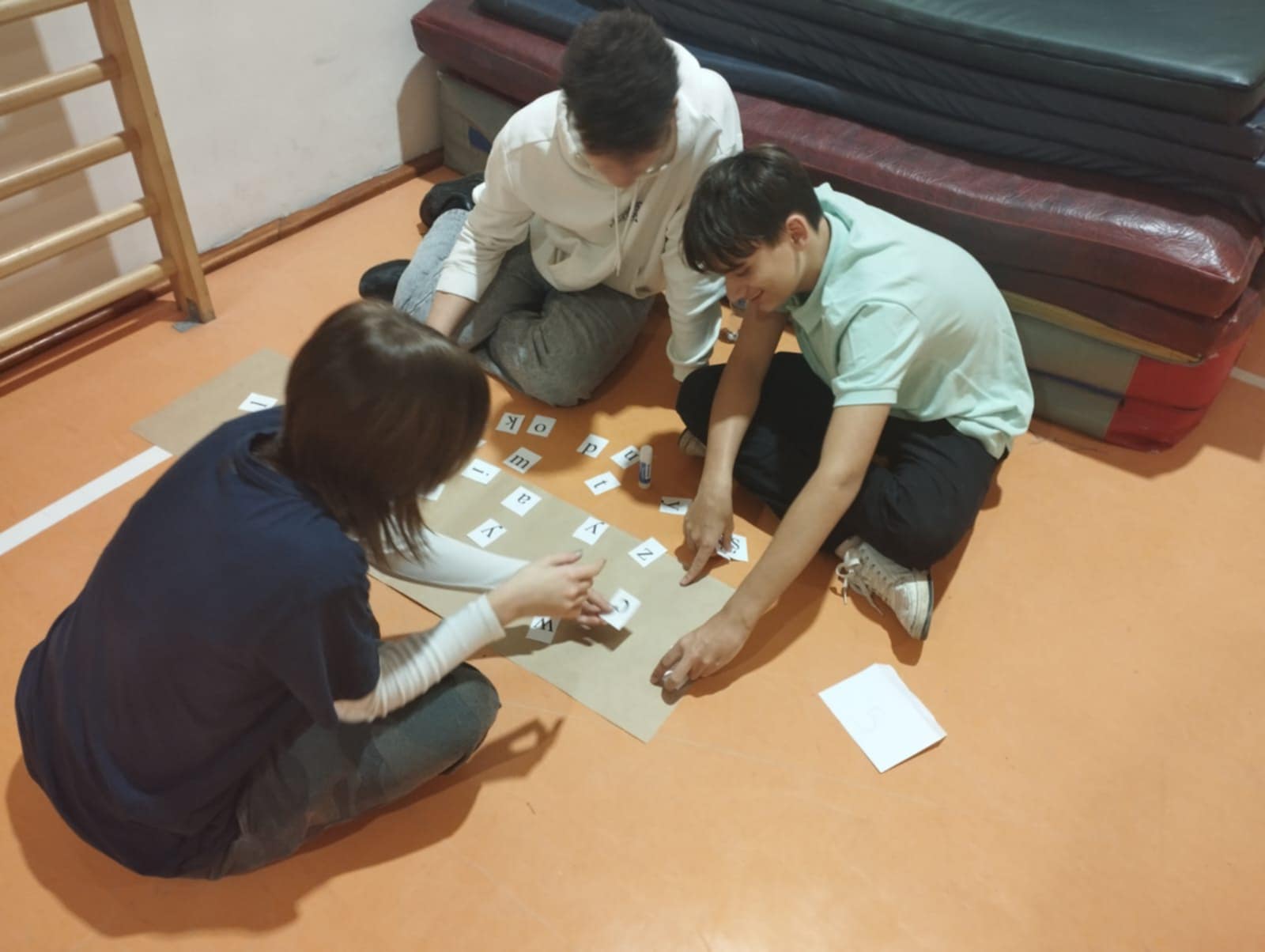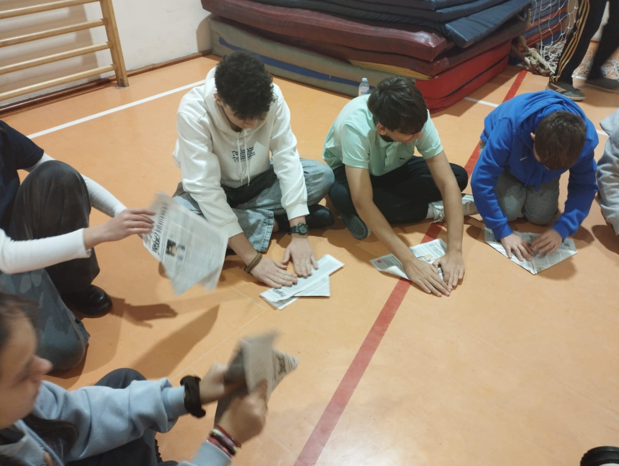 Po krótkim poczęstunku przyszedł czas na zabawy integracyjne w sali gimnastycznej. Uczniowie szybko złapali wspólny język, poznawali się i „budowali mosty”, tworząc zadania wymagające współpracy. Atmosfera była bardzo swobodna, a młodzież chętnie dzieliła się swoimi pomysłami i doświadczeniami.
