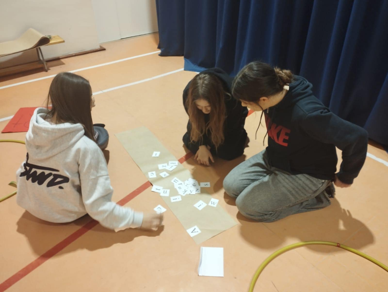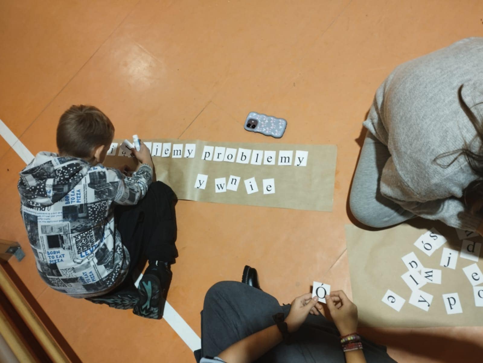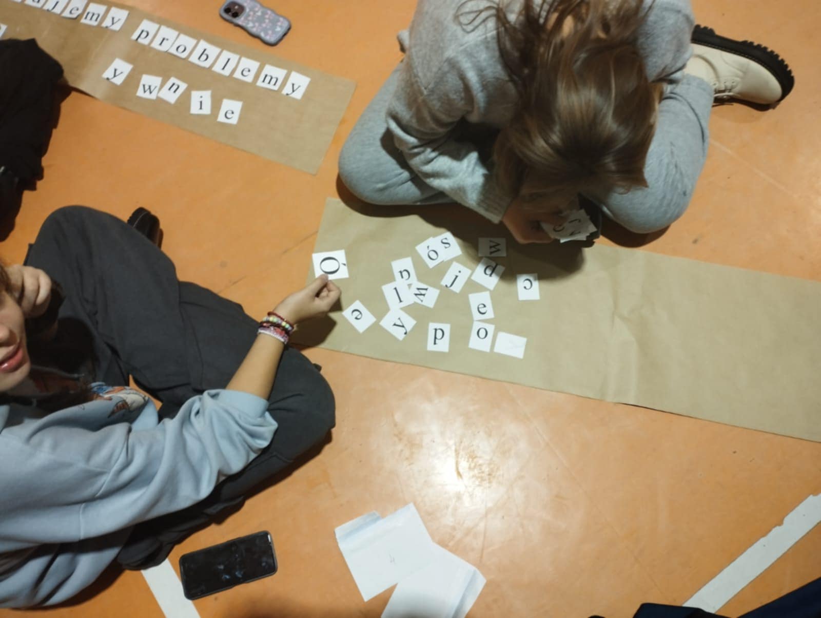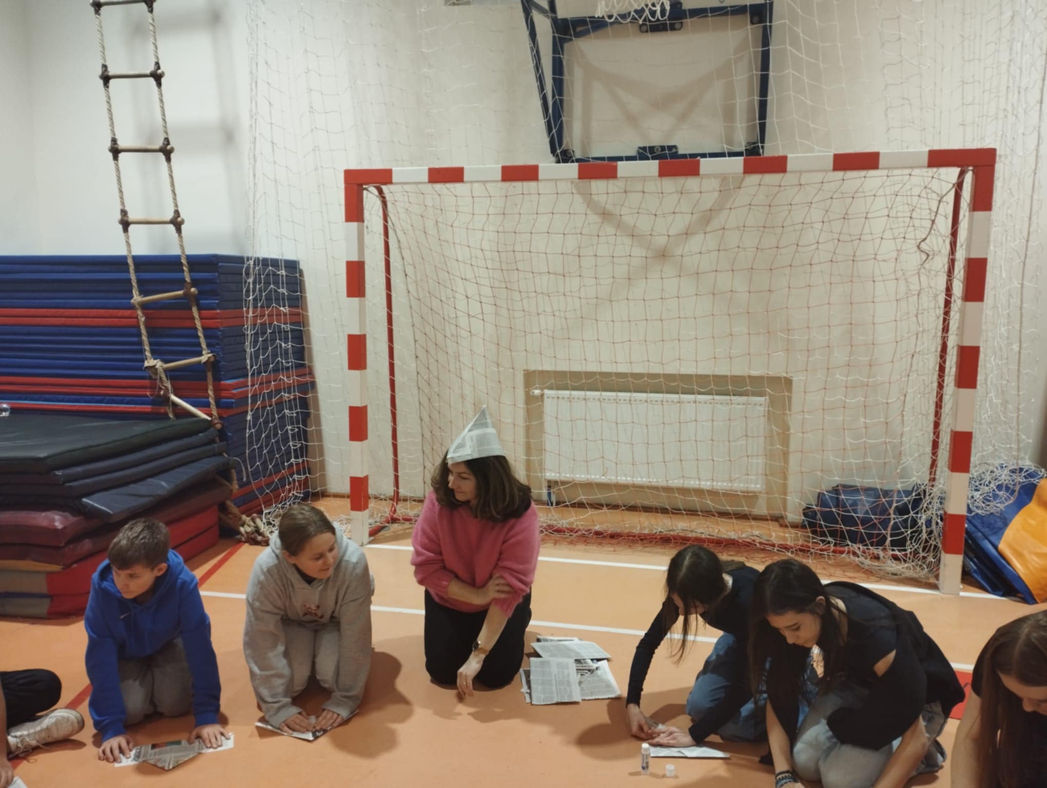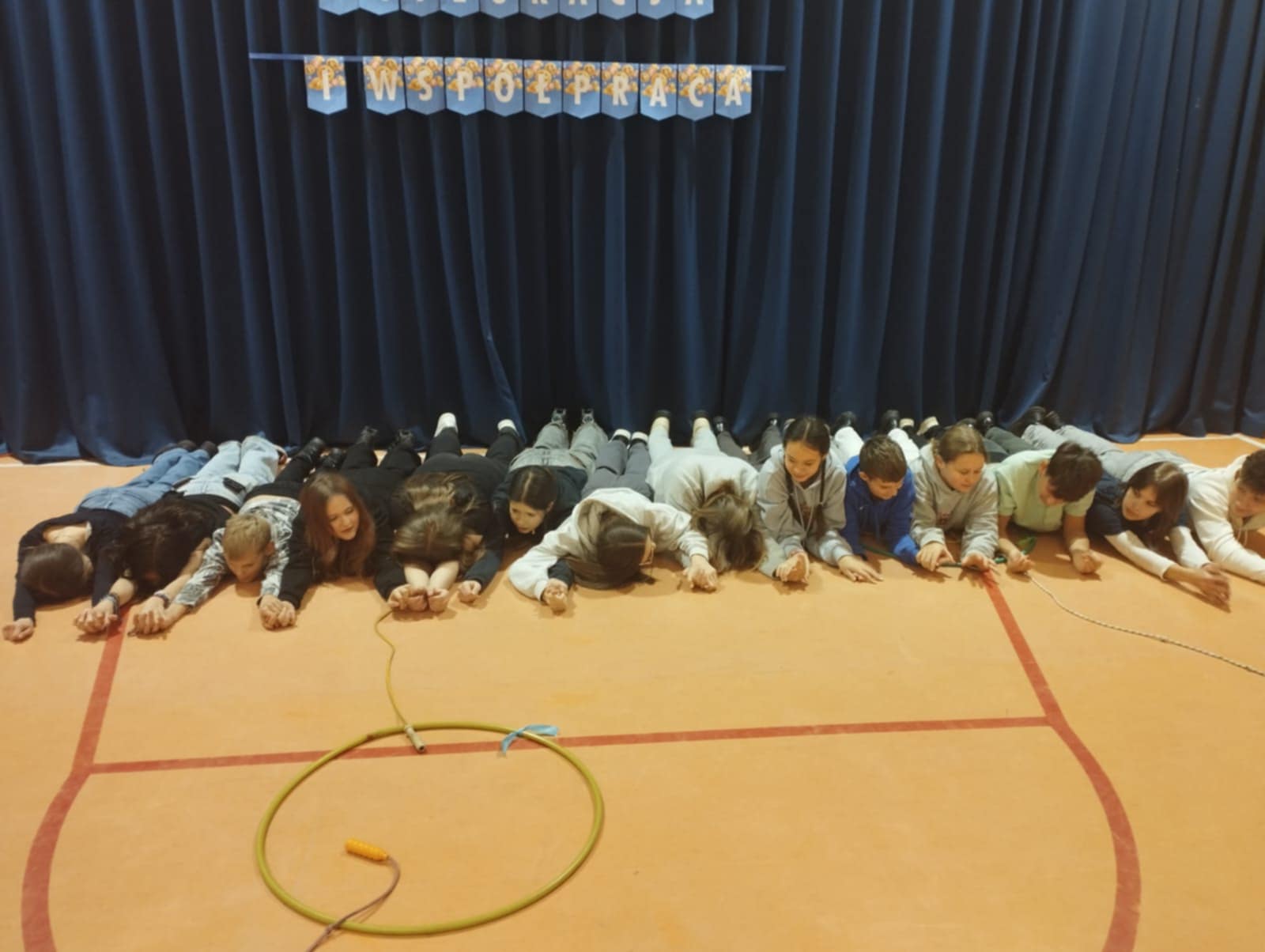 Po krótkim poczęstunku przyszedł czas na zabawy integracyjne w sali gimnastycznej. Uczniowie szybko złapali wspólny język, poznawali się i „budowali mosty”, tworząc zadania wymagające współpracy. Atmosfera była bardzo swobodna, a młodzież chętnie dzieliła się swoimi pomysłami i doświadczeniami.