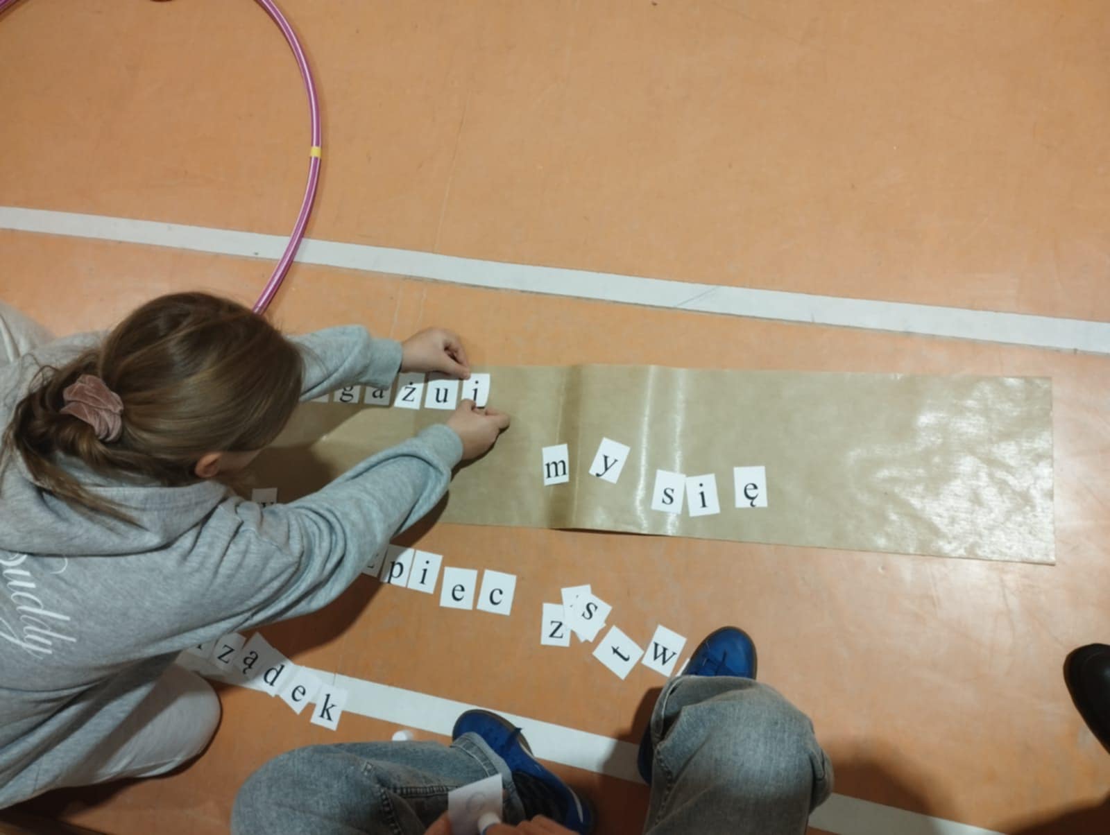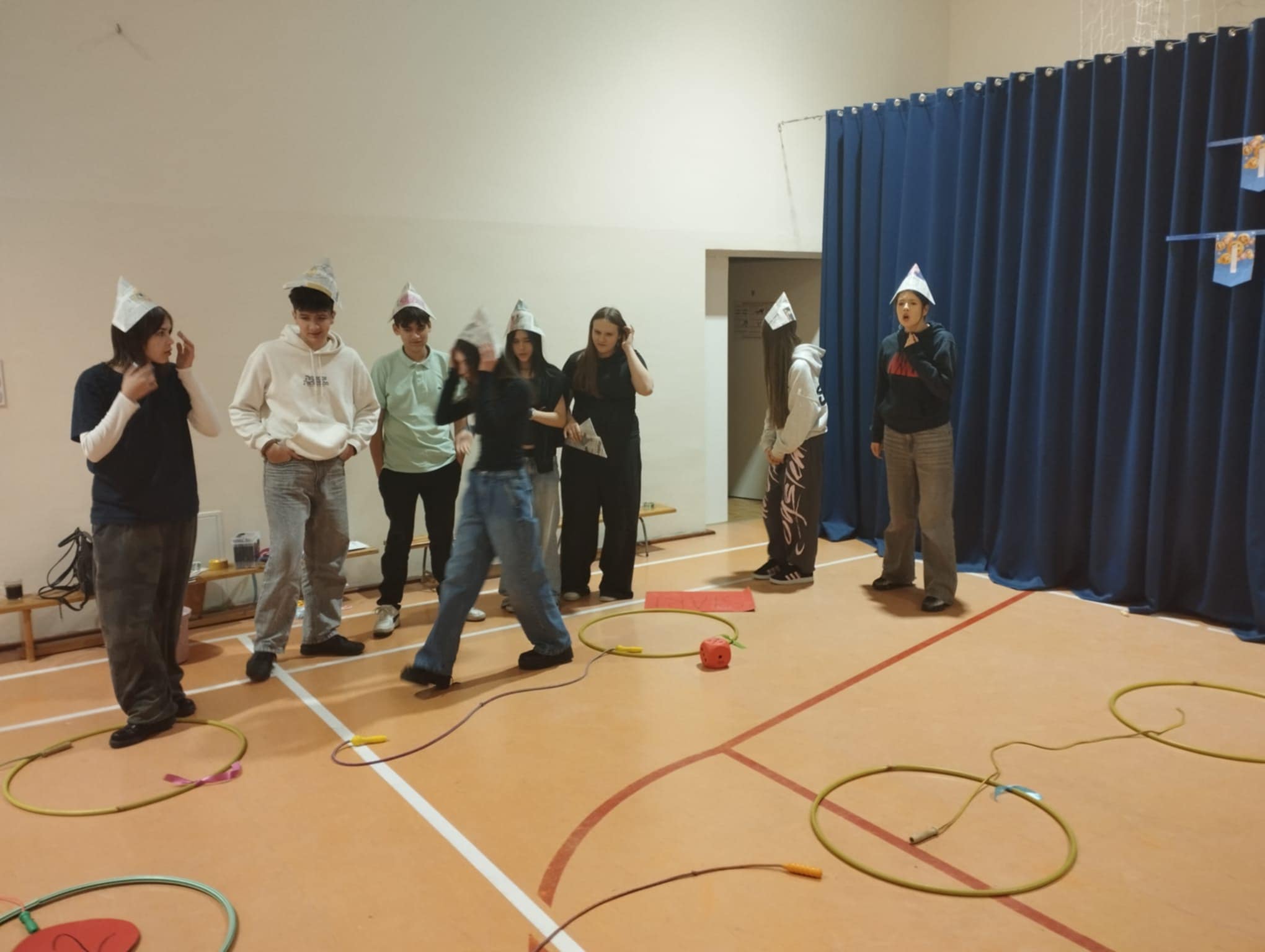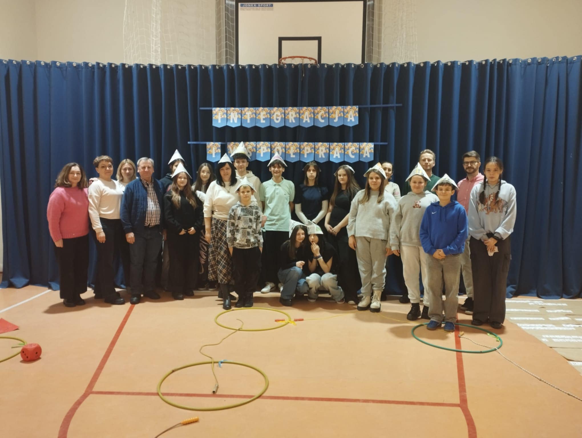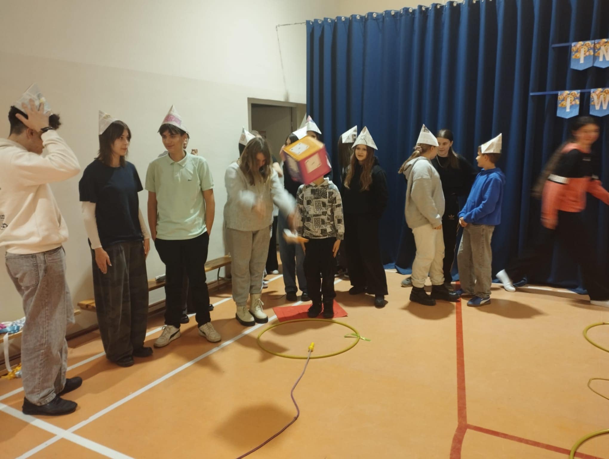 Kolejna część pokazała, że gry planszowe mogą nie tylko bawić, ale też świetnie integrować. Tym razem była to „planszówka” w wersji 3D, ułożona specjalnie na to spotkanie. Uczniowie poruszali się po torze stworzonym z hula-hop, skakanek i różnych przeszkód, losując karty z zadaniami związanymi z działalnością SU. Dla urozmaicenia wszyscy mieli na głowach czapeczki origami wykonane własnoręcznie z gazet, a każda z nich ozdobiona była rysunkiem zwierzątka symbolizującego swoją szkołę.