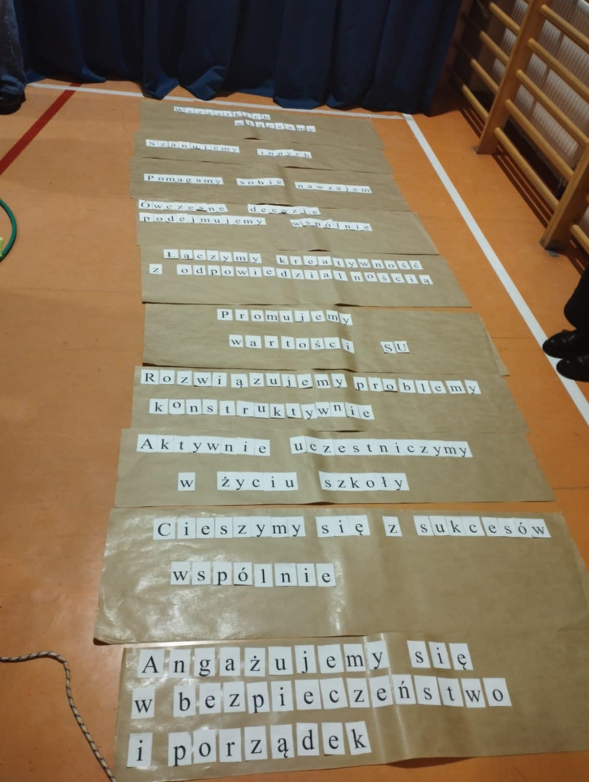Następnie uczestnicy, pracując w grupach, układali z rozsypanek literowych hasła do wspólnego Kodeksu Samorządu Uczniowskiego. Przy muzyce i w dobrym klimacie omawiali znaczenie poszczególnych punktów oraz dodawali swoje propozycje.