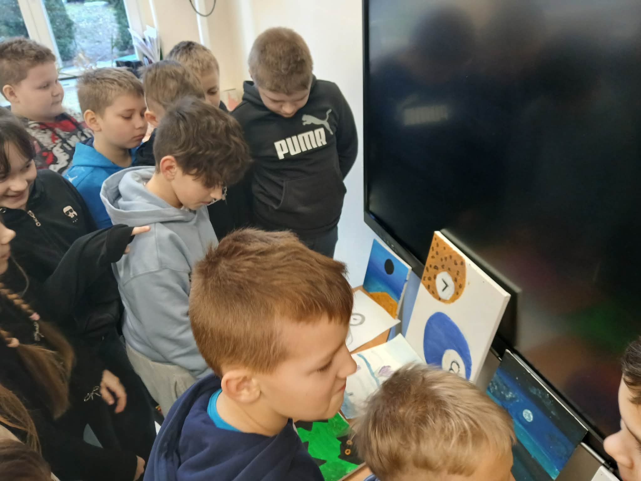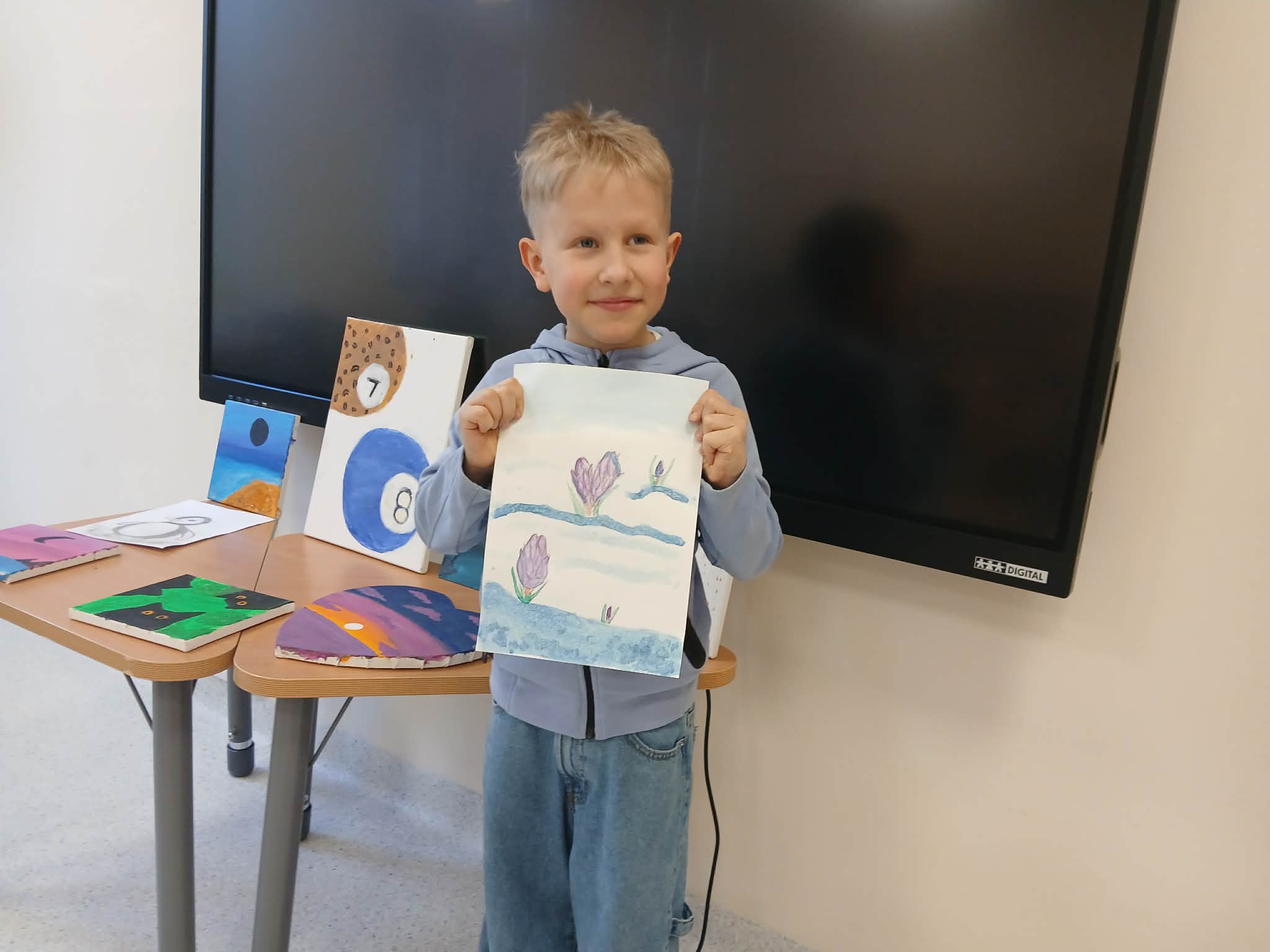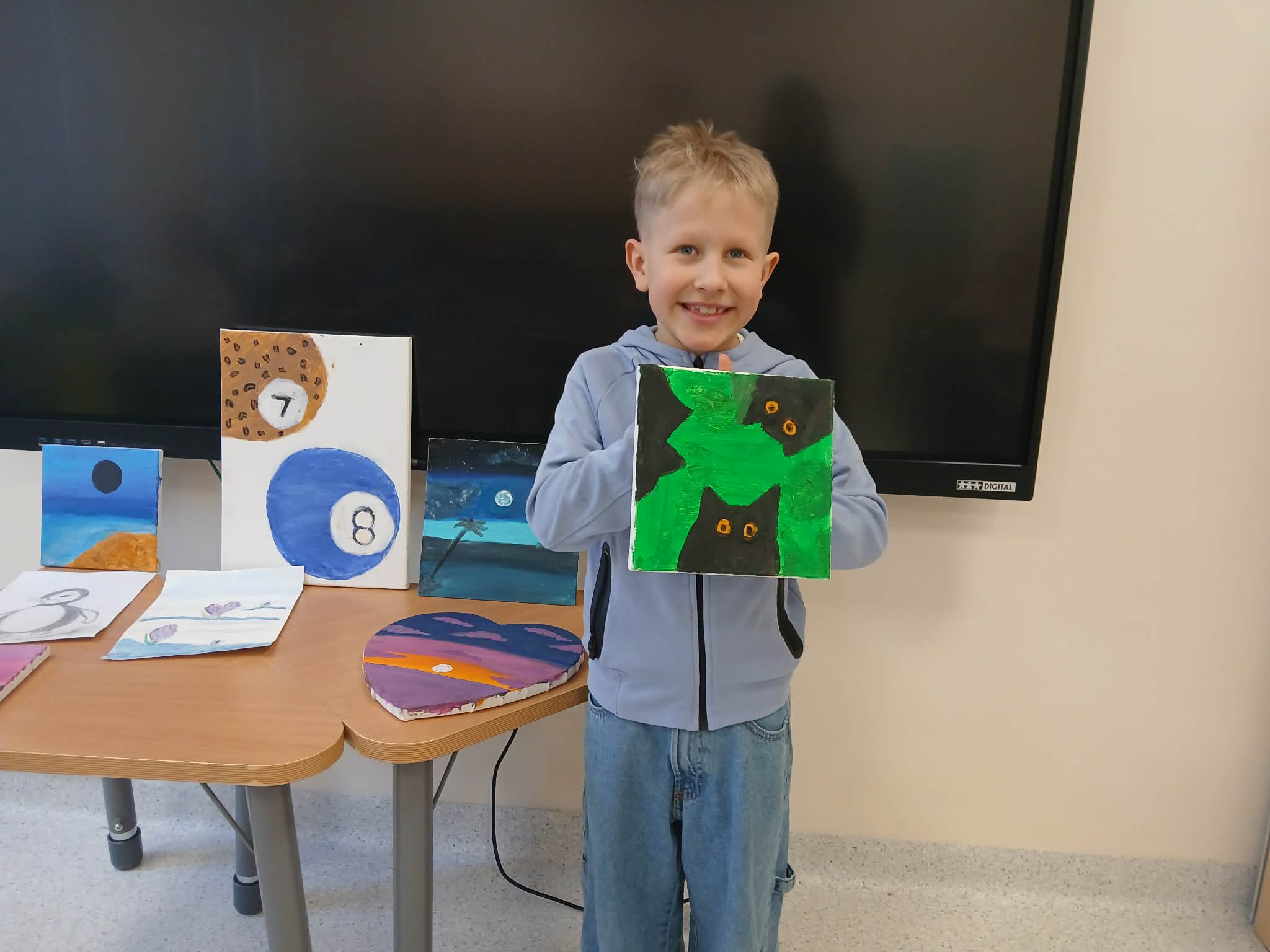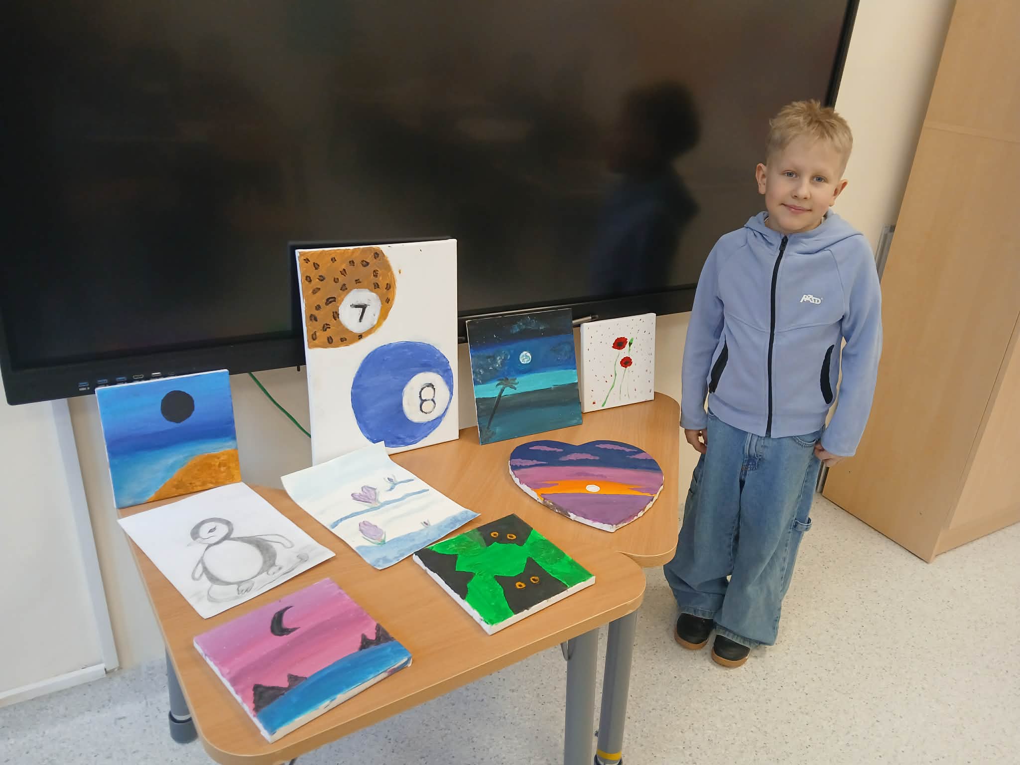 Antek, uczeń klasy 3, ponownie podzielił się z nami swoją pasją do sztuki. Z wielkim entuzjazmem opowiedział o malowaniu – zajęciu, które sprawia mu ogromną radość i pozwala rozwijać wyobraźnię. Tym razem chłopiec przyniósł do klasy kolejne obrazy, które sam namalował i z dumą zaprezentował.