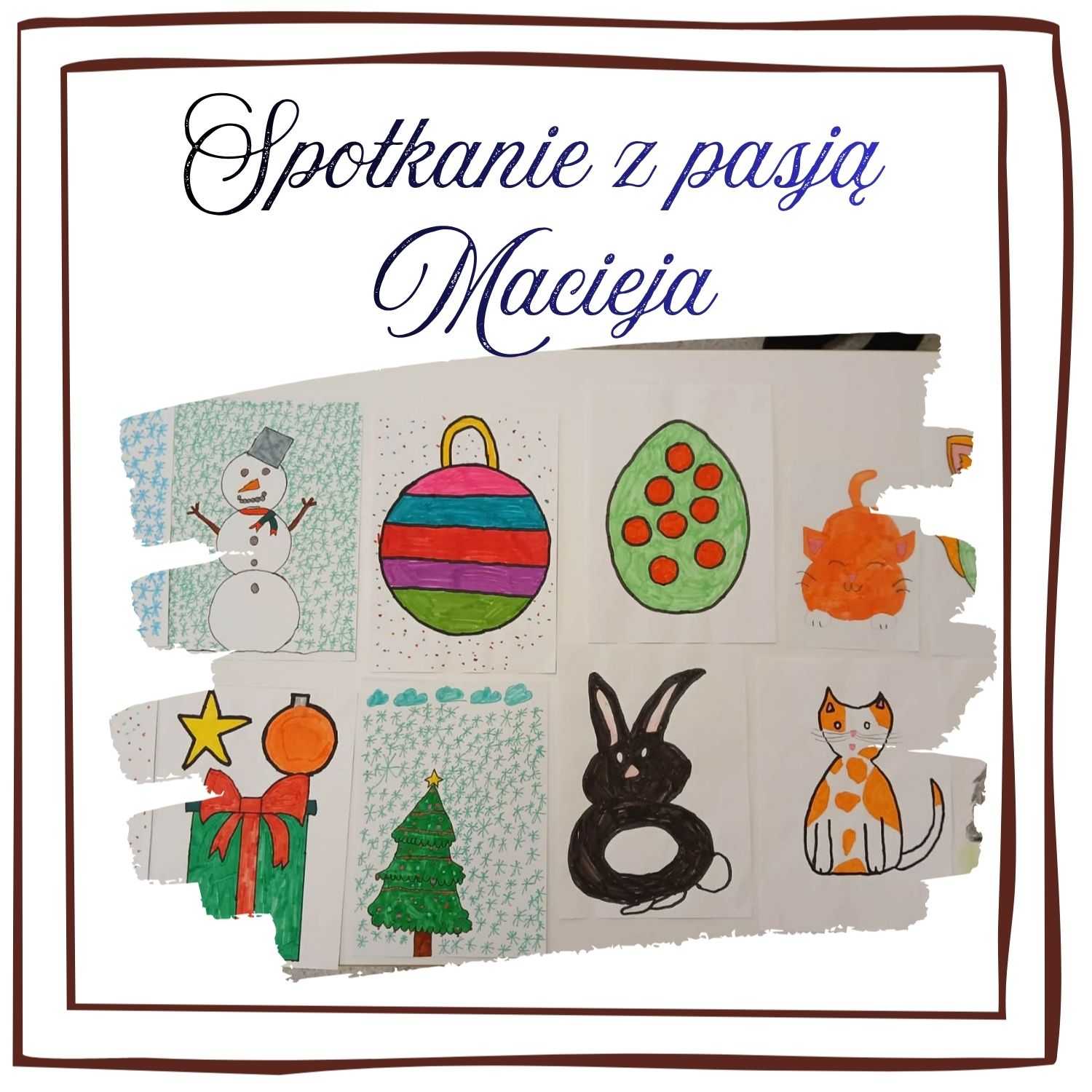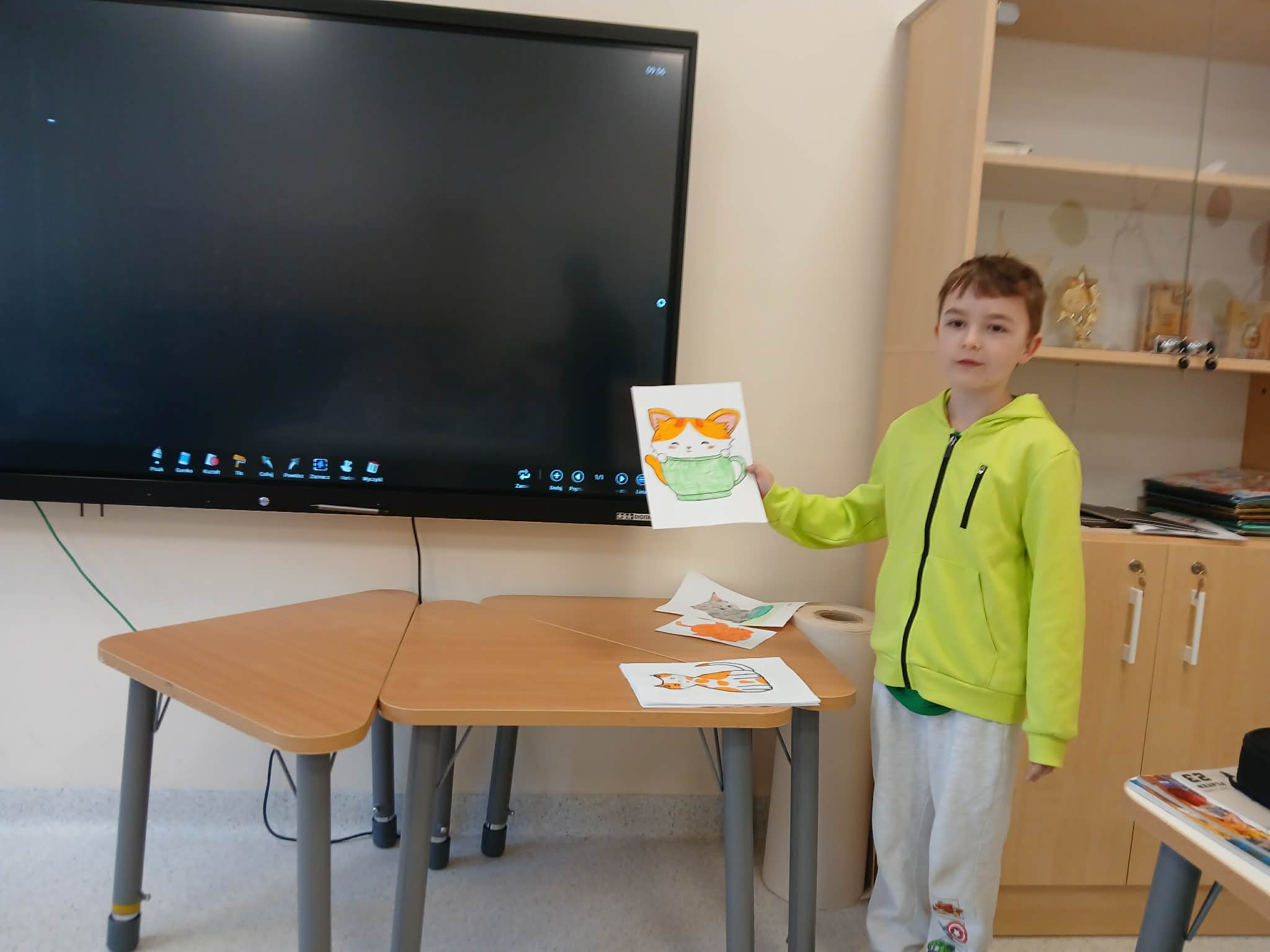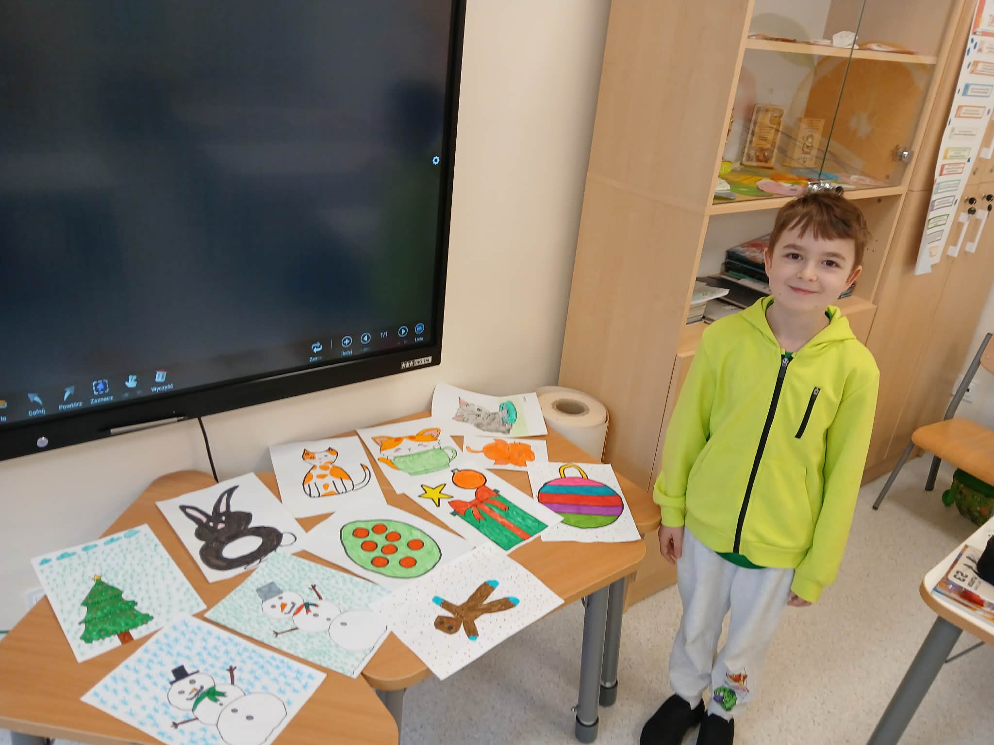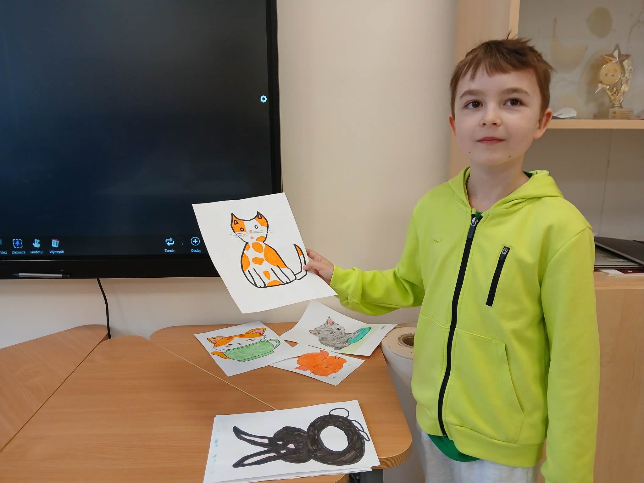 Podczas spotkania Maciej opowiadał o swoich rysunkach – co przedstawiają i jak powstawały. Z dużym zaangażowaniem mówił o swoich pomysłach i inspiracjach. Dzieci słuchały go i z ciekawością oglądały kolejne prace. Na rysunkach można było zobaczyć różne rzeczy. Każda jego praca była starannie wykonana i kolorowa, co wzbudziło podziw wśród uczniów. Koledzy chętnie zadawali pytania i dzielili się swoimi wrażeniami.