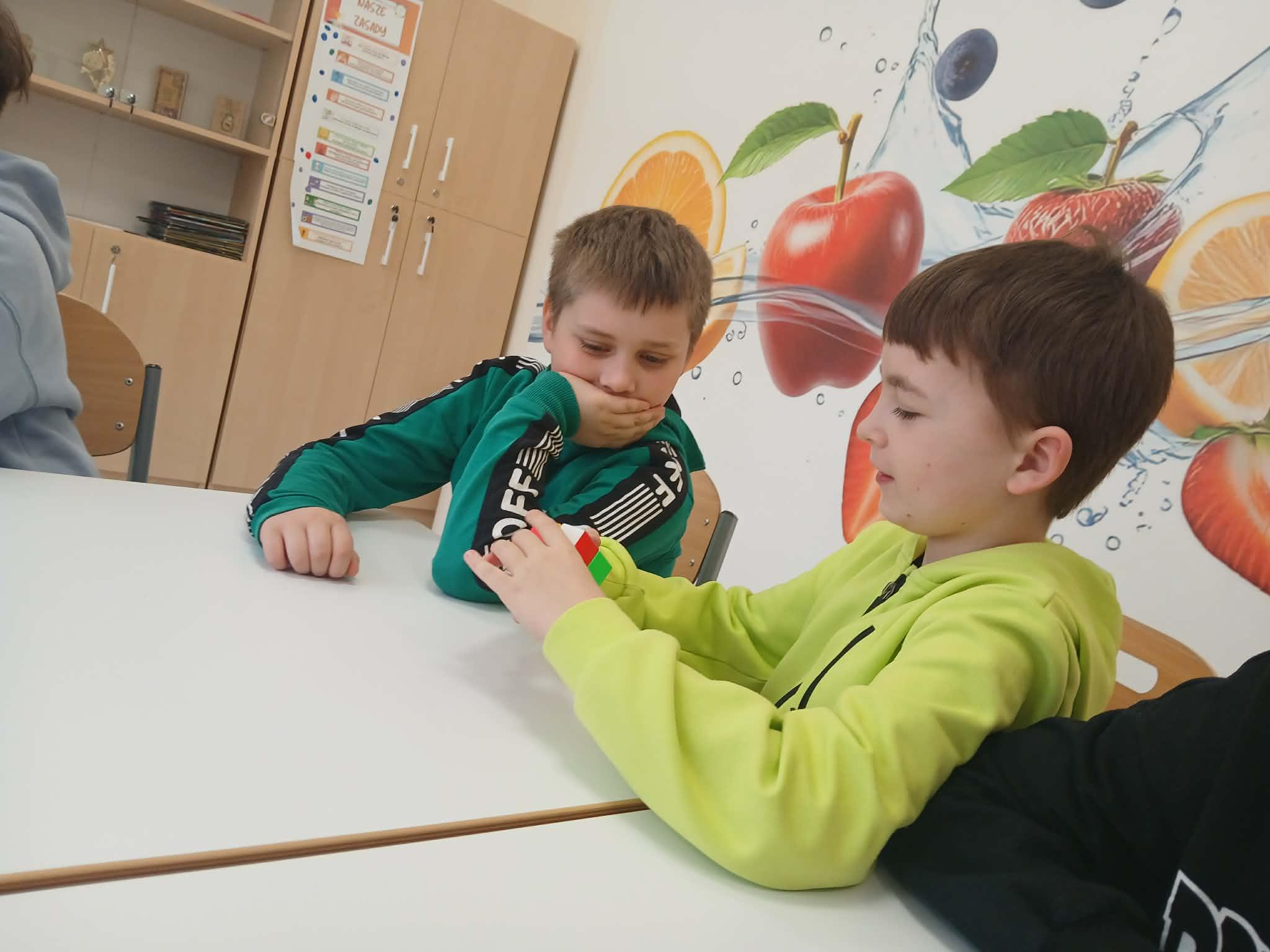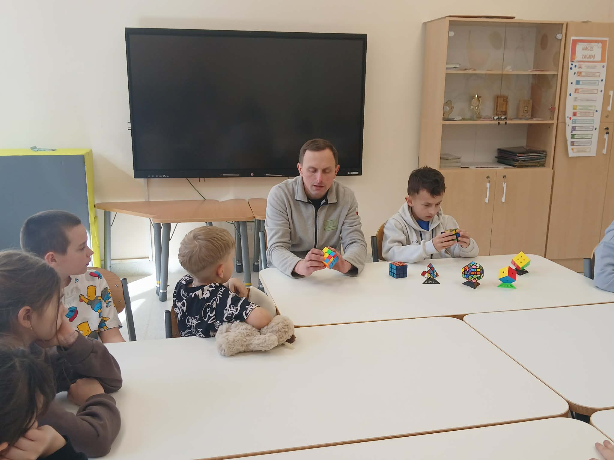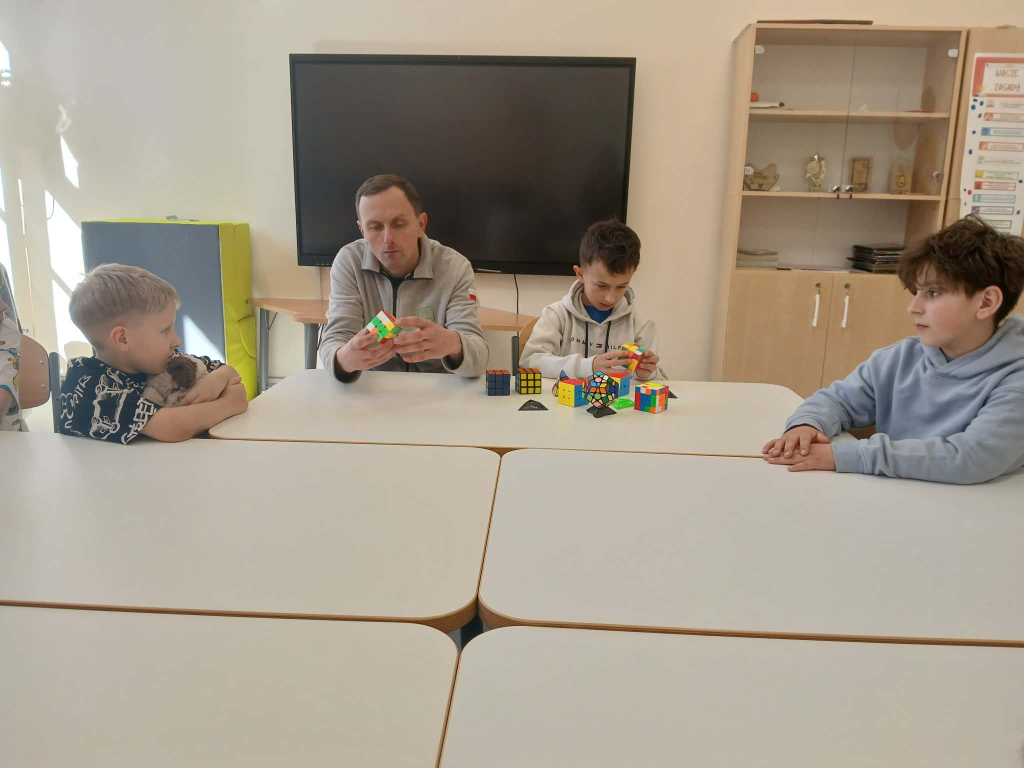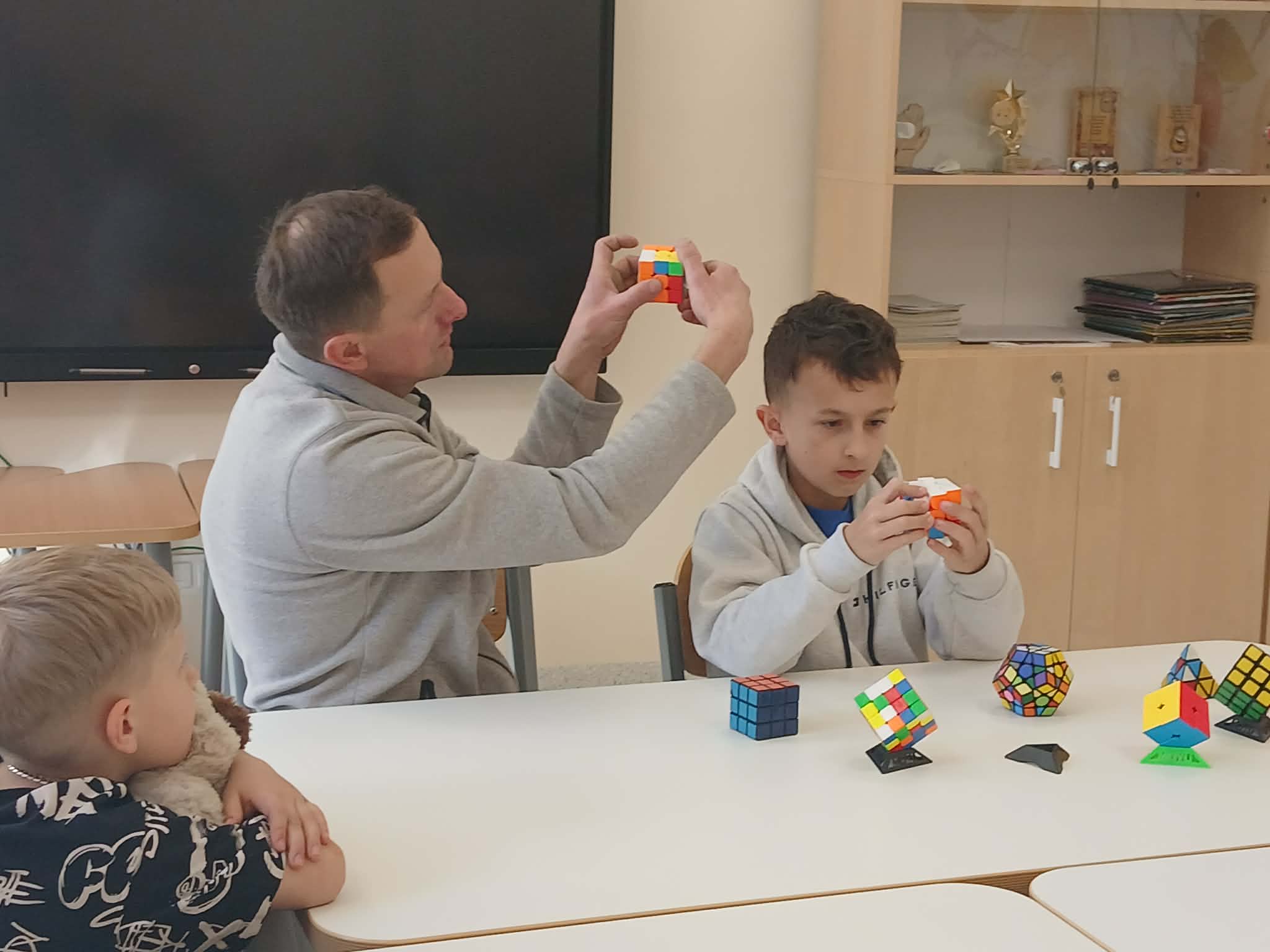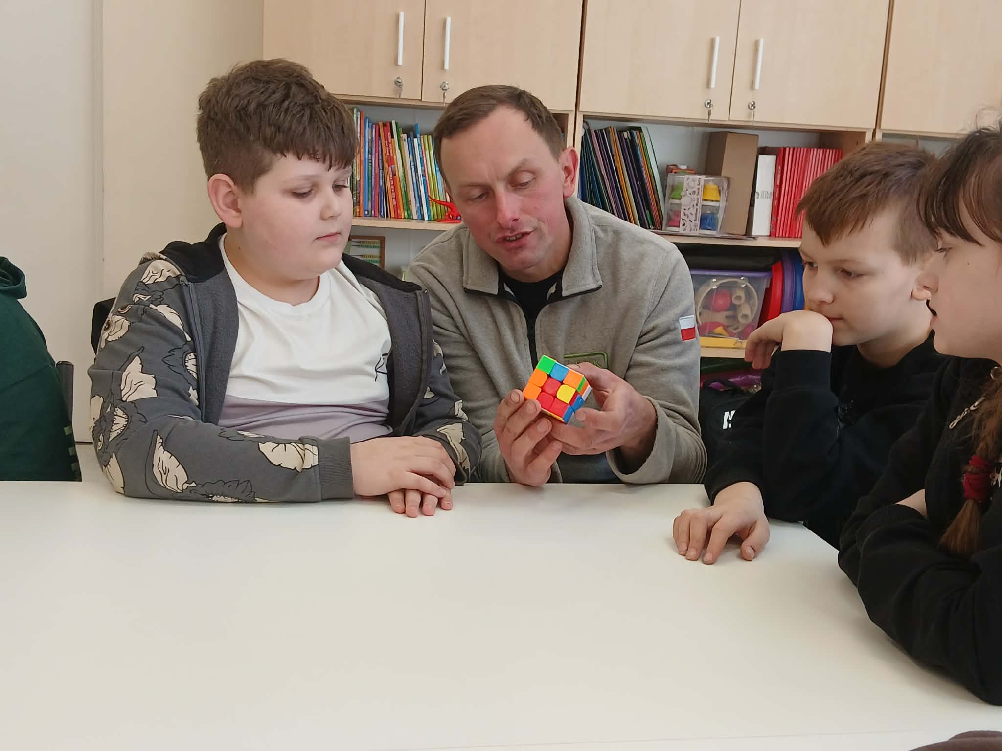Największą atrakcją był jednak wspólny pokaz Szymona i jego taty. W prosty i bardzo przystępny sposób, wykorzystując krótkie historyjki, pokazali klasie, jak można krok po kroku ułożyć kostkę Rubika. Dzięki temu nawet najbardziej skomplikowane ruchy stały się zrozumiałe i ciekawe dla wszystkich uczniów.