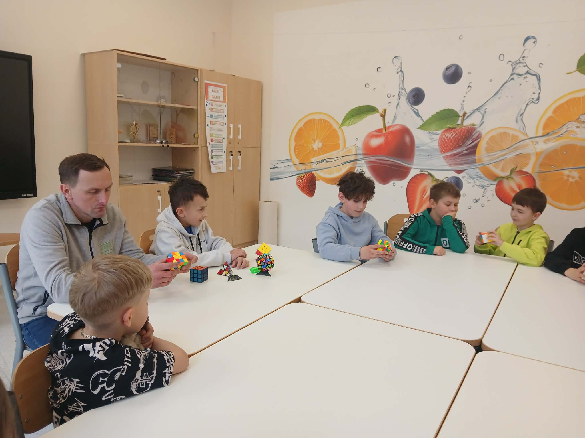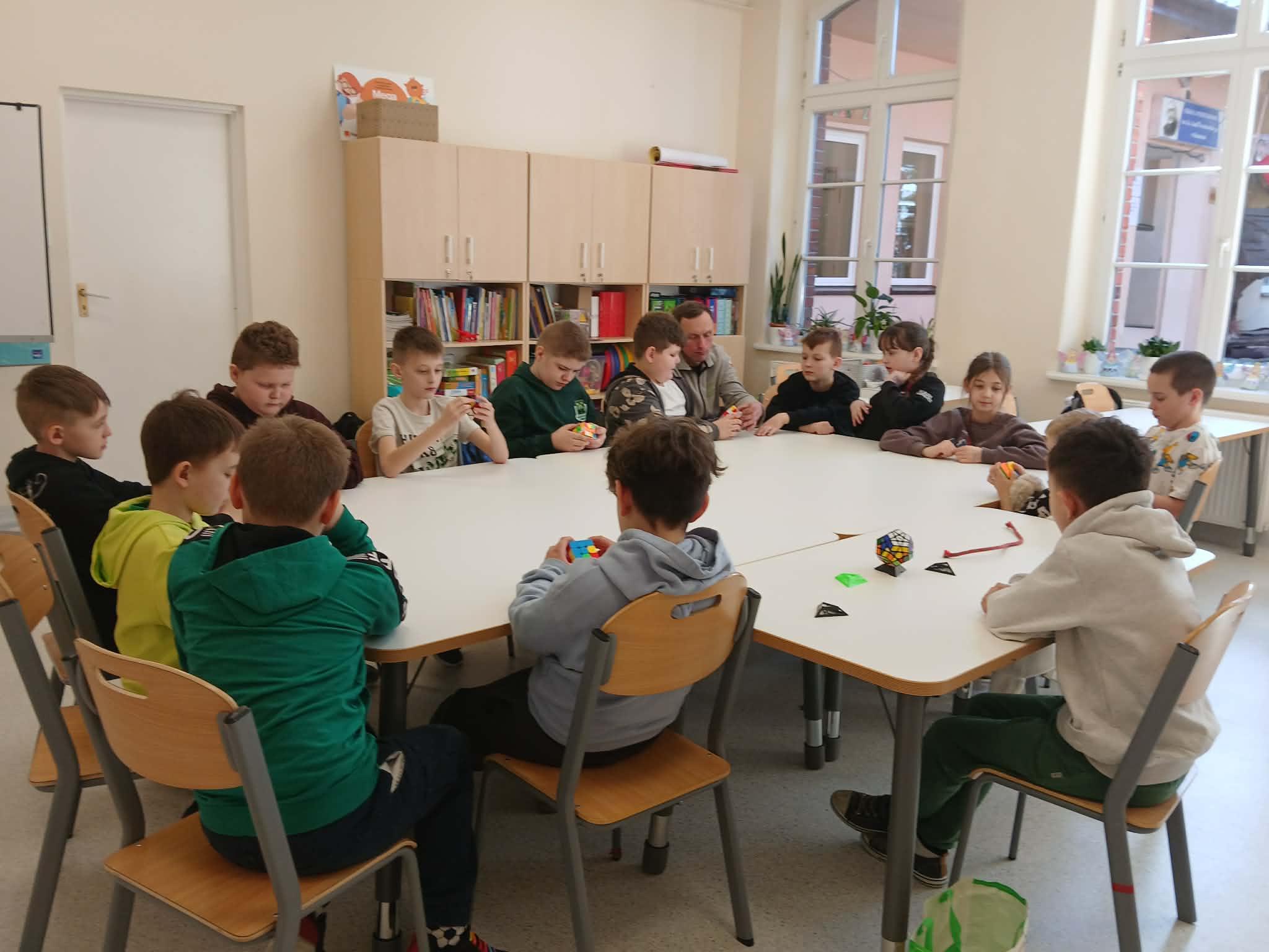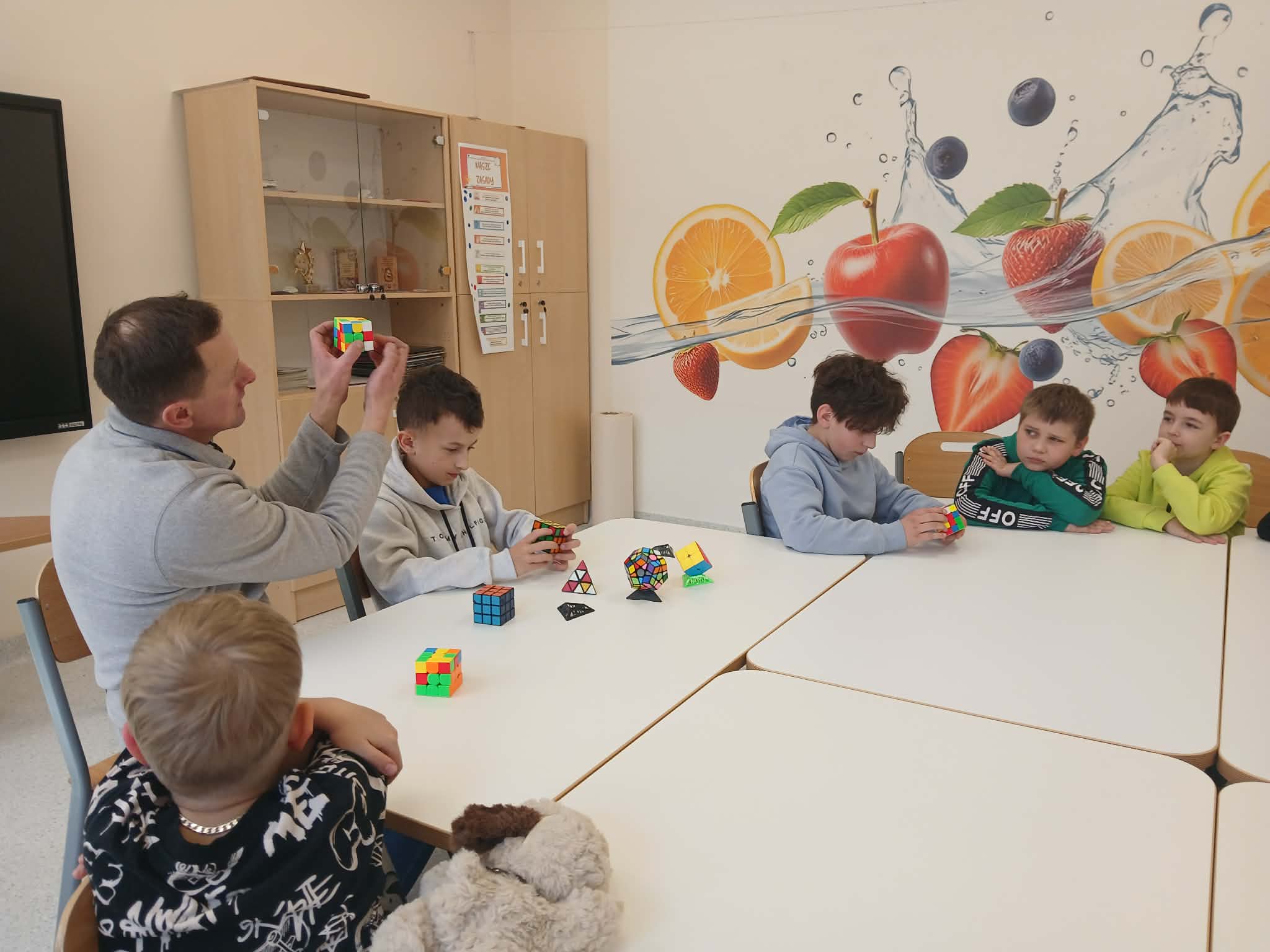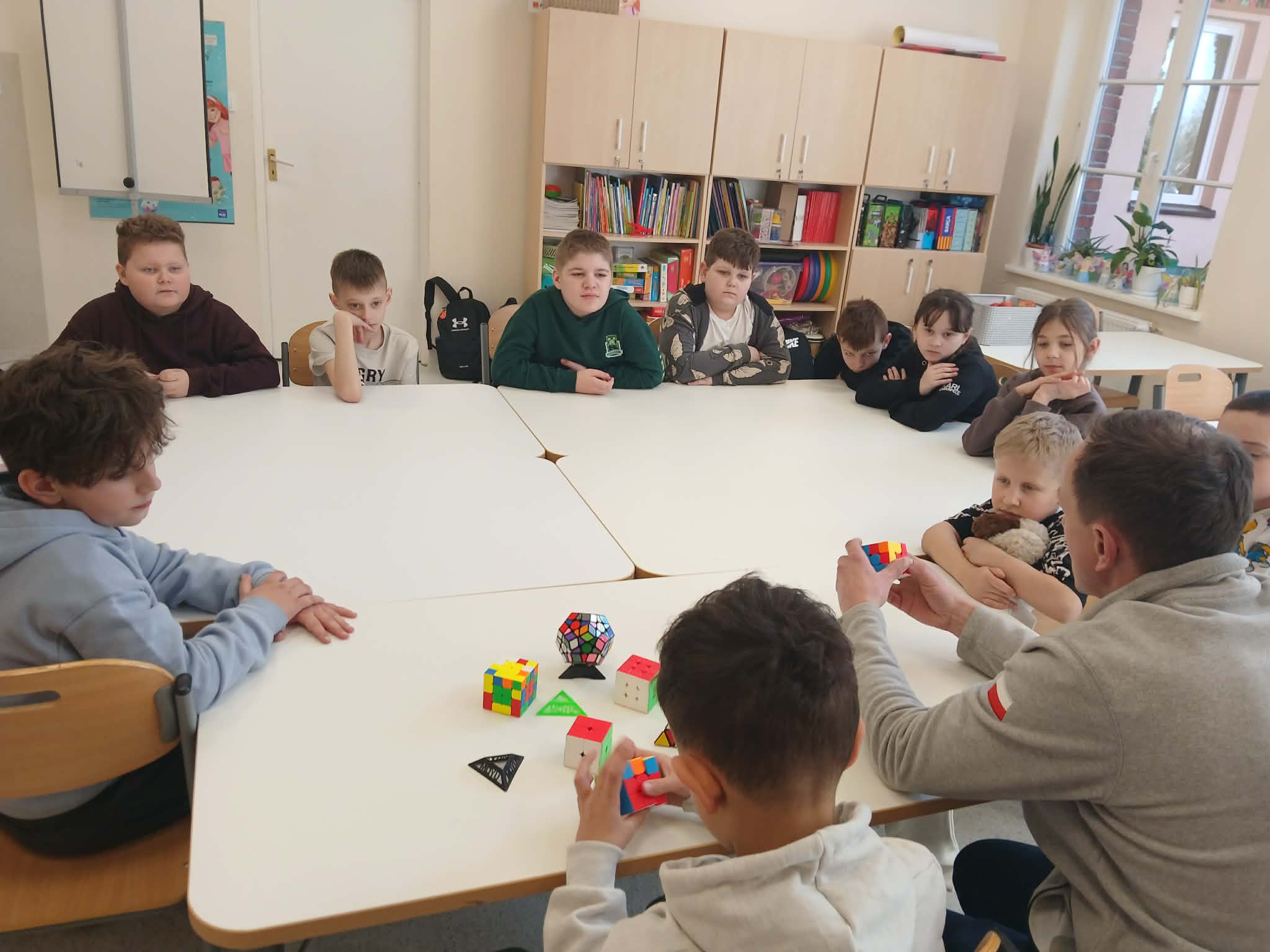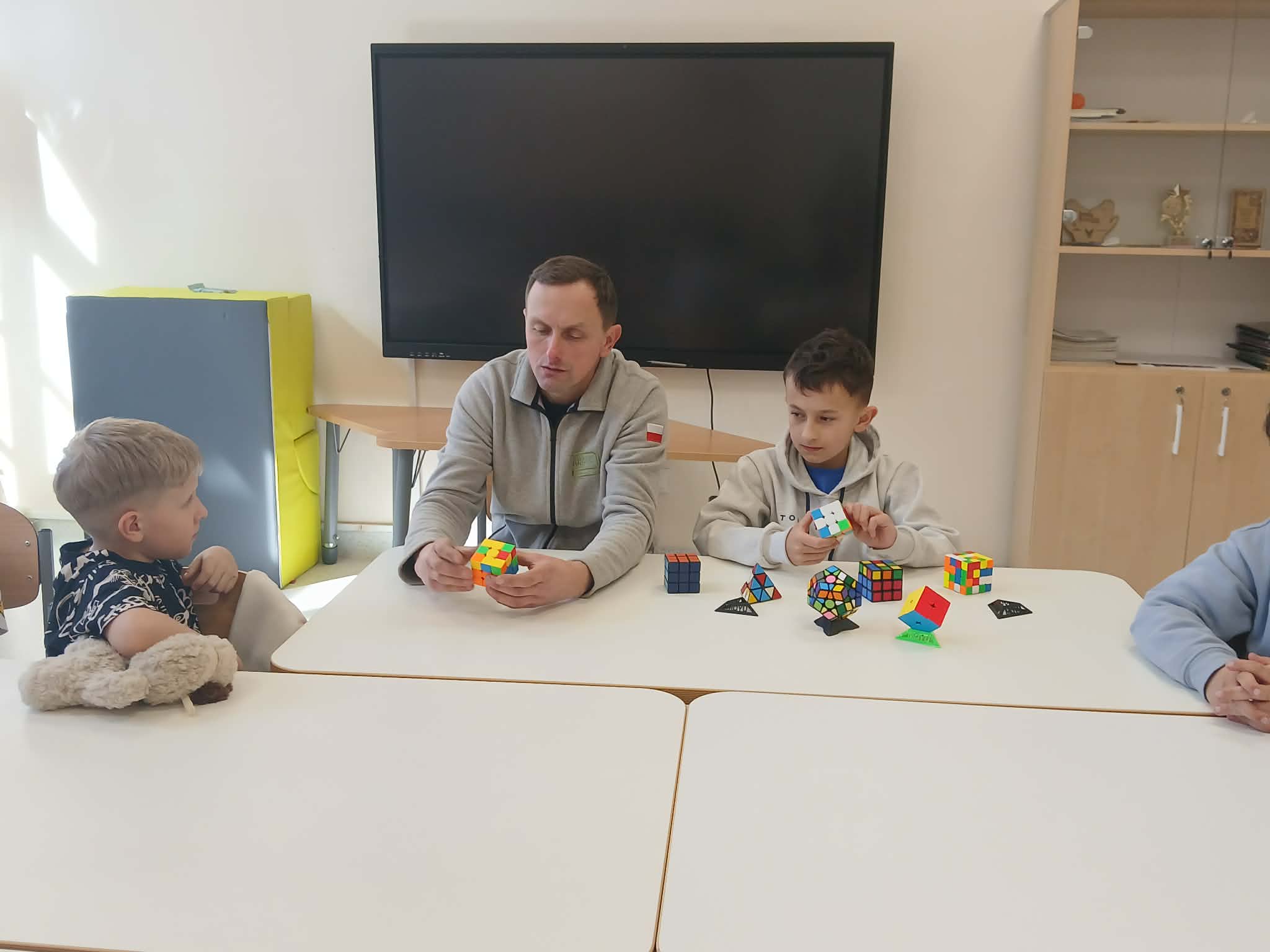 Największą atrakcją był jednak wspólny pokaz Szymona i jego taty. W prosty i bardzo przystępny sposób, wykorzystując krótkie historyjki, pokazali klasie, jak można krok po kroku ułożyć kostkę Rubika. Dzięki temu nawet najbardziej skomplikowane ruchy stały się zrozumiałe i ciekawe dla wszystkich uczniów.