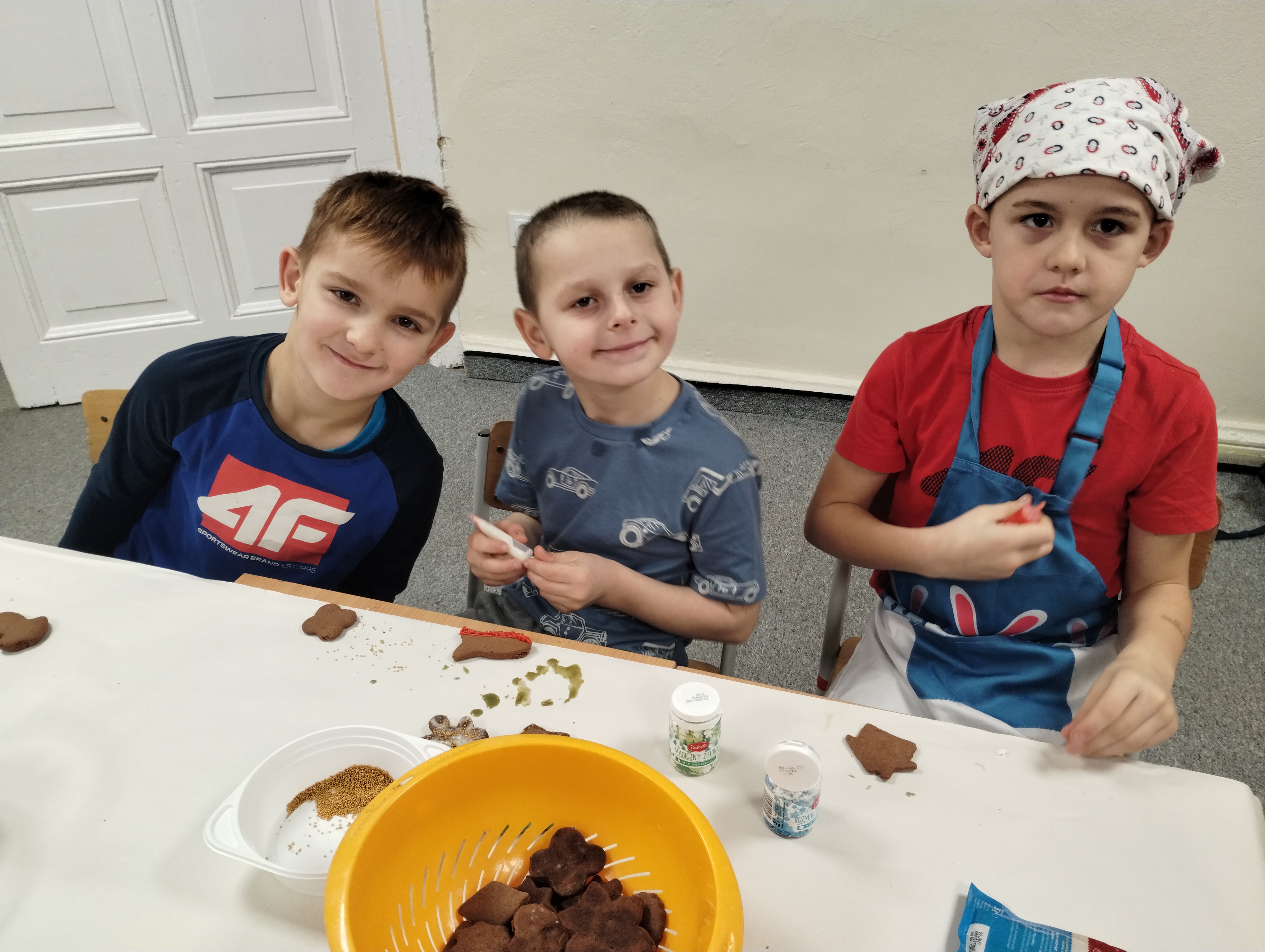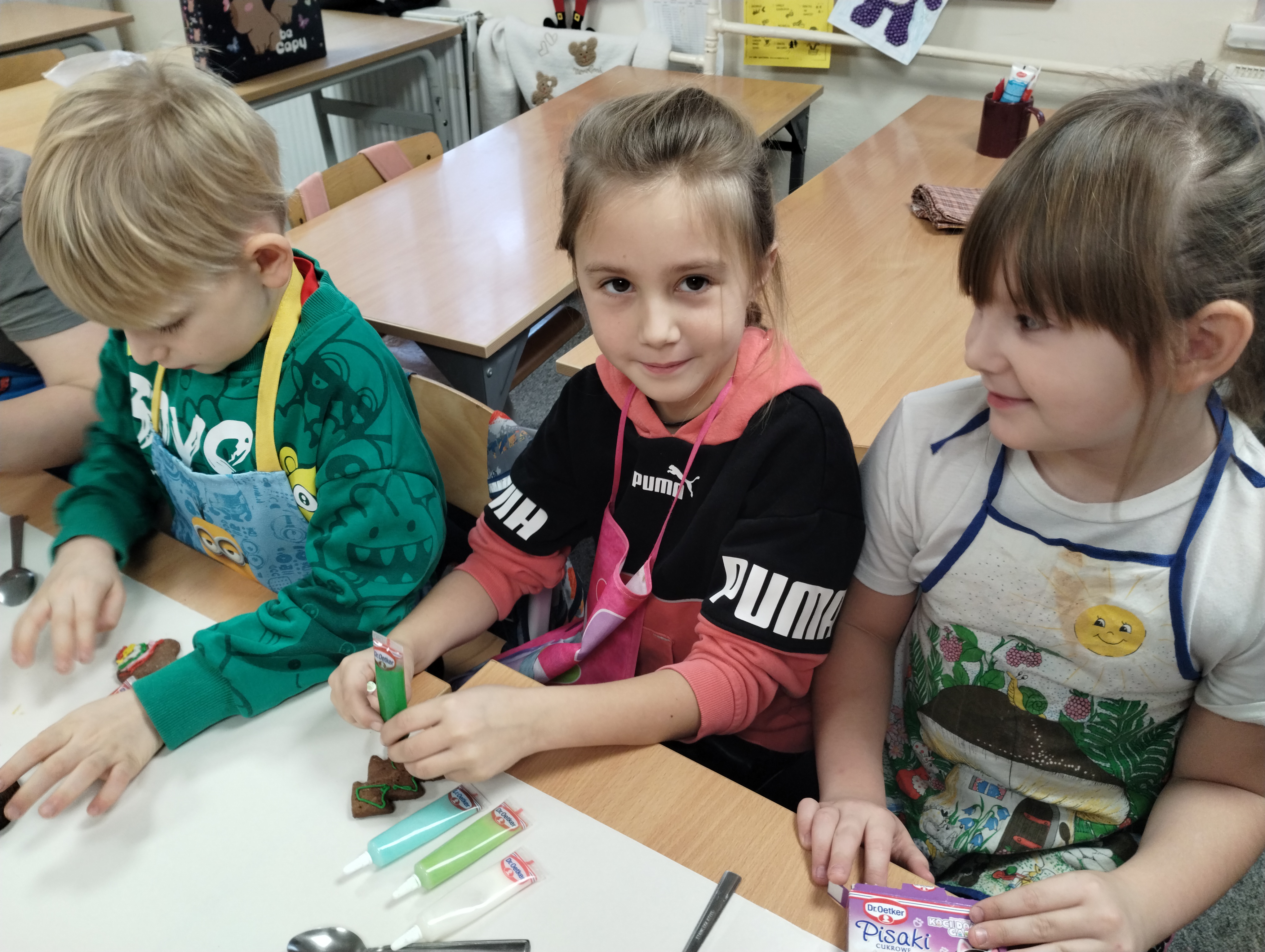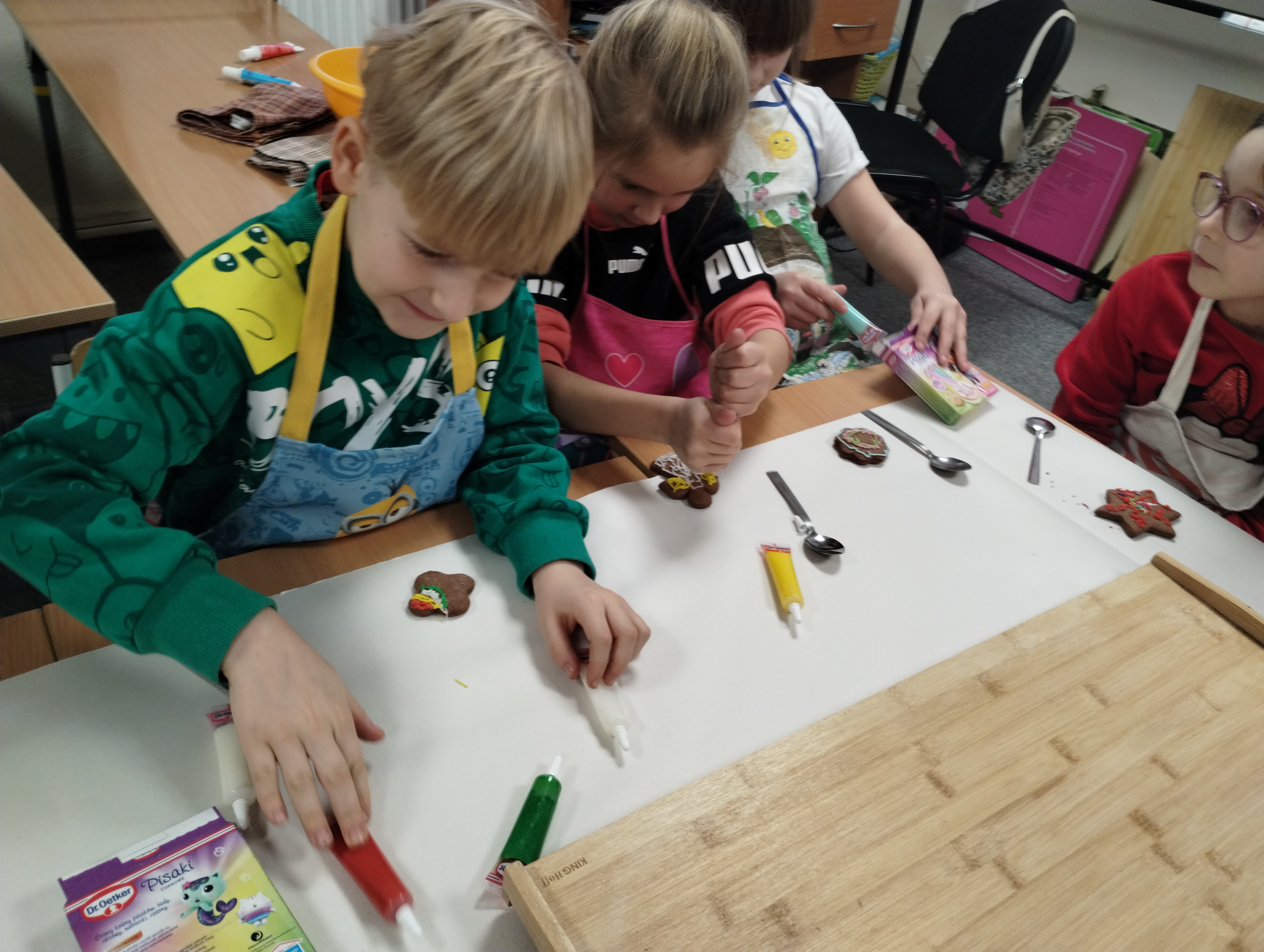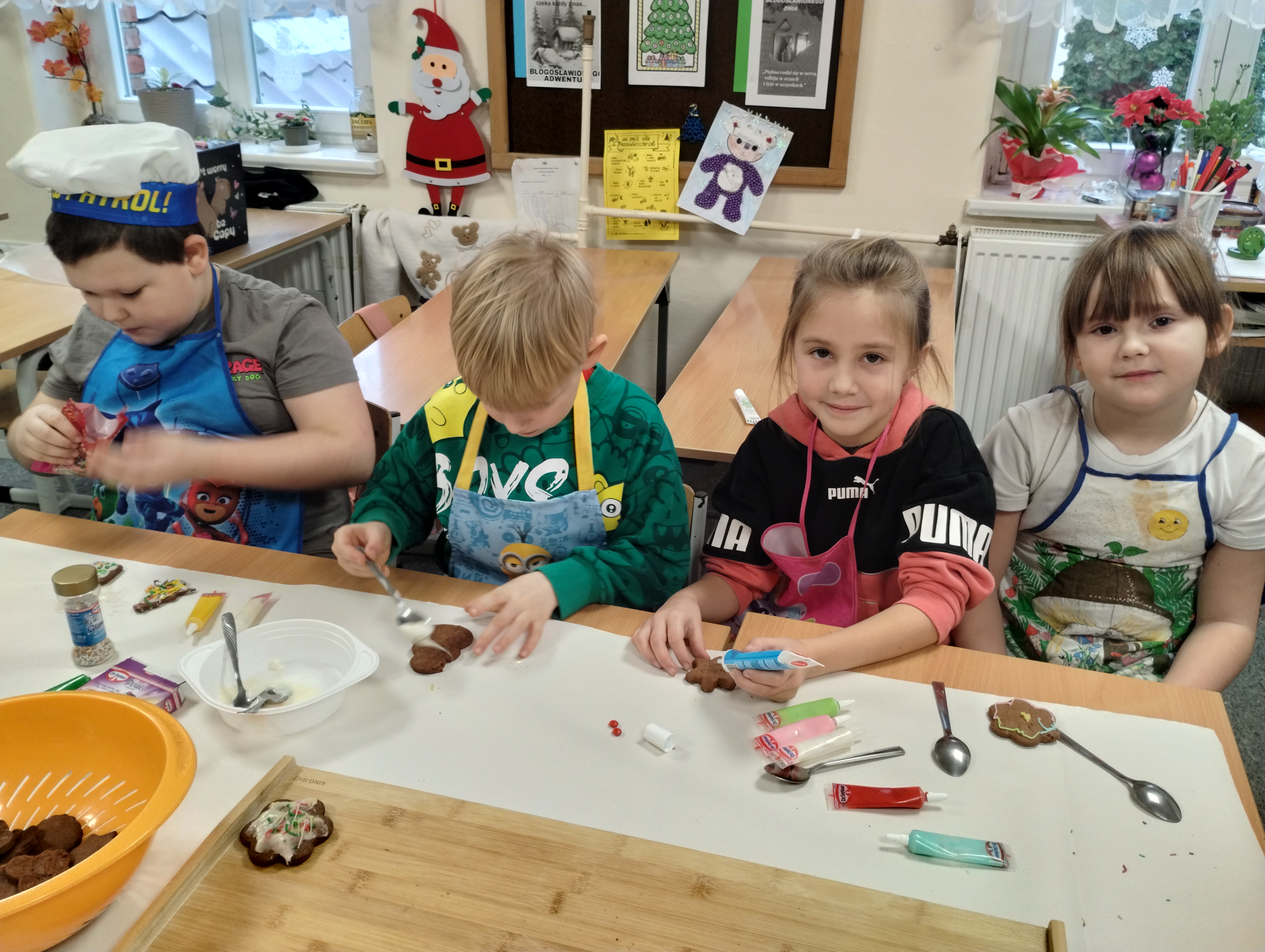 We wtorek, 16 grudnia uczniowie klasy I dekorowali pierniczki. Te pyszne ciasteczka piecze się w okresie przedświątecznym w wielu domach. Ich piękny, korzenny zapach przypomina nam wszystkim, że święta Bożego Narodzenia są tuż za progiem. Nasze zajęcia rozpoczęły się od wprowadzenia w historię piernika i obejrzenia legendy: „O toruńskich piernikach”. Następnie pierwszoklasiści w miłej atmosferze przystąpili do dekorowania ciasteczek lukrem, pisakami, kolorowymi posypkami i cukiereczkami. Pierniki miały różne kształty, a pomysłów na ich dekorowanie było całe mnóstwo. Wszystkie dzieci ozdabiając ciasteczka, wykazały się dużą starannością, pomysłowością i kreatywnością. Trzeba przyznać, że ciasteczka te przypominają małe arcydzieła pełne kolorów i świątecznego blasku. Być może któreś z dzieci w przyszłości zostanie cukiernikiem? Ta kulinarna zabawa zapewne przyczyniła się do nawiązania koleżeńskich relacji między uczniami. Była też świetną okazją do utrwalenia tradycji bożonarodzeniowych oraz źródłem wielu radosnych chwil dla dzieci. Był to także czas wspólnego oczekiwania na radosne święta Bożego Narodzenia. Pięknie udekorowane pierniki znajdą się na wigilijnym stole podczas klasowej wigilii. Wigilię w naszej klasie rozpoczniemy zgodnie z tradycją od połamania się opłatkiem i złożenia sobie świątecznych życzeń.