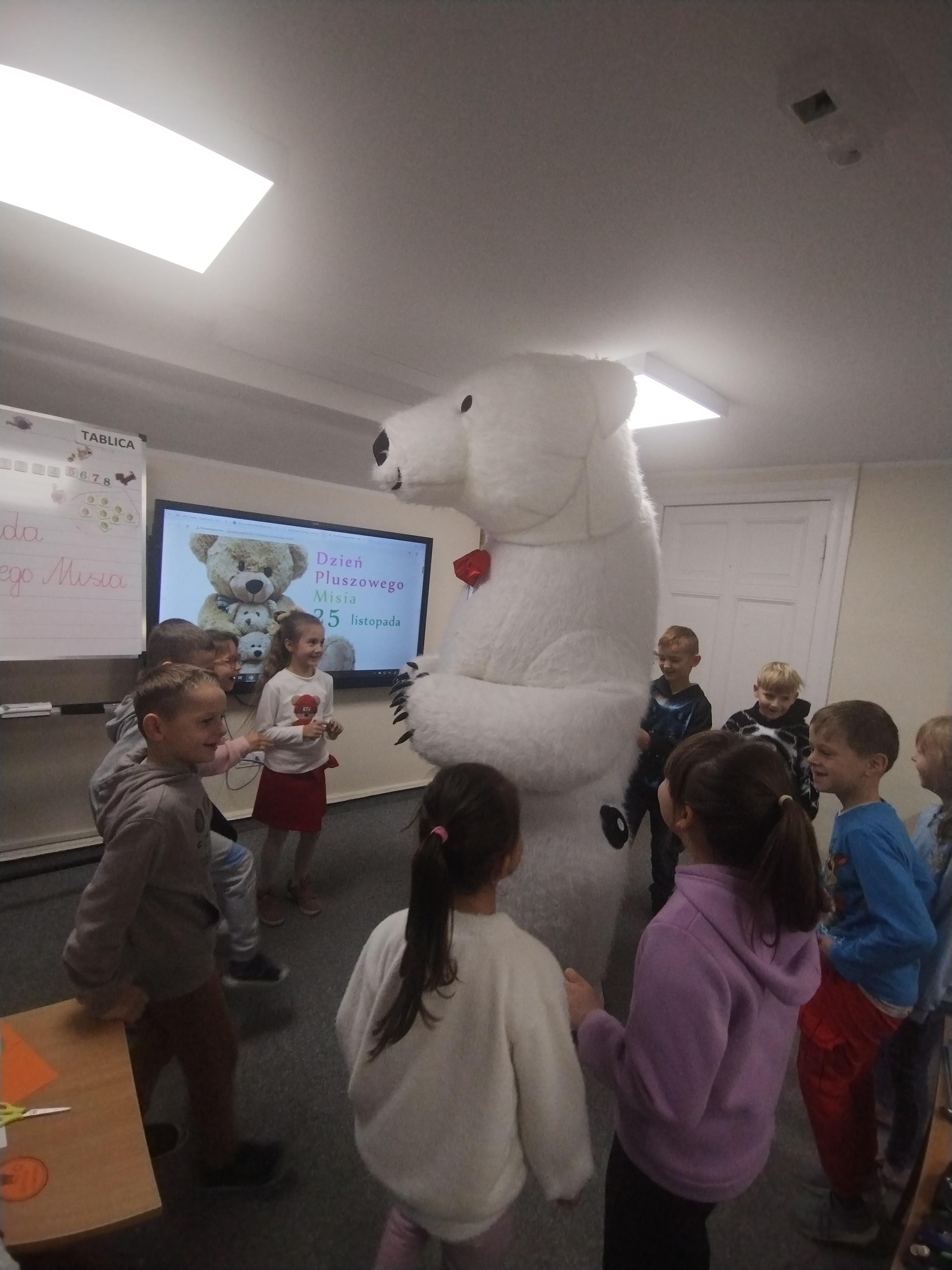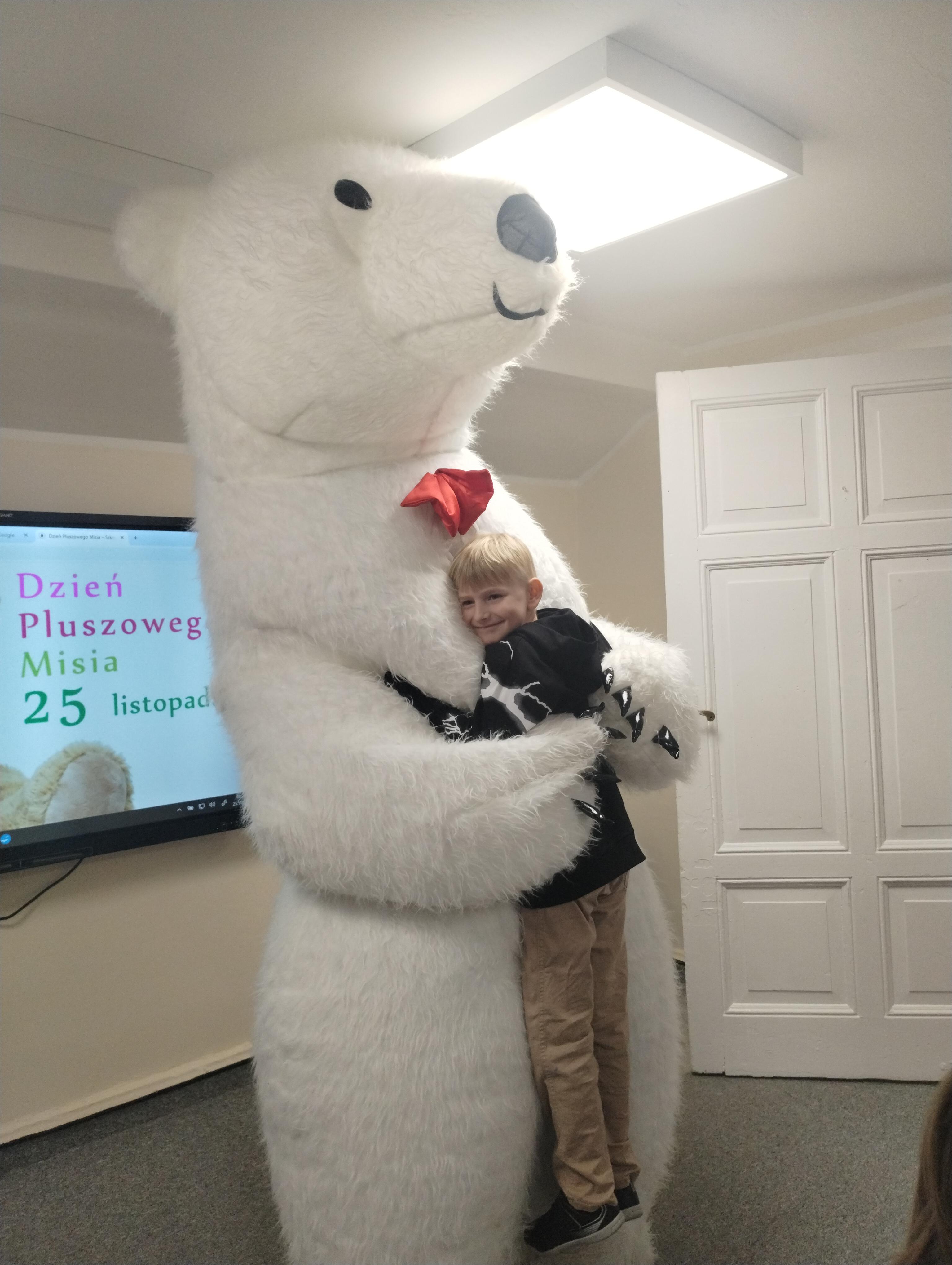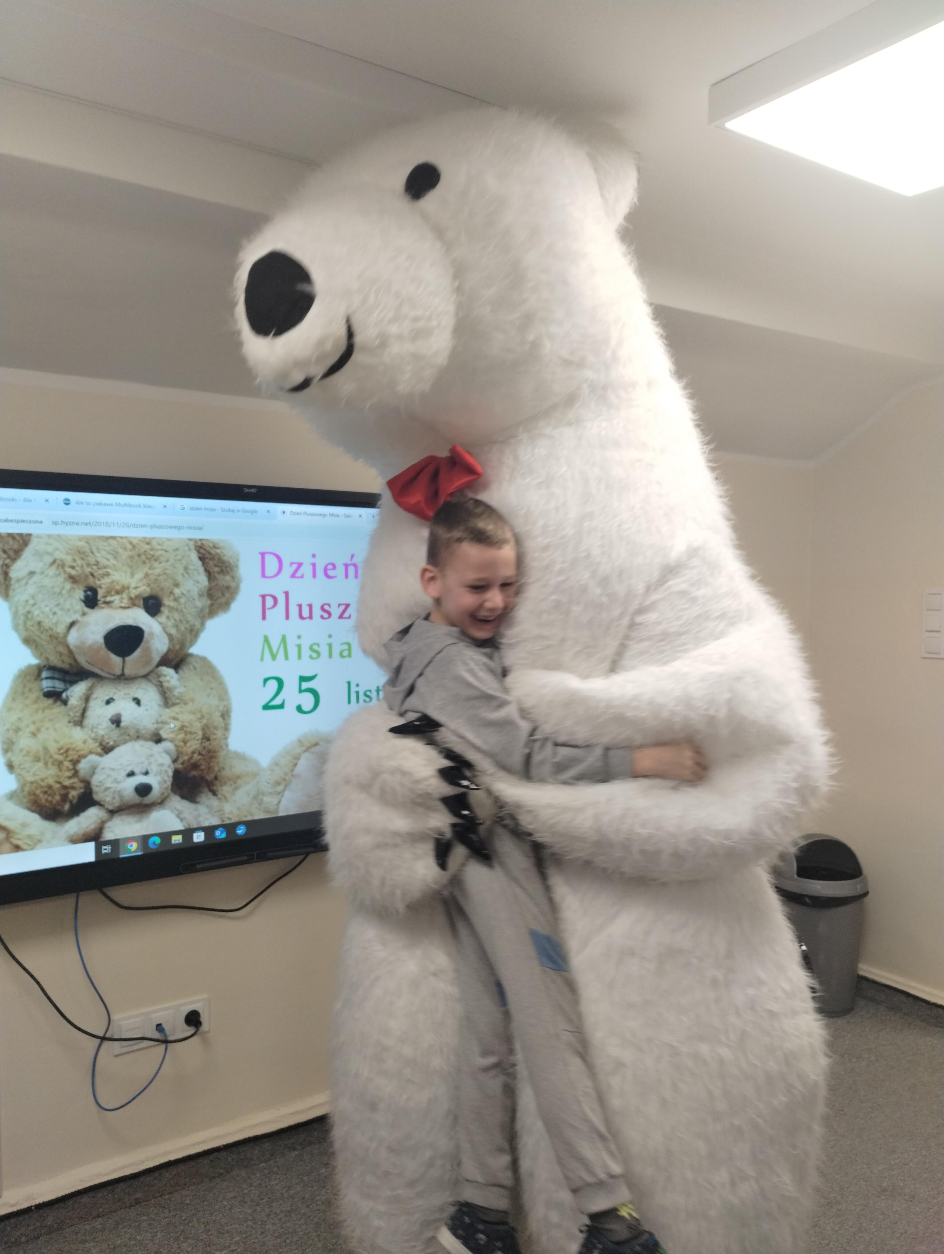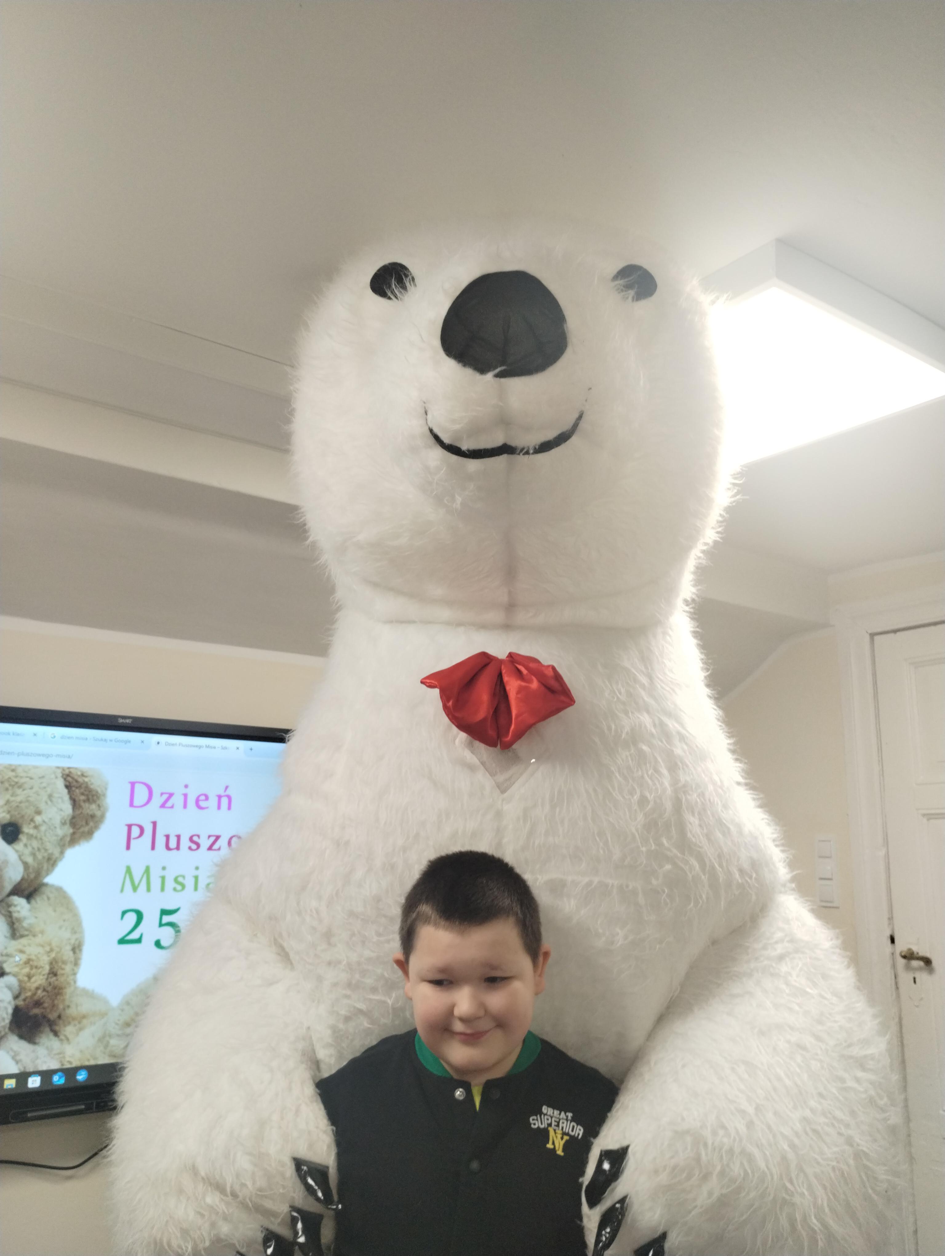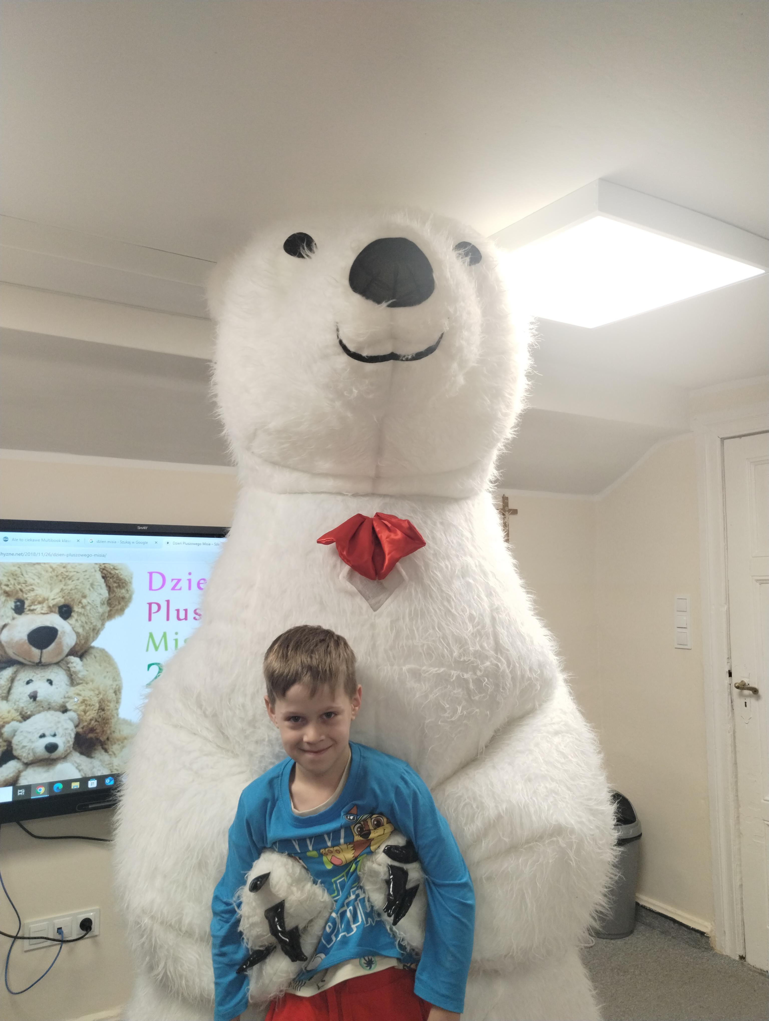 25 listopada obchodziliśmy Światowy Dzień Pluszowego Misia. Uczniowie klasy I aktywnie włączyli w obchody tego uroczego święta, bo miś to najlepszy przyjaciel dzieci i najmilsza przytulanka. Tego dnia dzieci przyniosły do szkoły swoje ulubione maskotki, aby wspólnie świętować. Były misie duże, małe, średnie, brązowe, różowe, … . Wszystkie były śliczne, ukochane oraz wyjątkowe. Motyw tej pluszowej maskotki przewijał się również na ubraniach dzieci. Na początku „misiowych zajęć” pierwszoklasiści obejrzeli film, który przybliżył im historię pluszowego misia. Następnie każde dziecko zaprezentowało swojego misia kolegom i koleżankom, uzupełniło paszport swojej przytulanki oraz ułożyło misia z puzzli. Wtem ktoś zapukał do naszych drzwi. Okazało się, że to biały, olbrzymi miś, którego głowa sięgała sufitu. Radości nie było końca. Pierwszacy przytulali się do misia, głaskali go i tańczyli z nim w rytm misiowej muzyki. Tego dnia rozmawialiśmy jeszcze o misiach, które są bohaterami bajek: Misiu Uszatku, Kubusiu Puchatku. Dzieci prezentowały też swoje ulubione książeczki o tych pluszowych maskotkach. Jedną z bajeczek przeczytaliśmy. Po jej wysłuchaniu dzieci stwierdziły, ze należy zawsze słuchać rodziców. Pluszowe maskotki towarzyszyły swoim opiekunom w czasie przerw i na lekcjach. Na koniec zajęć ogłoszony został klasowy konkurs plastyczny: Mój wymarzony miś”.