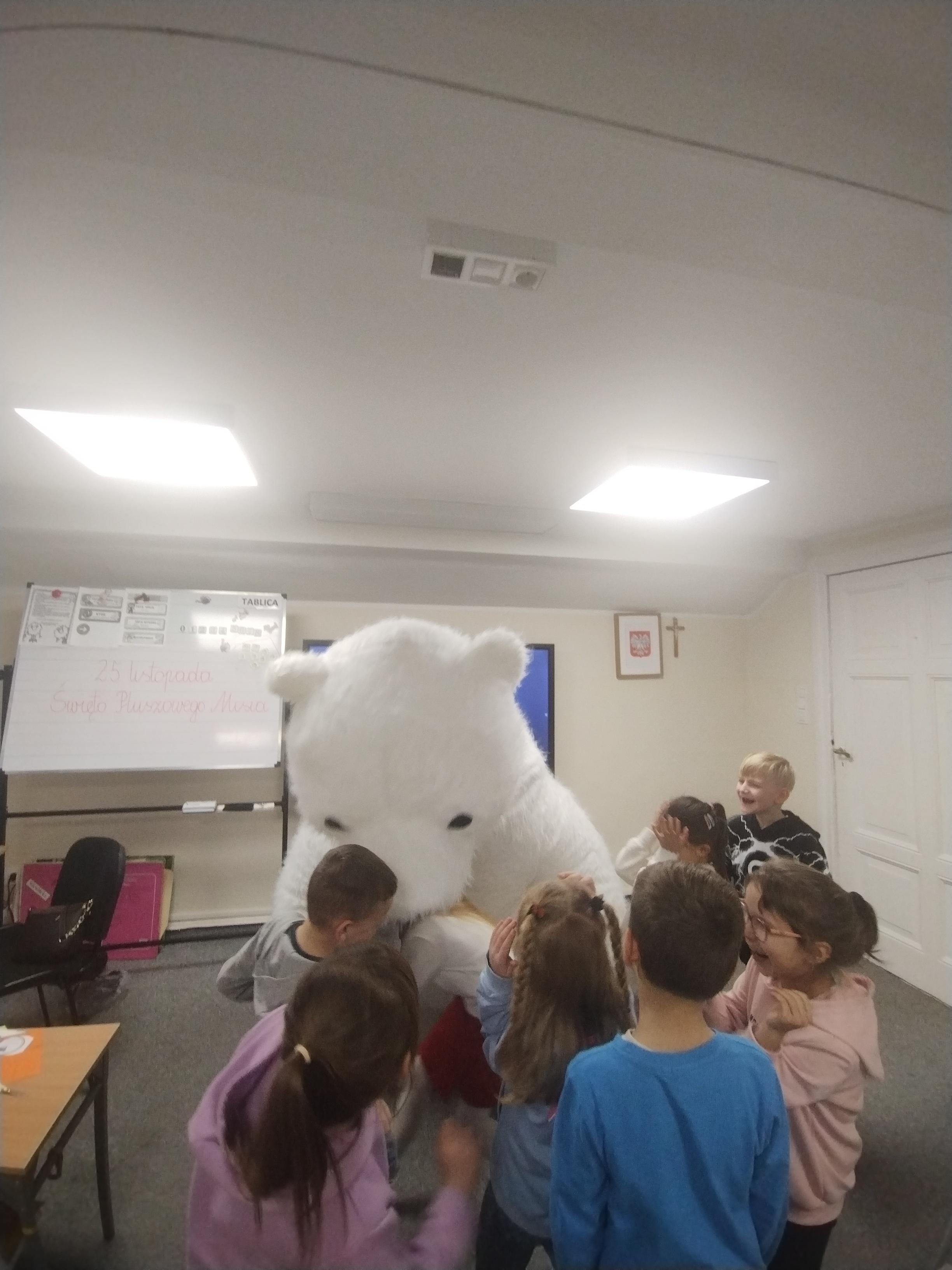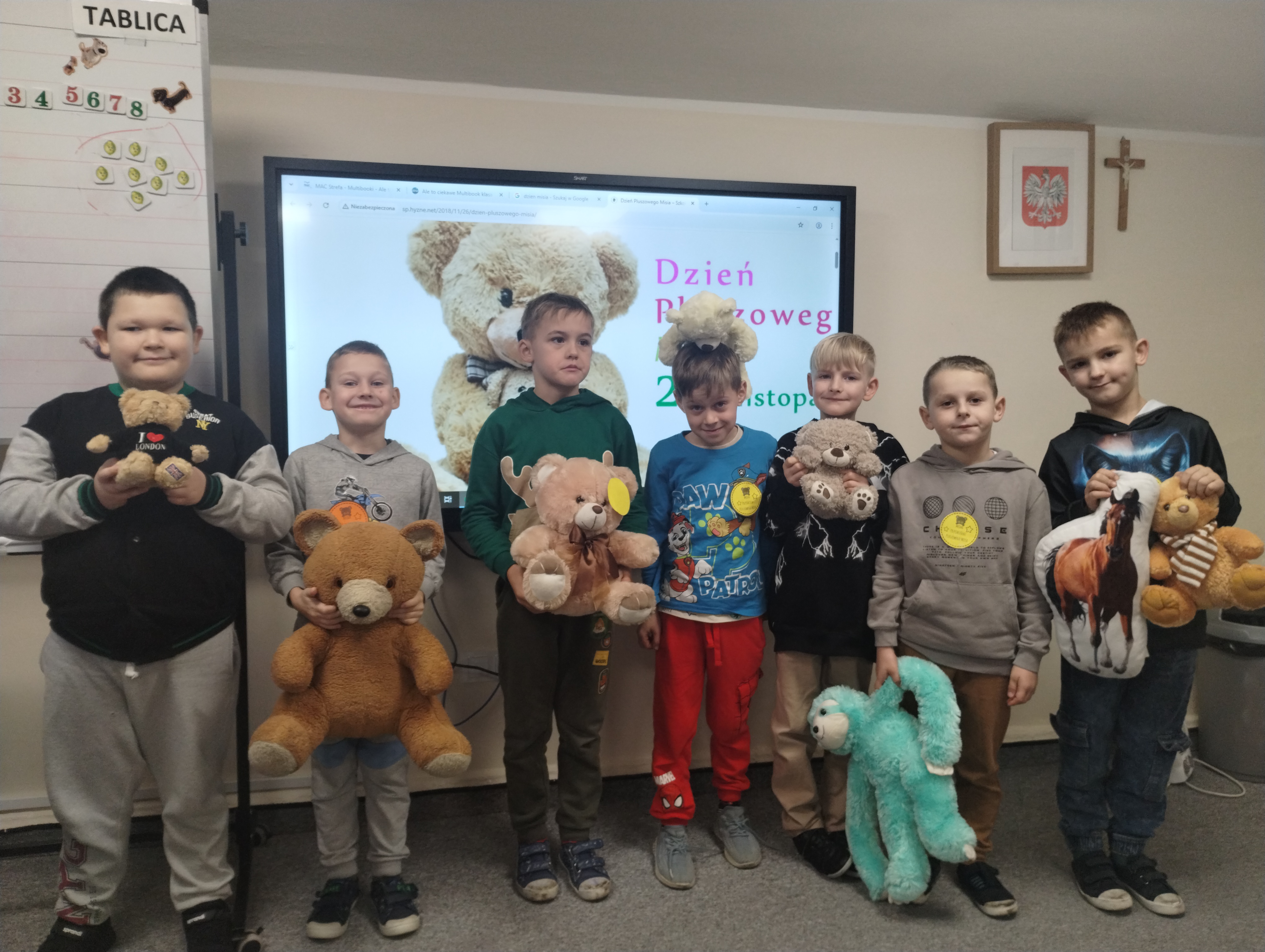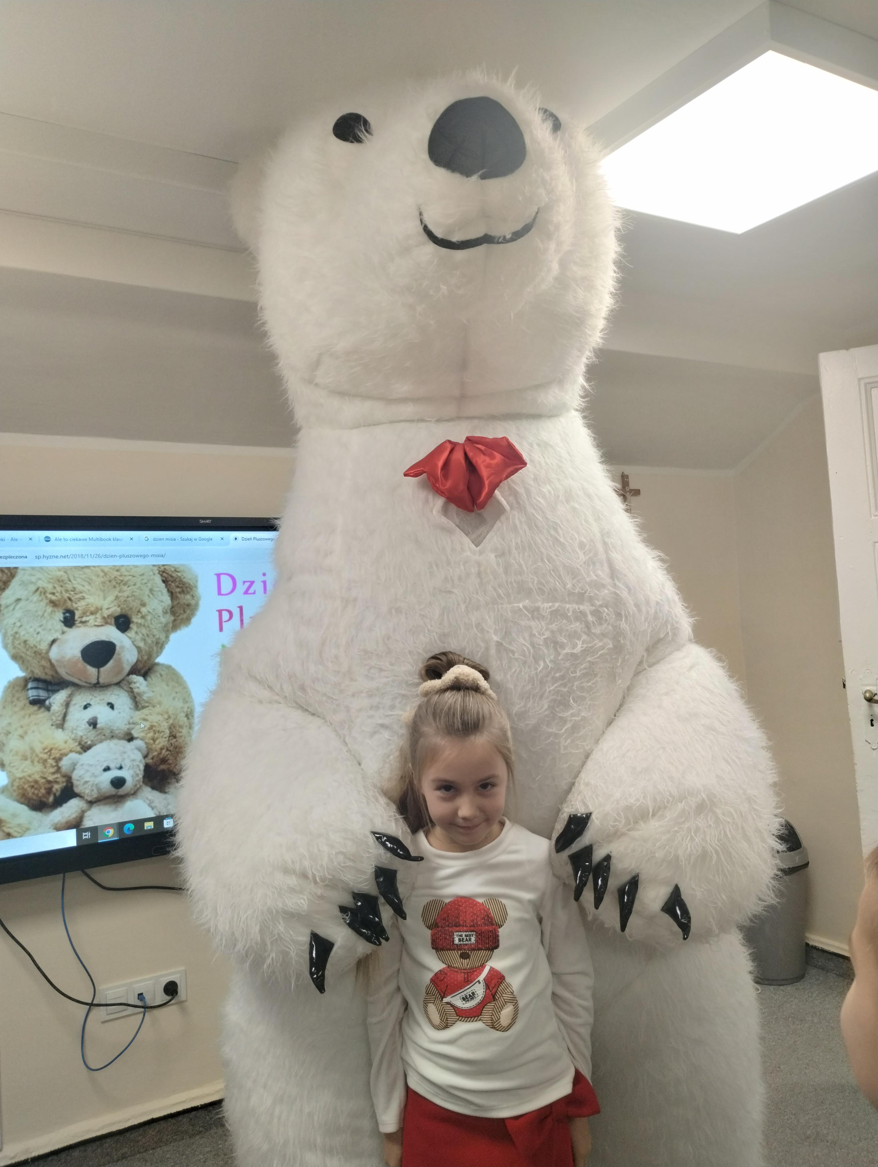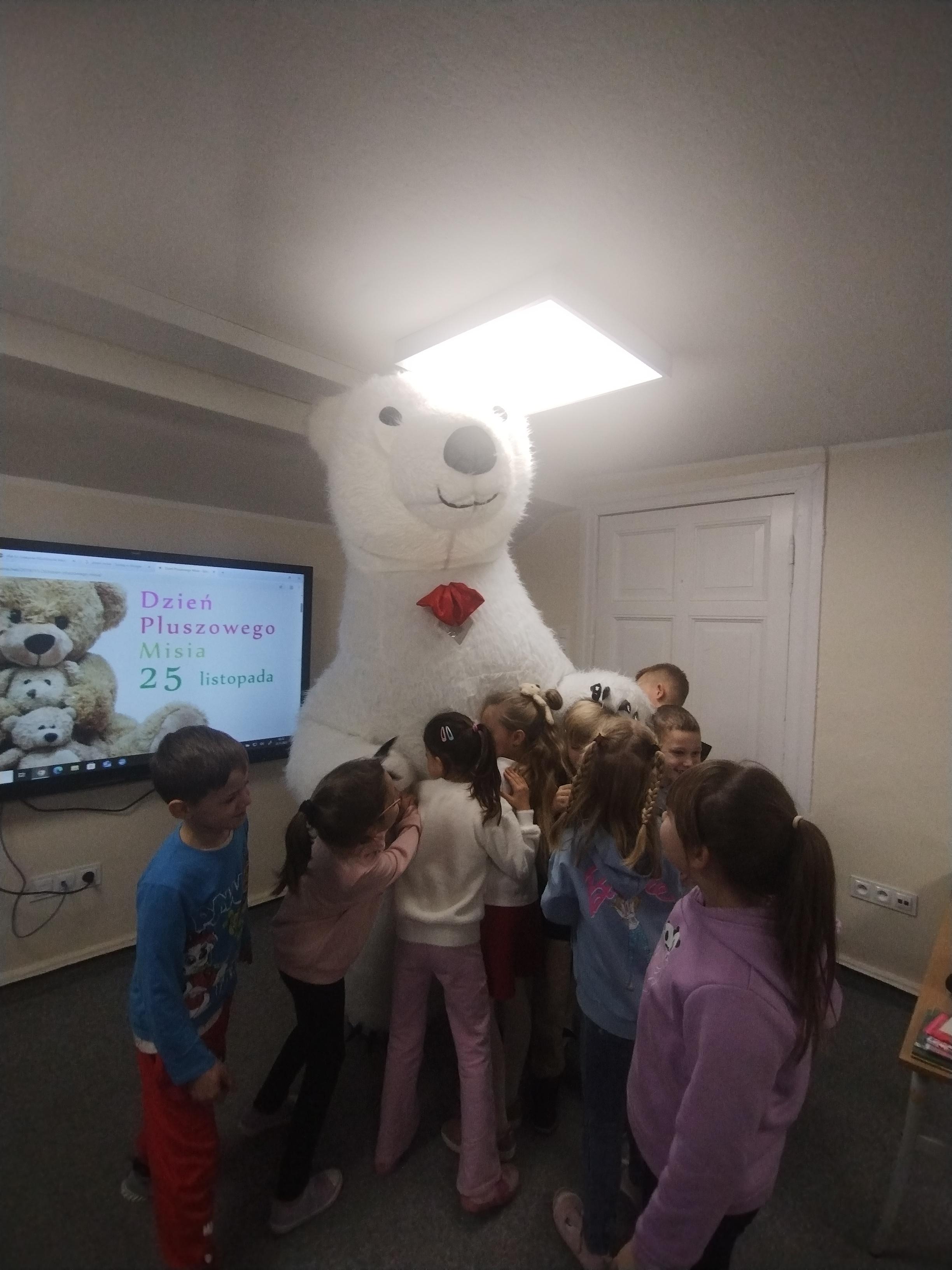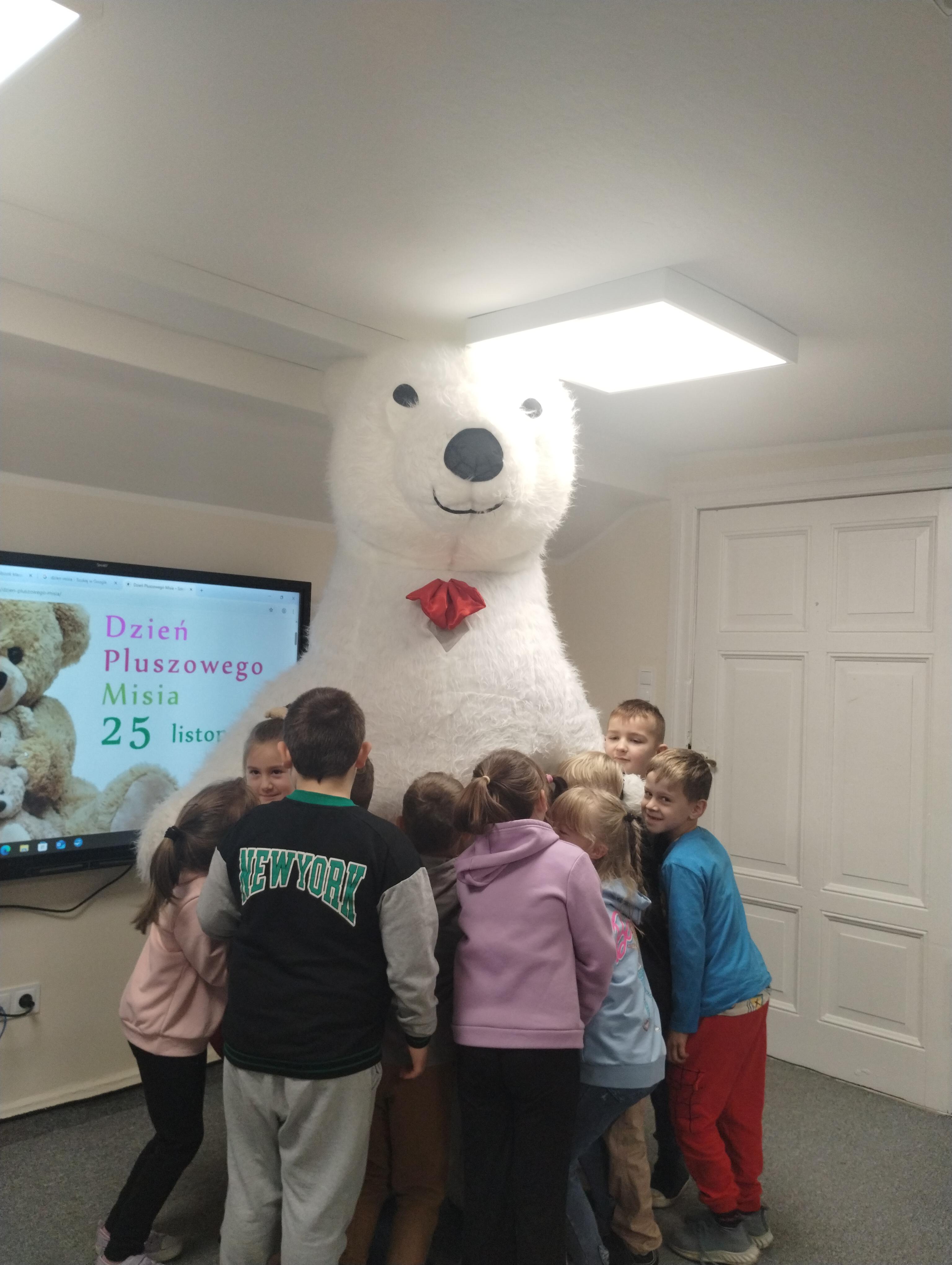 25 listopada obchodziliśmy Światowy Dzień Pluszowego Misia. Uczniowie klasy I aktywnie włączyli w obchody tego uroczego święta, bo miś to najlepszy przyjaciel dzieci i najmilsza przytulanka. Tego dnia dzieci przyniosły do szkoły swoje ulubione maskotki, aby wspólnie świętować. Były misie duże, małe, średnie, brązowe, różowe, … . Wszystkie były śliczne, ukochane oraz wyjątkowe. Motyw tej pluszowej maskotki przewijał się również na ubraniach dzieci. Na początku „misiowych zajęć” pierwszoklasiści obejrzeli film, który przybliżył im historię pluszowego misia. Następnie każde dziecko zaprezentowało swojego misia kolegom i koleżankom, uzupełniło paszport swojej przytulanki oraz ułożyło misia z puzzli. Wtem ktoś zapukał do naszych drzwi. Okazało się, że to biały, olbrzymi miś, którego głowa sięgała sufitu. Radości nie było końca. Pierwszacy przytulali się do misia, głaskali go i tańczyli z nim w rytm misiowej muzyki. Tego dnia rozmawialiśmy jeszcze o misiach, które są bohaterami bajek: Misiu Uszatku, Kubusiu Puchatku. Dzieci prezentowały też swoje ulubione książeczki o tych pluszowych maskotkach. Jedną z bajeczek przeczytaliśmy. Po jej wysłuchaniu dzieci stwierdziły, ze należy zawsze słuchać rodziców. Pluszowe maskotki towarzyszyły swoim opiekunom w czasie przerw i na lekcjach. Na koniec zajęć ogłoszony został klasowy konkurs plastyczny: Mój wymarzony miś”.