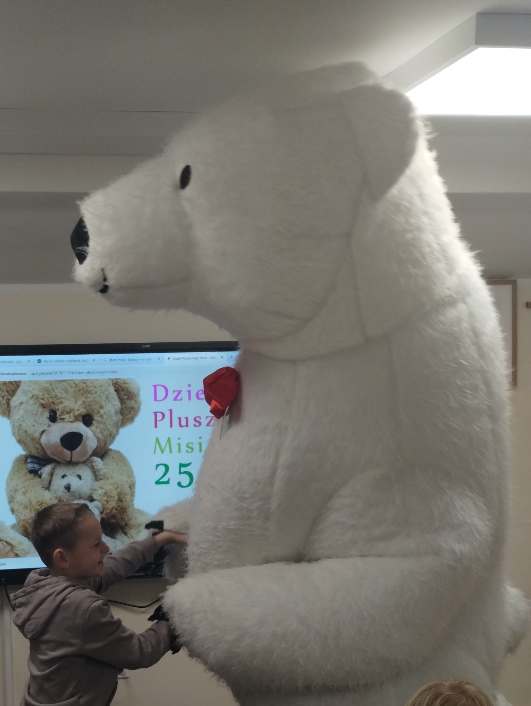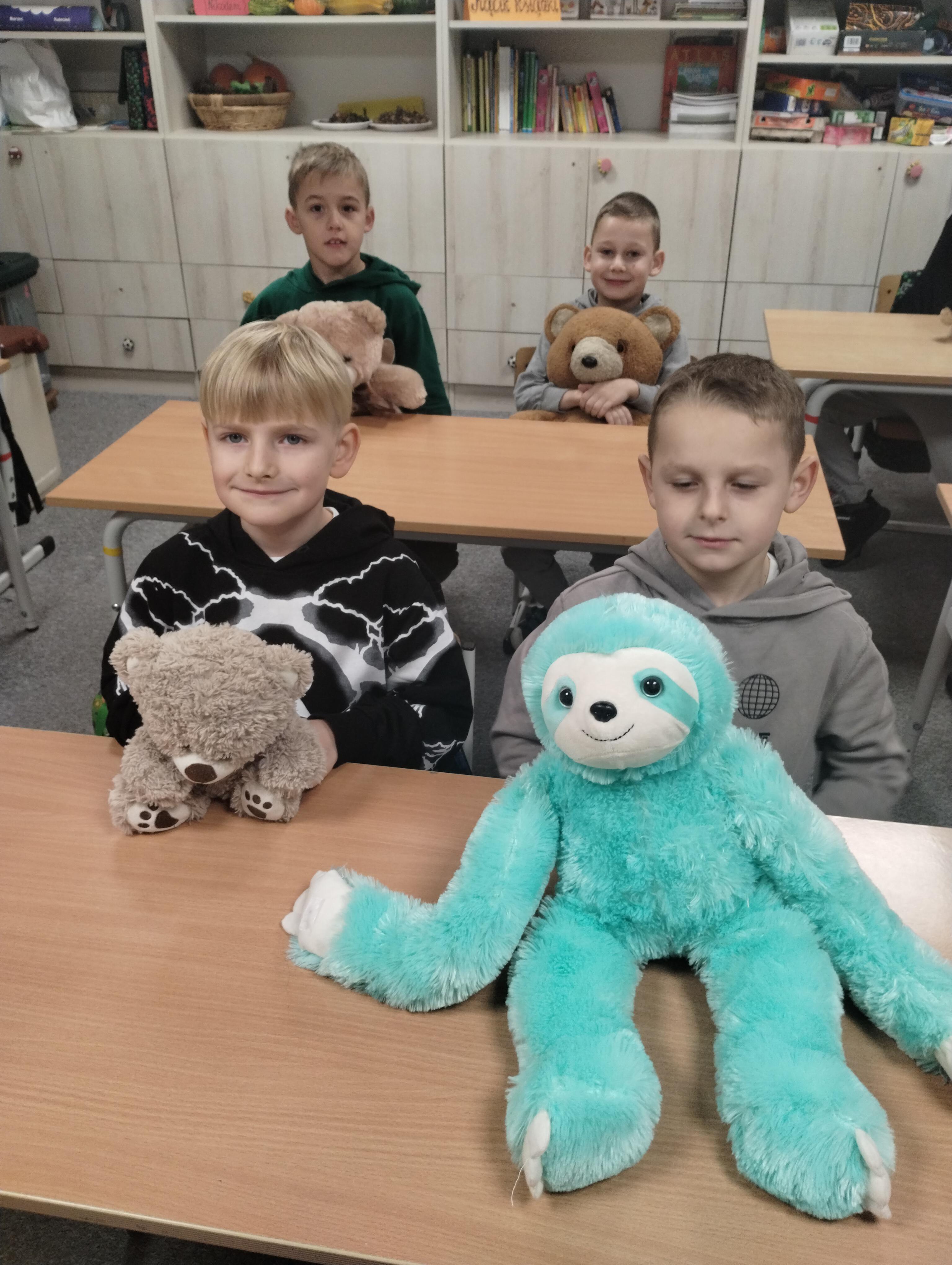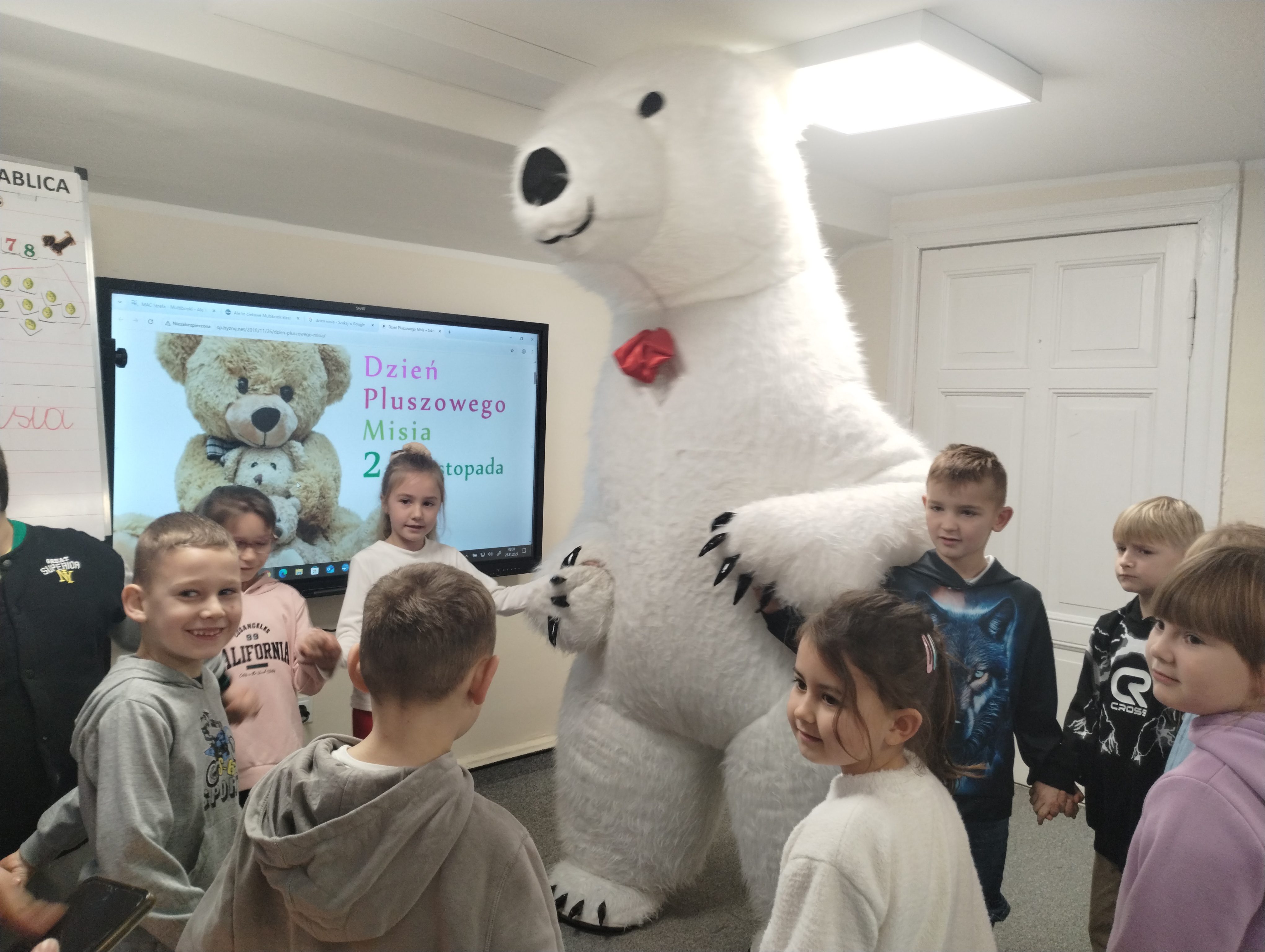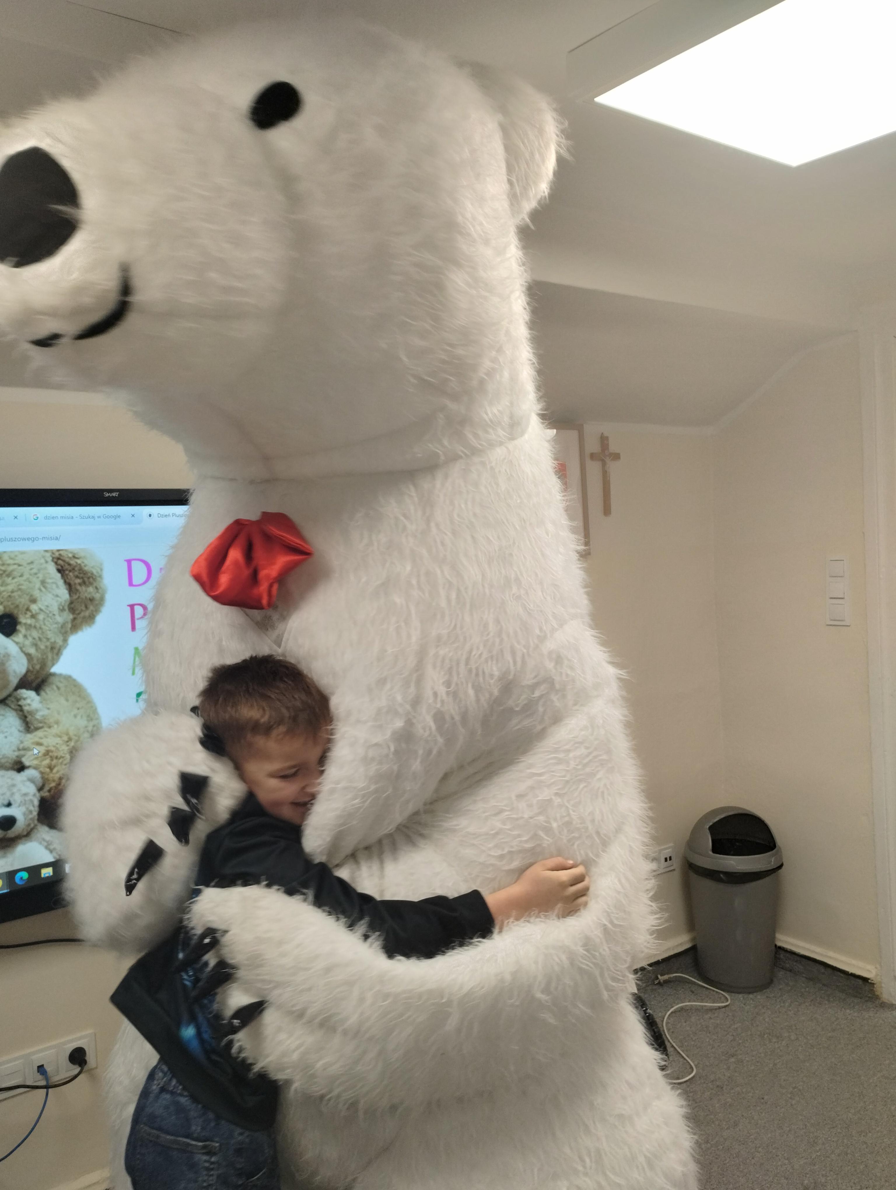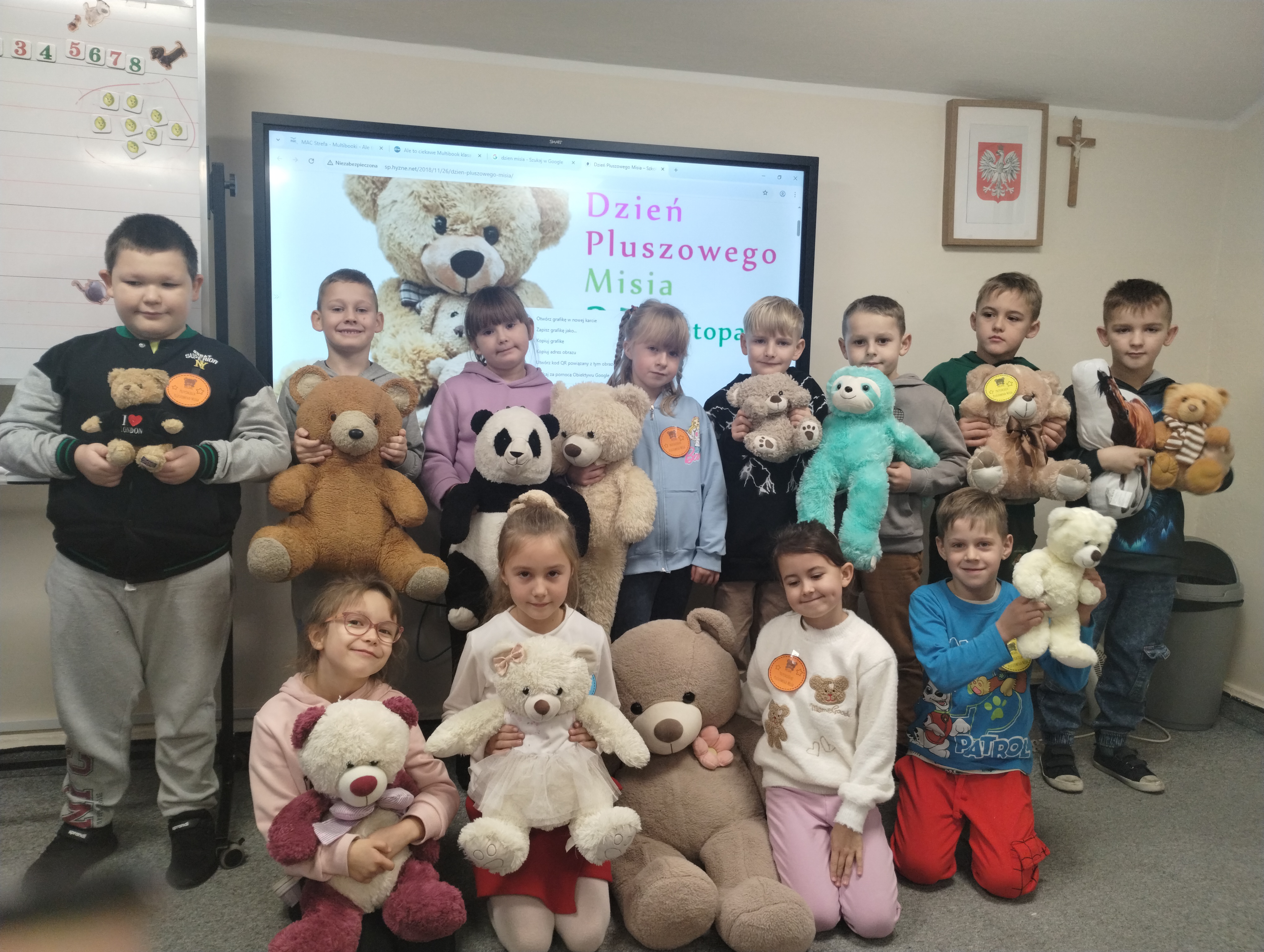 25 listopada obchodziliśmy Światowy Dzień Pluszowego Misia. Uczniowie klasy I aktywnie włączyli w obchody tego uroczego święta, bo miś to najlepszy przyjaciel dzieci i najmilsza przytulanka. Tego dnia dzieci przyniosły do szkoły swoje ulubione maskotki, aby wspólnie świętować. Były misie duże, małe, średnie, brązowe, różowe, … . Wszystkie były śliczne, ukochane oraz wyjątkowe. Motyw tej pluszowej maskotki przewijał się również na ubraniach dzieci. Na początku „misiowych zajęć” pierwszoklasiści obejrzeli film, który przybliżył im historię pluszowego misia. Następnie każde dziecko zaprezentowało swojego misia kolegom i koleżankom, uzupełniło paszport swojej przytulanki oraz ułożyło misia z puzzli. Wtem ktoś zapukał do naszych drzwi. Okazało się, że to biały, olbrzymi miś, którego głowa sięgała sufitu. Radości nie było końca. Pierwszacy przytulali się do misia, głaskali go i tańczyli z nim w rytm misiowej muzyki. Tego dnia rozmawialiśmy jeszcze o misiach, które są bohaterami bajek: Misiu Uszatku, Kubusiu Puchatku. Dzieci prezentowały też swoje ulubione książeczki o tych pluszowych maskotkach. Jedną z bajeczek przeczytaliśmy. Po jej wysłuchaniu dzieci stwierdziły, ze należy zawsze słuchać rodziców. Pluszowe maskotki towarzyszyły swoim opiekunom w czasie przerw i na lekcjach. Na koniec zajęć ogłoszony został klasowy konkurs plastyczny: Mój wymarzony miś”.