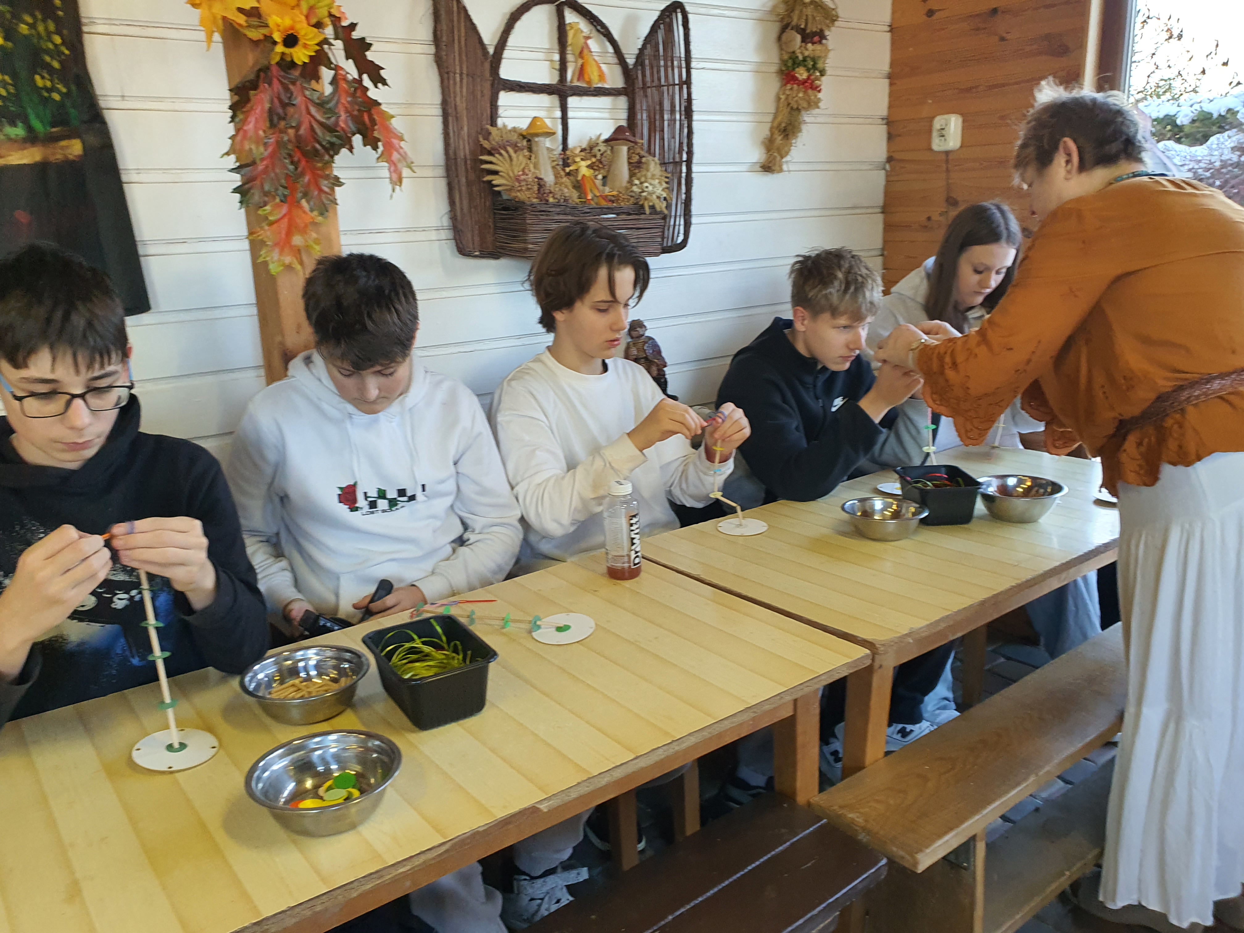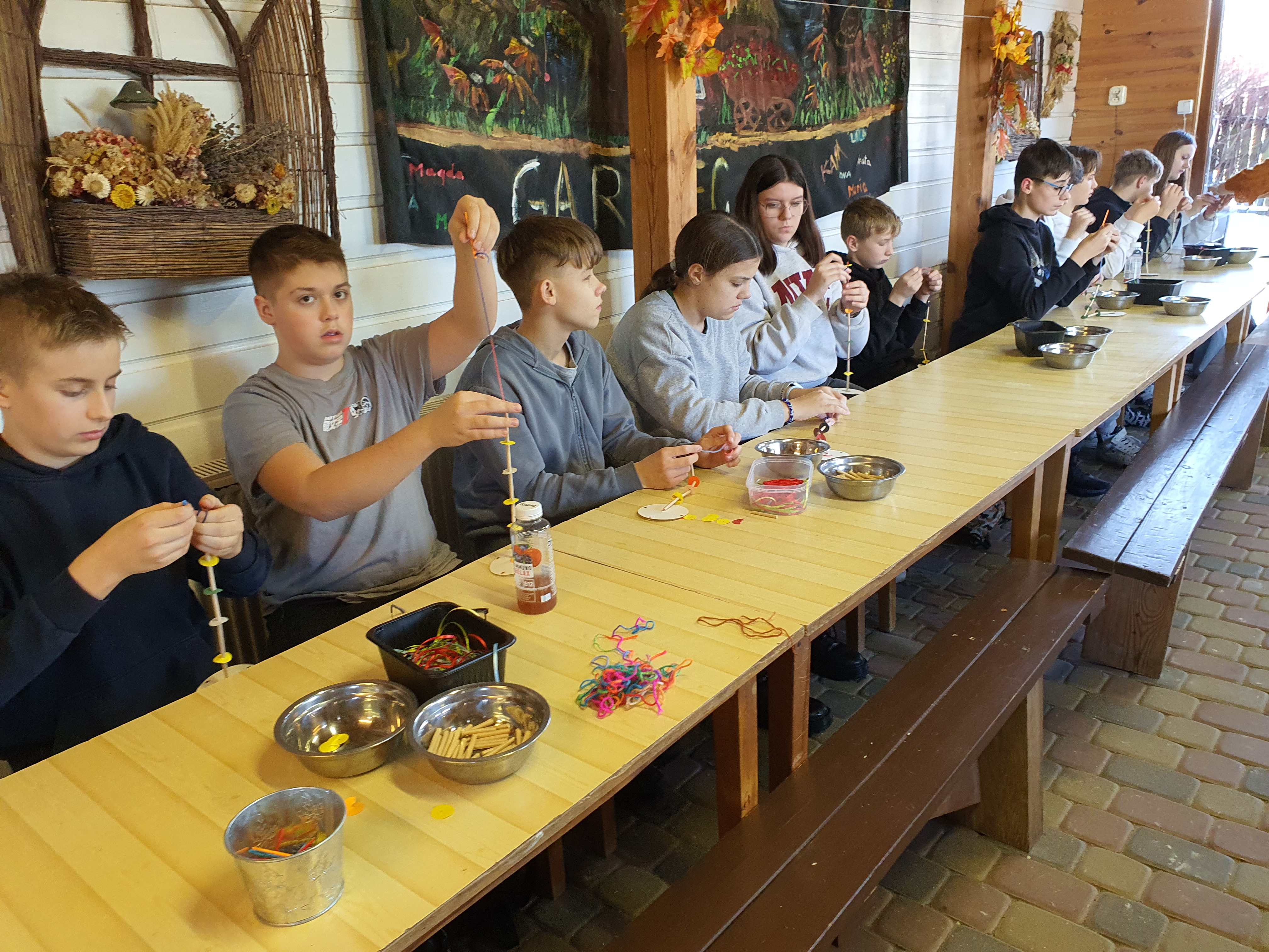 Kolejne warsztaty to wykonywanie ozdoby, zabawki dla kotka – domowego pupila. Za materiał posłużyła kolorowa włóczka, papierowe i tekturowe ozdoby w formie kwiatków, gwiazdek i barwnych kulek. Wszystkie wykonane prace uczniowie zabierali z sobą do domu. W sklepiku z oryginalnymi pamiątkami można było zaopatrzyć się w upominki, maskotki i pamiątki z pobytu w skansenie.