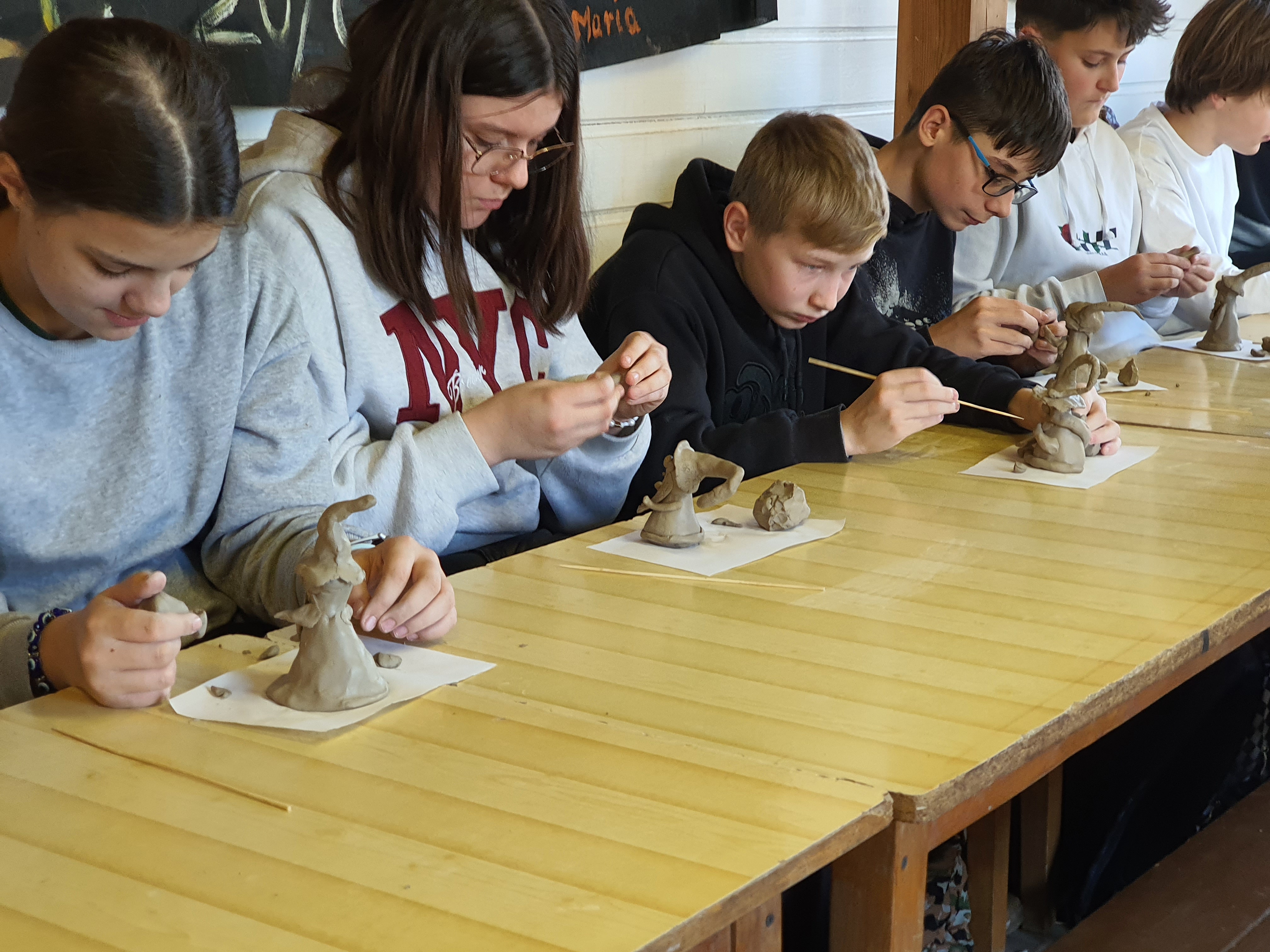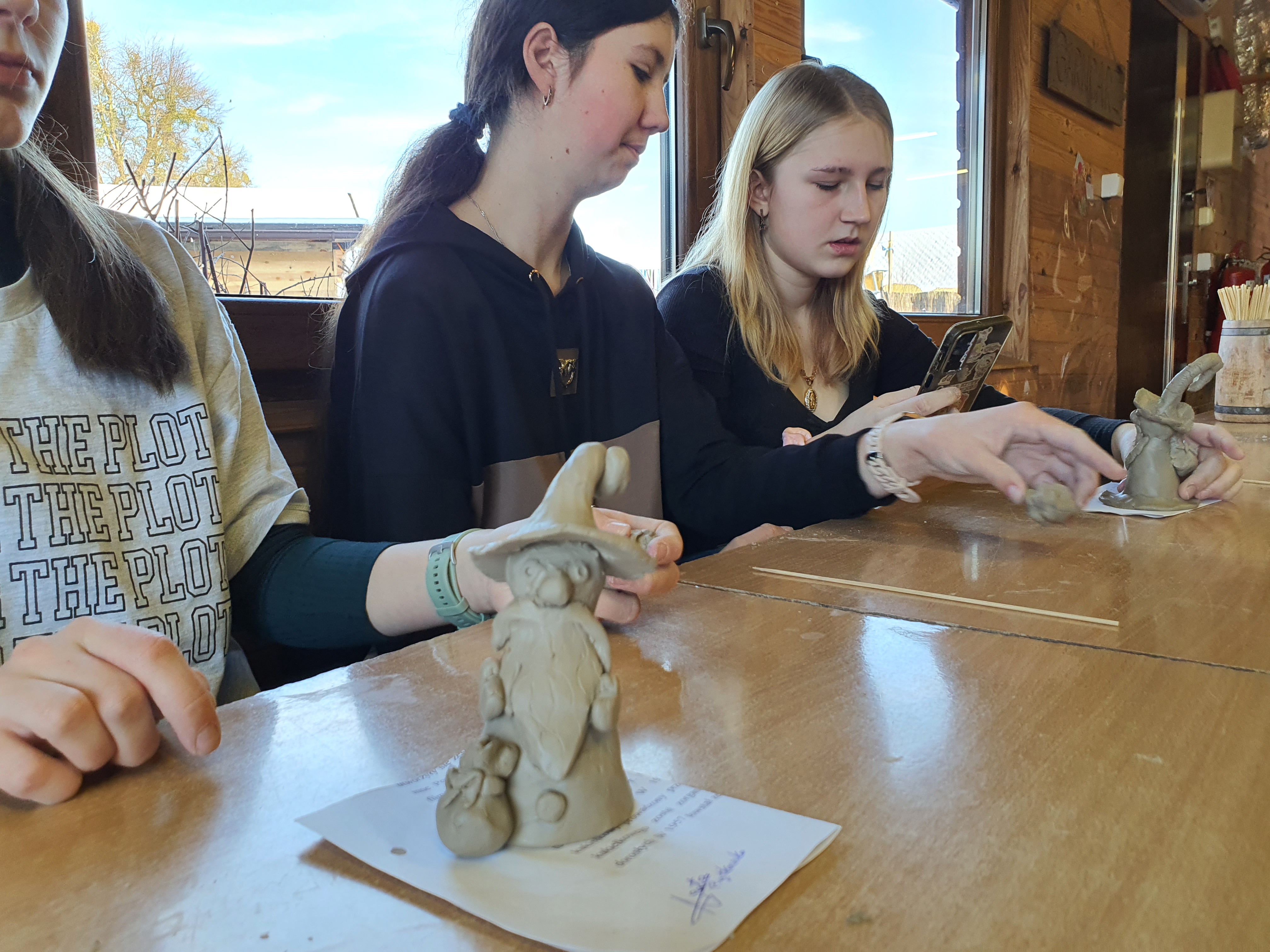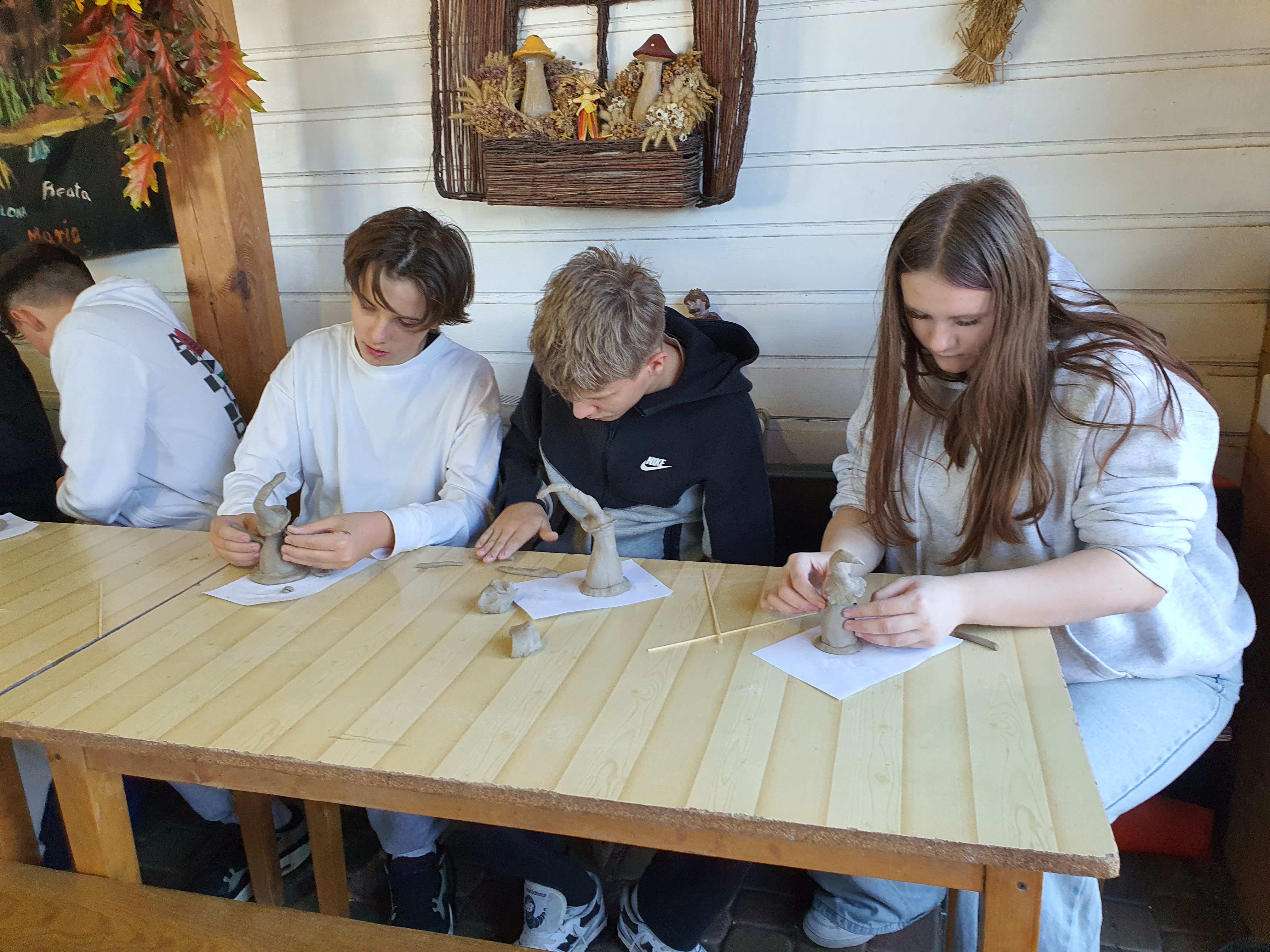 W Sali, ozdobionej artystycznymi wytworami z gliny, zasuszonych roślin i owoców, drewna oraz materiałów włókienniczych, odbyły się warsztaty ceramiczne. Pod okiem pani instruktorki uczniowie tworzyli figurki skrzatów. Krok po kroku, od przygotowania stanowiska pracy, urobienia gliny, aż do końcowego efektu, w rękach młodych twórców powstawały prawdziwe dzieła sztuki.