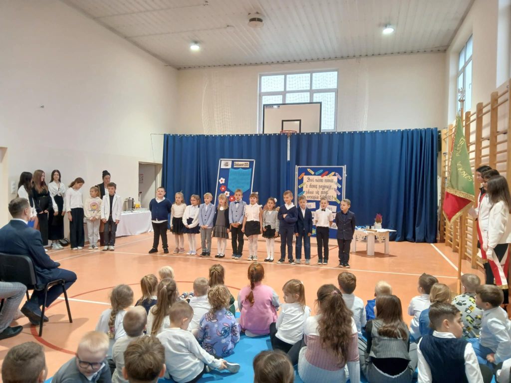 Na samym początku wszystkich zebranych serdecznie powitała wychowawczyni klasy I pani Katarzyna Bach. Następnie uczniowie zaprezentowali program artystyczny. Pochwalili się swoimi talentami: recytowali wiersze i śpiewali piosenki. Wykazali się wiedzą, jaką już zdobyli w szkole. Po części artystycznej nadszedł dugo wyczekiwany moment. W niezwykle podniosłej atmosferze przed pocztem sztandarowym pierwszacy ślubowali być dobrymi Polakami, godnie reprezentować swoją szkołę, swym zachowaniem i nauką sprawiać radość rodzicom i nauczycielom. Po ślubowaniu pani dyrektor Hanna Kirchhof symbolicznym ołówkiem dokonała aktu pasowania. Od tej chwili pierwszoklasiści stali się nowymi członkami naszej szkolnej rodziny. Z tej okazji oprócz wielu pięknych życzeń otrzymali pamiątkowe dyplomy, legitymacje szkolne, książki, słodycze oraz wiele innych upominków. Po części oficjalnej był czas na pamiątkowe zdjęcia oraz słodki poczęstunek przygotowany przez rodziców.
