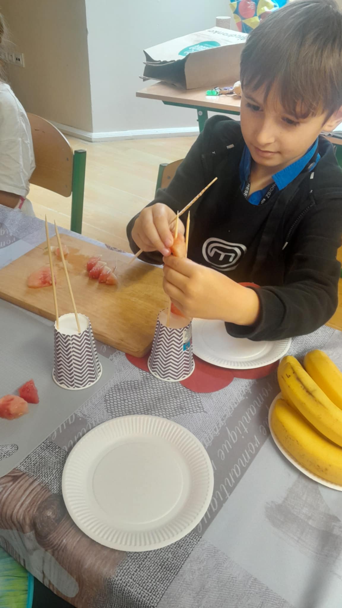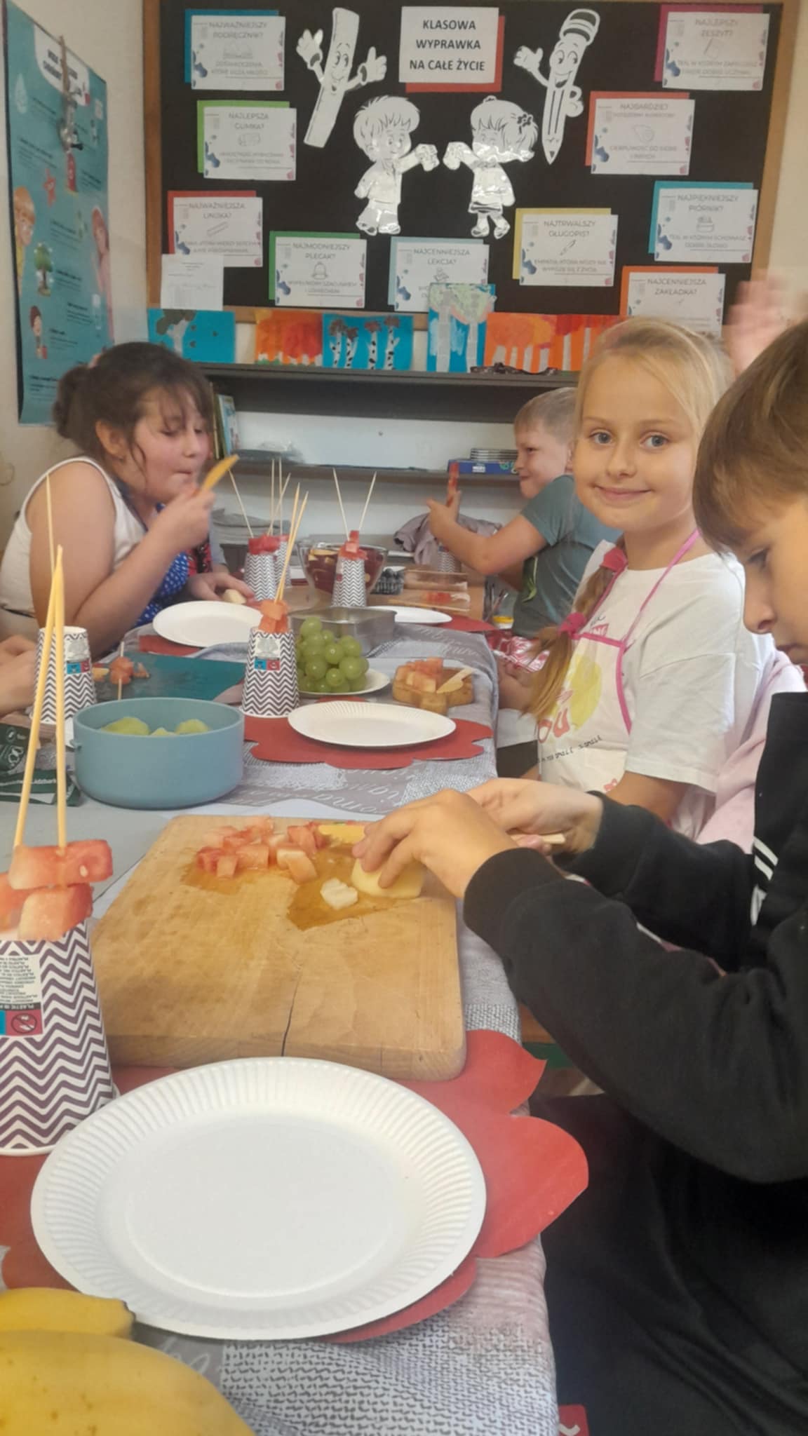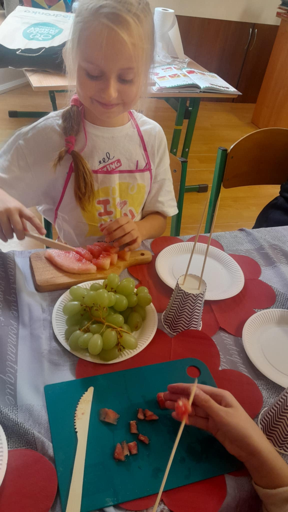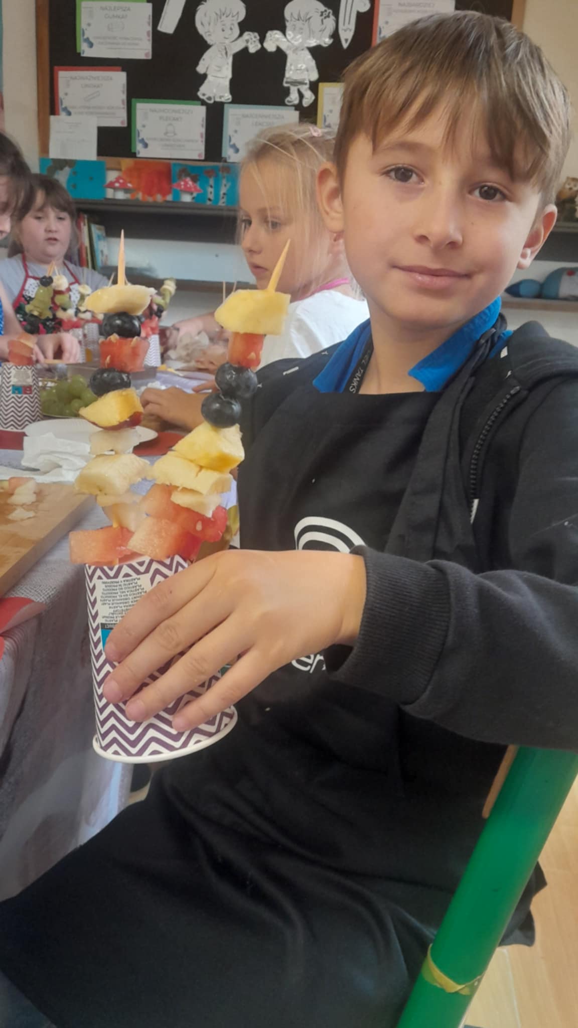 Dziś uczniowie klasy II wzięli udział w wyjątkowych zajęciach kreatywnych o zdrowym odżywianiu. Zajęcia poprowadziła ich koleżanka, Alicja Lewalska, która w ciekawy sposób zachęciła wszystkich do jedzenia owoców i dbania o swoje zdrowie. Na początku Ala przypomniała wszystkim, jak ważna jest higiena podczas przygotowywania posiłków - uczniowie dokładnie umyli ręce, a stanowiska pracy zostały odpowiednio przygotowane. Następnie dziewczynka udzieliła kolegom i koleżankom instrukcji, jak krok po kroku wykonać kolorowe szaszłyki owocowe. Na patyczkach pojawiły się winogrona, banany, jabłka, kiwi, borówki, gruszki oraz arbuz. Każde dziecko mogło stworzyć własną, wyjątkową kompozycję smaków i kolorów. Zajęcia były nie tylko smaczne, ale też pouczające. W dzisiejszych czasach, gdy na stołach często królują niezdrowe przekąski i słodkości, takie zajęcia są szczególnie ważne. Pokazują dzieciom, że zdrowe odżywianie to podstawa dobrego życia. Dzięki zajęciom dzieci przekonały się, że zdrowe odżywianie ma ogromne znaczenie dla zdrowia i samopoczucia, a przygotowywanie posiłków może być przyjemnym i ciekawym doświadczeniem. Dziękujemy Alicji za pomysł, zaangażowanie i wspaniałe przeprowadzenie zajęć! Brawo dla klasy II za aktywny udział, kreatywność i świetną współpracę!