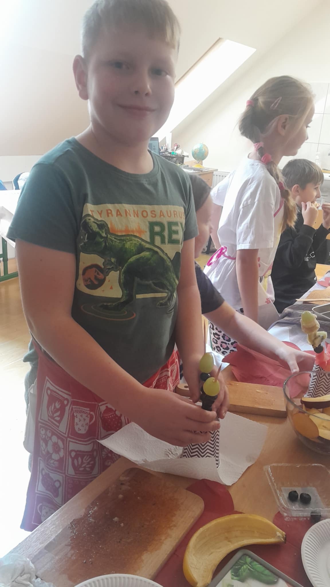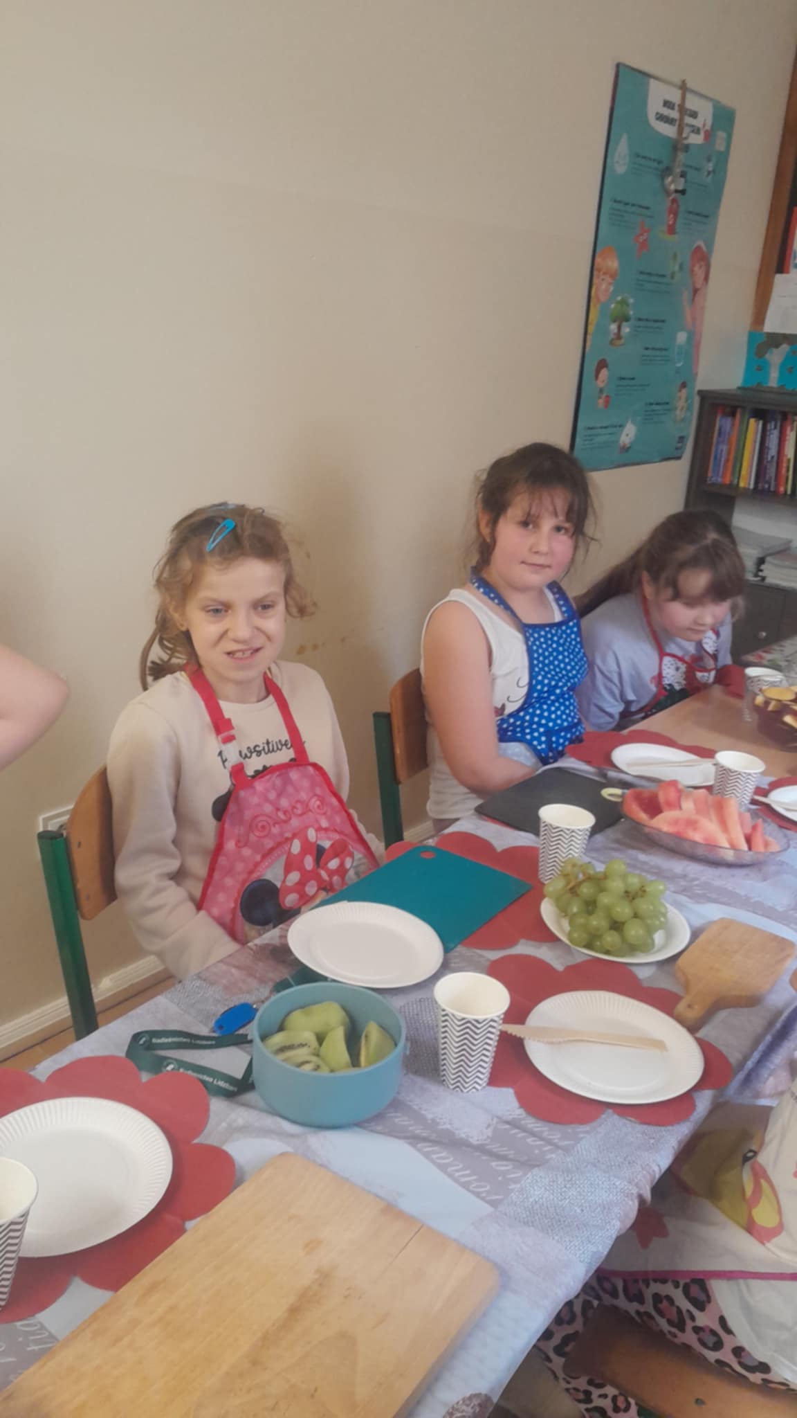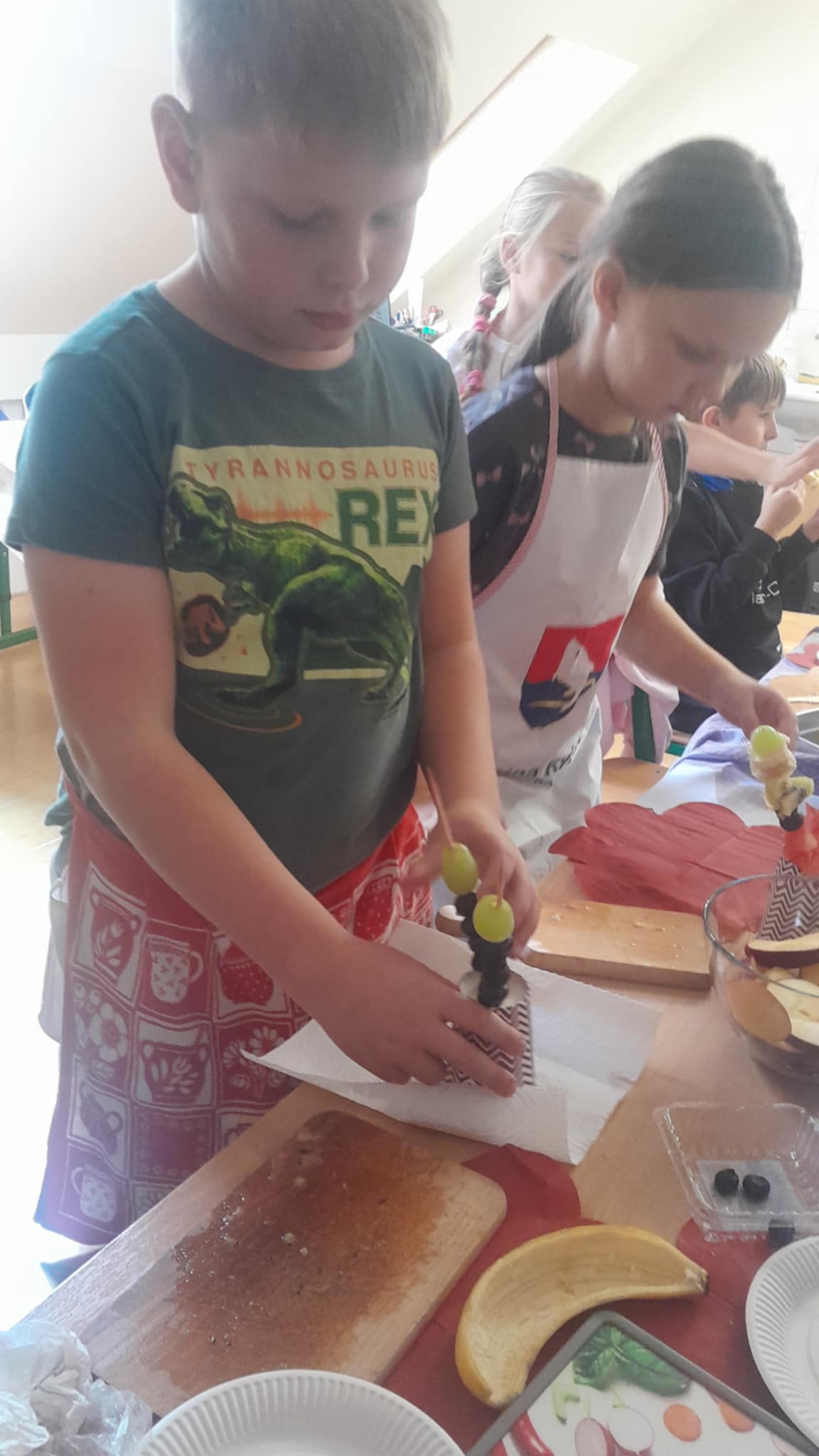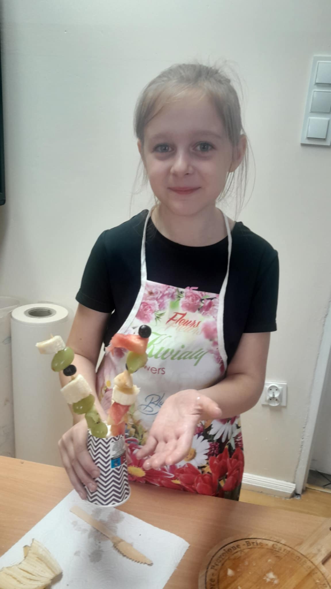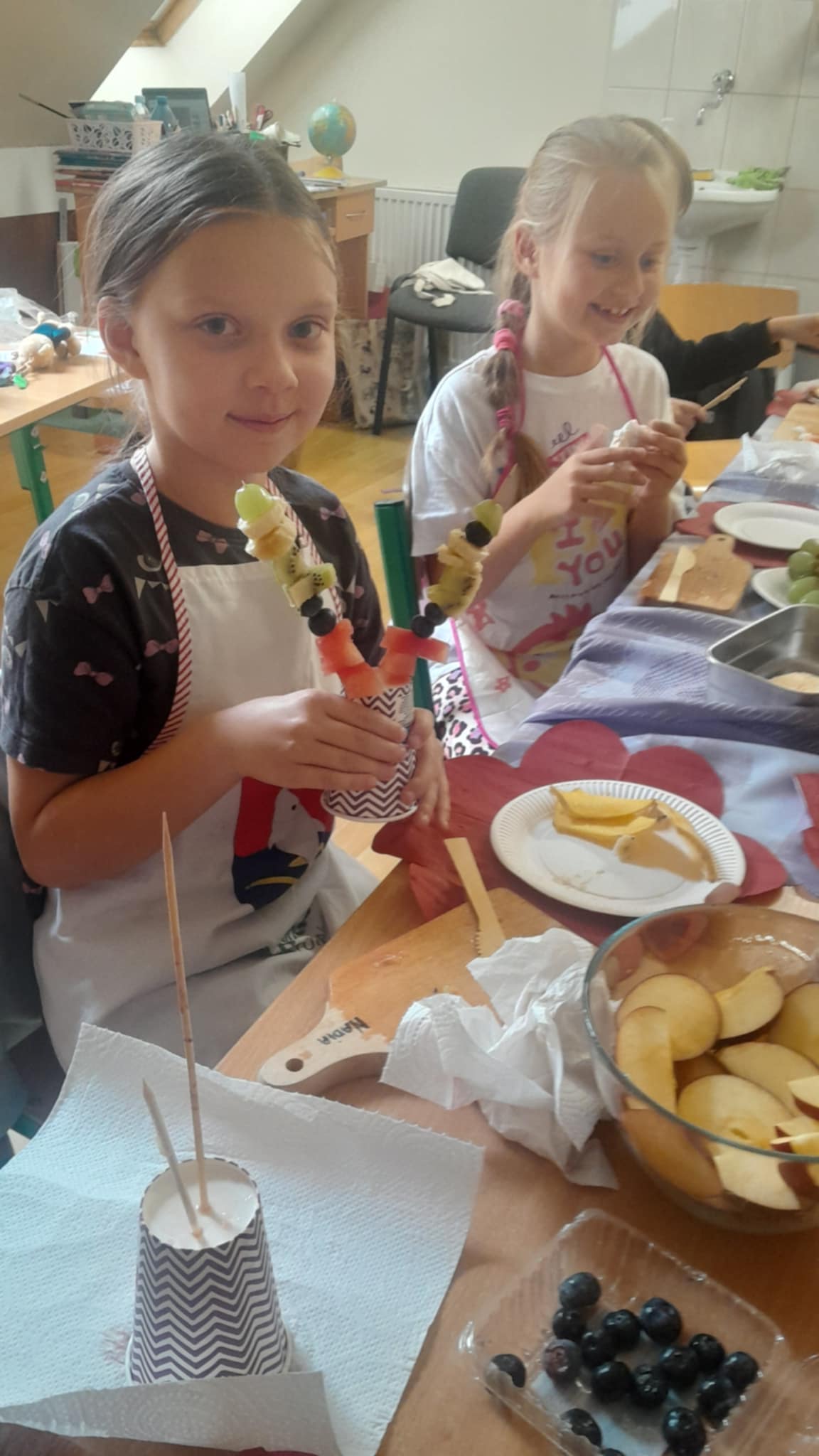 Dziś uczniowie klasy II wzięli udział w wyjątkowych zajęciach kreatywnych o zdrowym odżywianiu. Zajęcia poprowadziła ich koleżanka, Alicja Lewalska, która w ciekawy sposób zachęciła wszystkich do jedzenia owoców i dbania o swoje zdrowie. Na początku Ala przypomniała wszystkim, jak ważna jest higiena podczas przygotowywania posiłków - uczniowie dokładnie umyli ręce, a stanowiska pracy zostały odpowiednio przygotowane. Następnie dziewczynka udzieliła kolegom i koleżankom instrukcji, jak krok po kroku wykonać kolorowe szaszłyki owocowe. Na patyczkach pojawiły się winogrona, banany, jabłka, kiwi, borówki, gruszki oraz arbuz. Każde dziecko mogło stworzyć własną, wyjątkową kompozycję smaków i kolorów. Zajęcia były nie tylko smaczne, ale też pouczające. W dzisiejszych czasach, gdy na stołach często królują niezdrowe przekąski i słodkości, takie zajęcia są szczególnie ważne. Pokazują dzieciom, że zdrowe odżywianie to podstawa dobrego życia. Dzięki zajęciom dzieci przekonały się, że zdrowe odżywianie ma ogromne znaczenie dla zdrowia i samopoczucia, a przygotowywanie posiłków może być przyjemnym i ciekawym doświadczeniem. Dziękujemy Alicji za pomysł, zaangażowanie i wspaniałe przeprowadzenie zajęć! Brawo dla klasy II za aktywny udział, kreatywność i świetną współpracę!