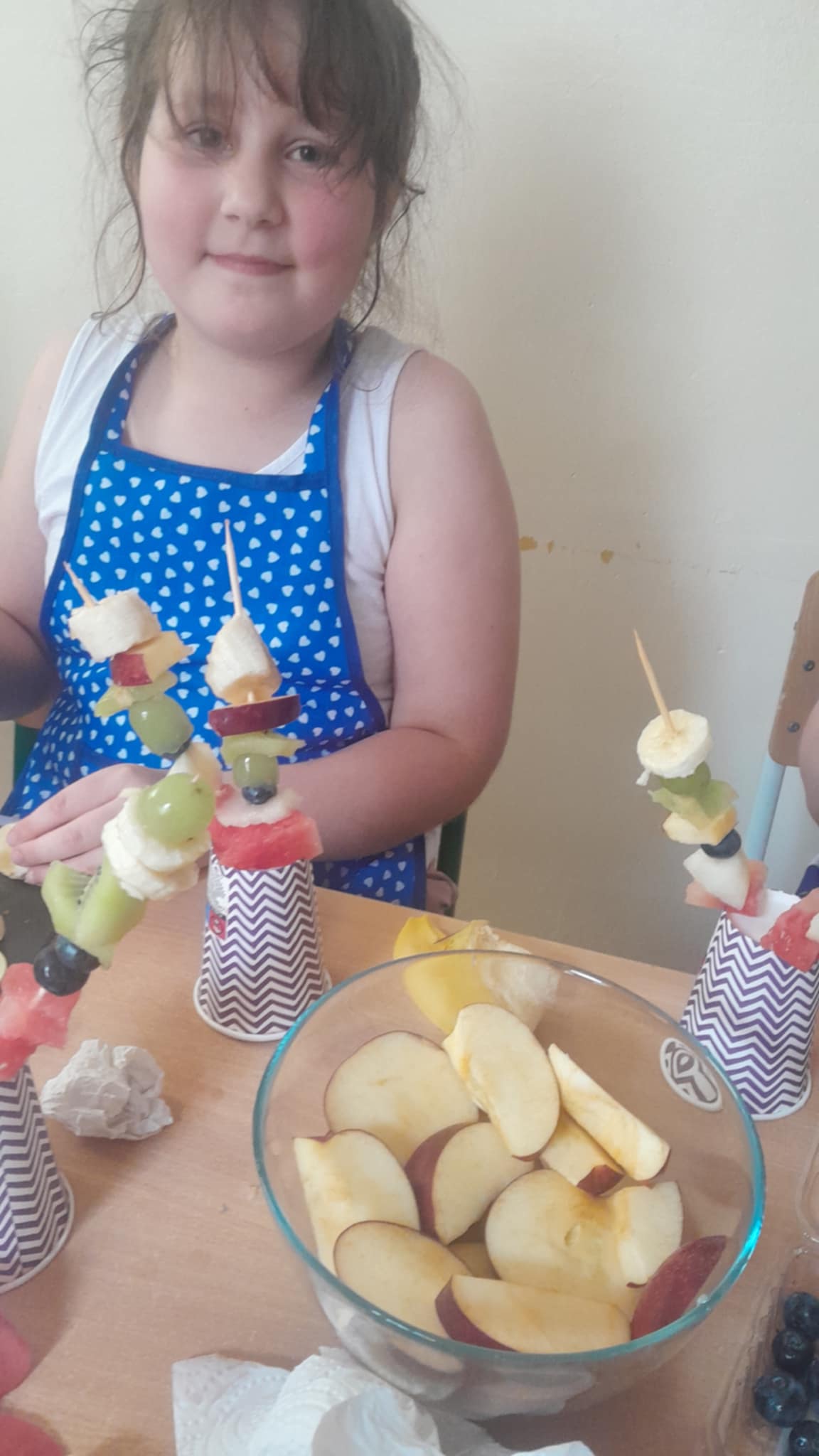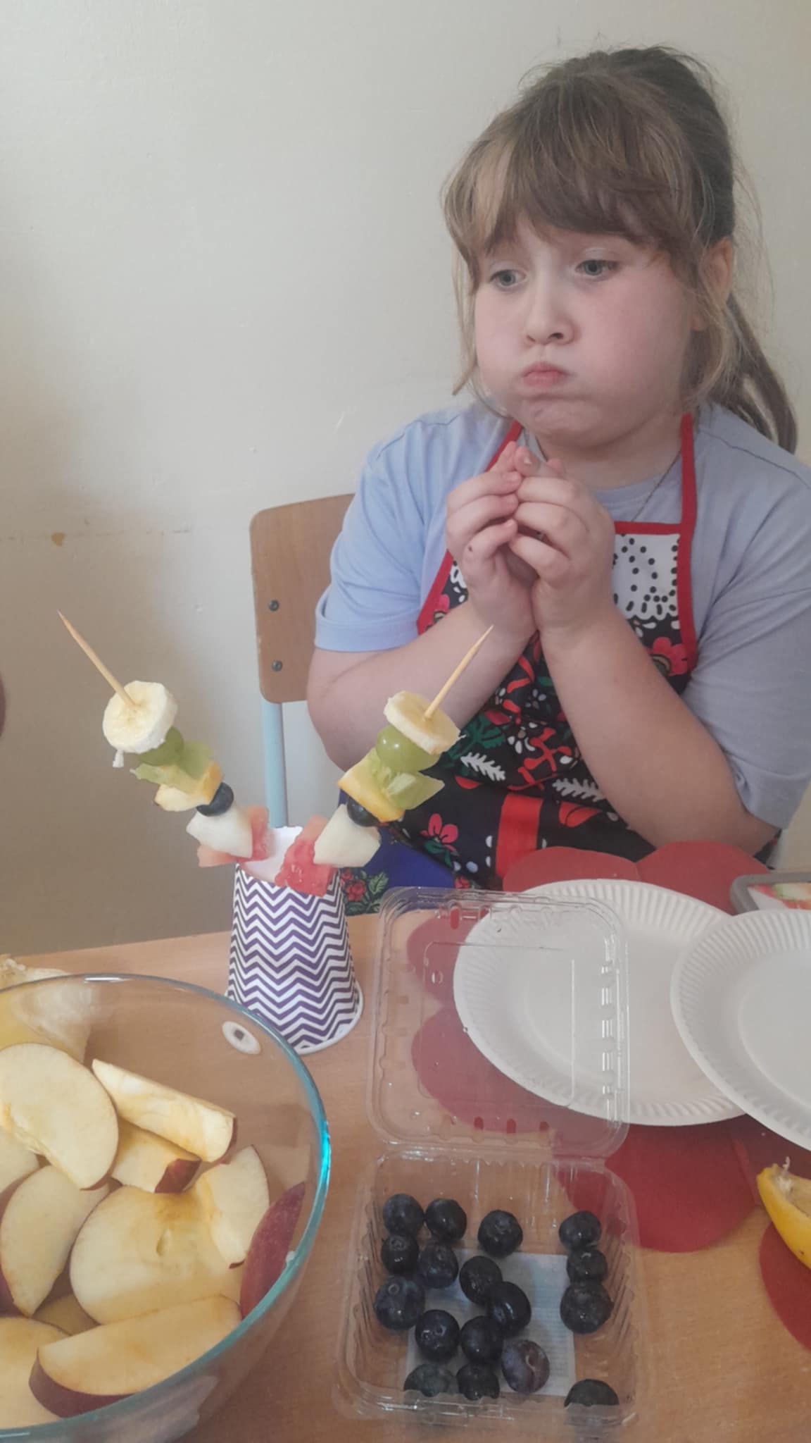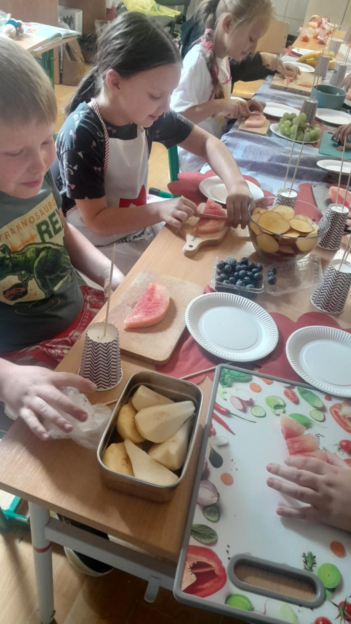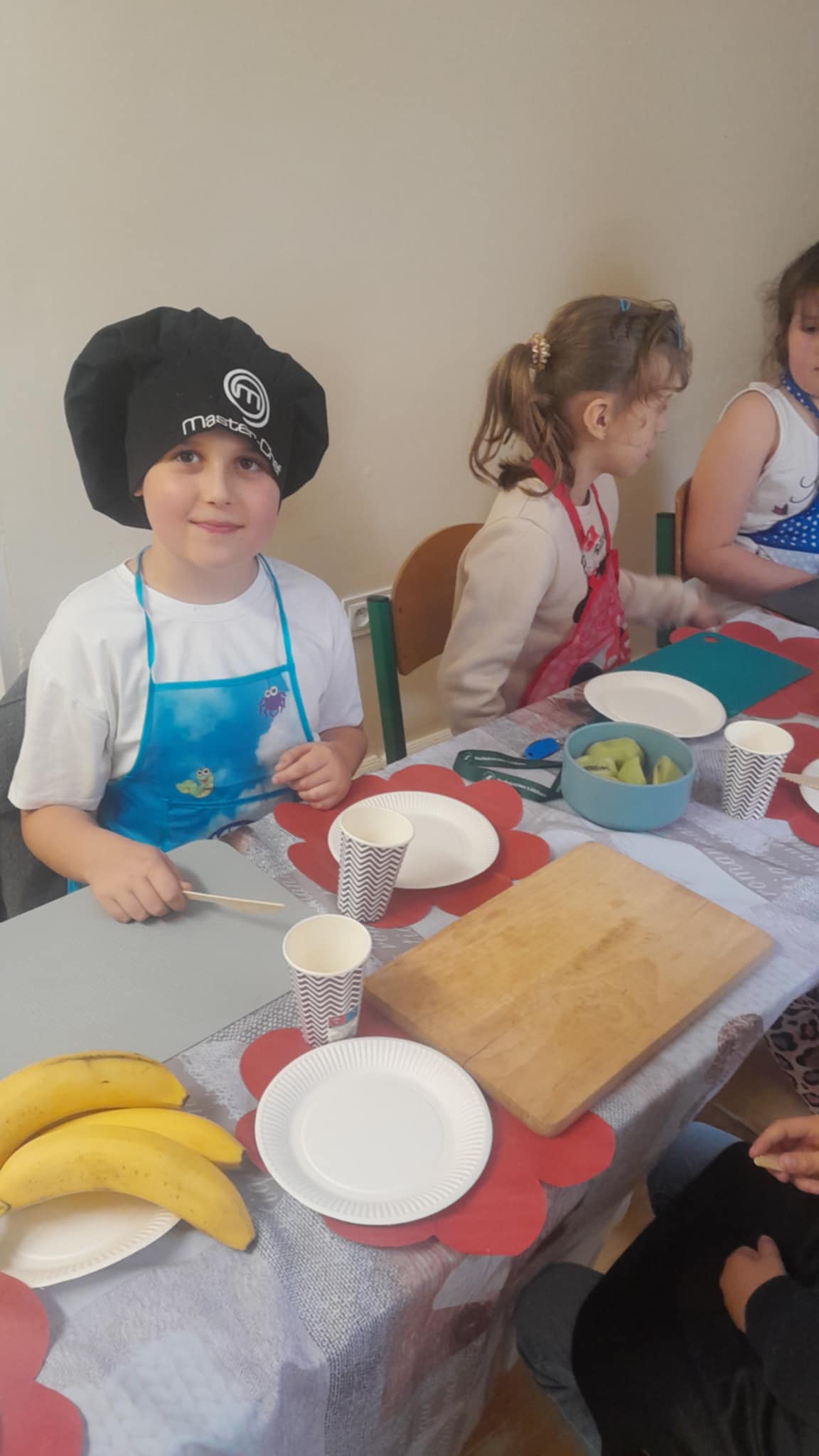 Dziś uczniowie klasy II wzięli udział w wyjątkowych zajęciach kreatywnych o zdrowym odżywianiu. Zajęcia poprowadziła ich koleżanka, Alicja Lewalska, która w ciekawy sposób zachęciła wszystkich do jedzenia owoców i dbania o swoje zdrowie. Na początku Ala przypomniała wszystkim, jak ważna jest higiena podczas przygotowywania posiłków - uczniowie dokładnie umyli ręce, a stanowiska pracy zostały odpowiednio przygotowane. Następnie dziewczynka udzieliła kolegom i koleżankom instrukcji, jak krok po kroku wykonać kolorowe szaszłyki owocowe. Na patyczkach pojawiły się winogrona, banany, jabłka, kiwi, borówki, gruszki oraz arbuz. Każde dziecko mogło stworzyć własną, wyjątkową kompozycję smaków i kolorów. Zajęcia były nie tylko smaczne, ale też pouczające. W dzisiejszych czasach, gdy na stołach często królują niezdrowe przekąski i słodkości, takie zajęcia są szczególnie ważne. Pokazują dzieciom, że zdrowe odżywianie to podstawa dobrego życia. Dzięki zajęciom dzieci przekonały się, że zdrowe odżywianie ma ogromne znaczenie dla zdrowia i samopoczucia, a przygotowywanie posiłków może być przyjemnym i ciekawym doświadczeniem. Dziękujemy Alicji za pomysł, zaangażowanie i wspaniałe przeprowadzenie zajęć! Brawo dla klasy II za aktywny udział, kreatywność i świetną współpracę!