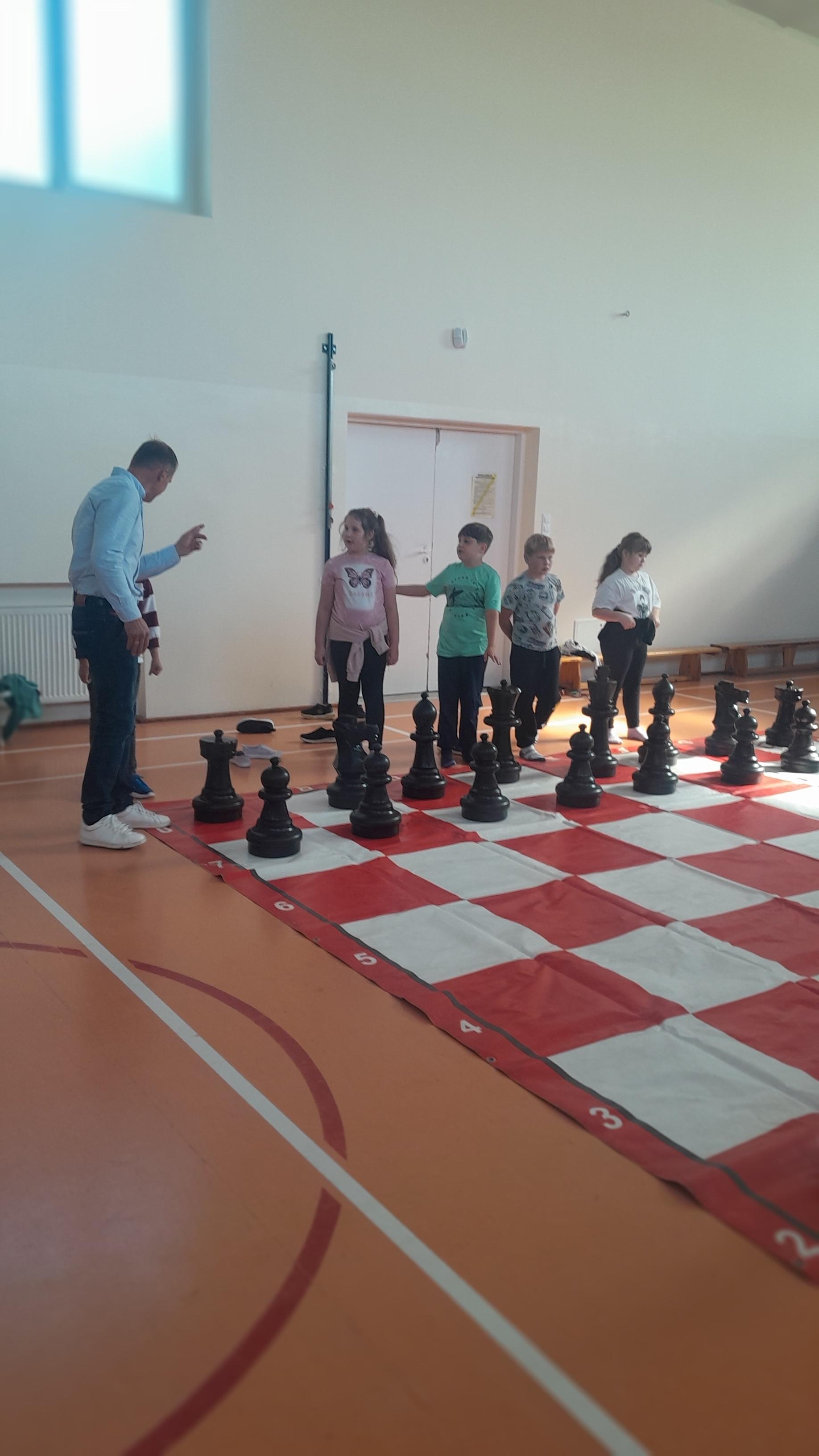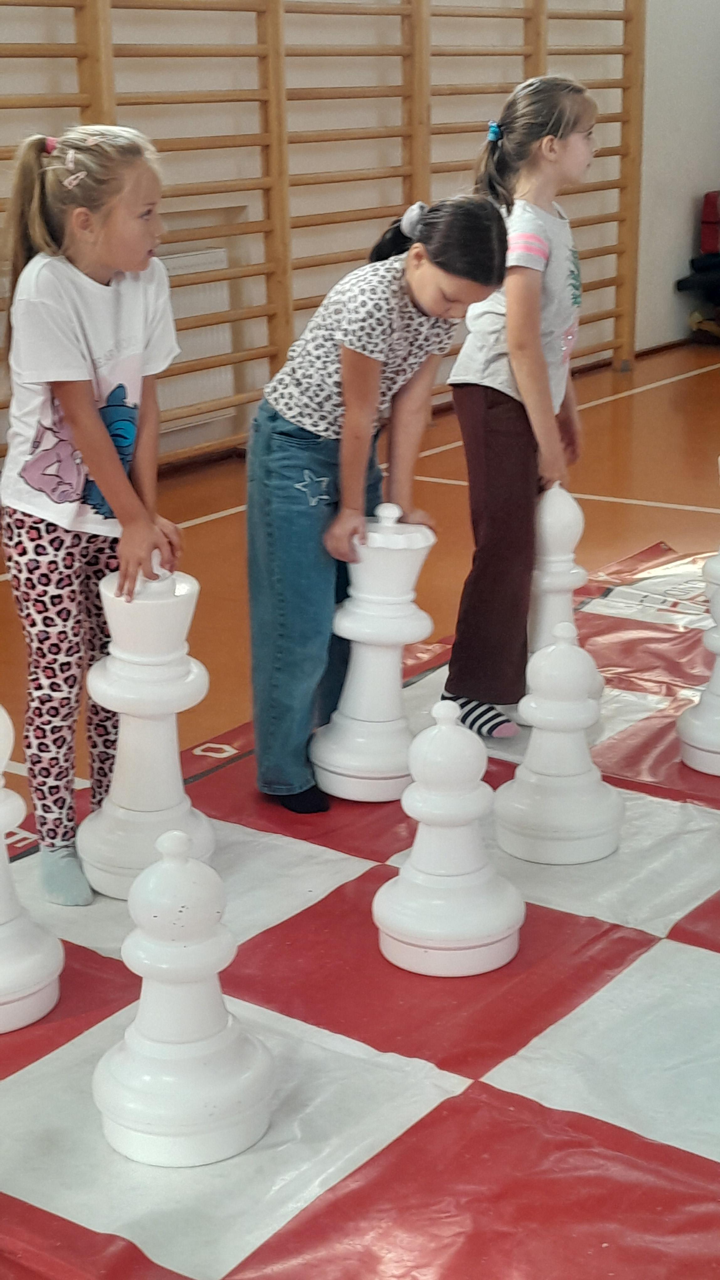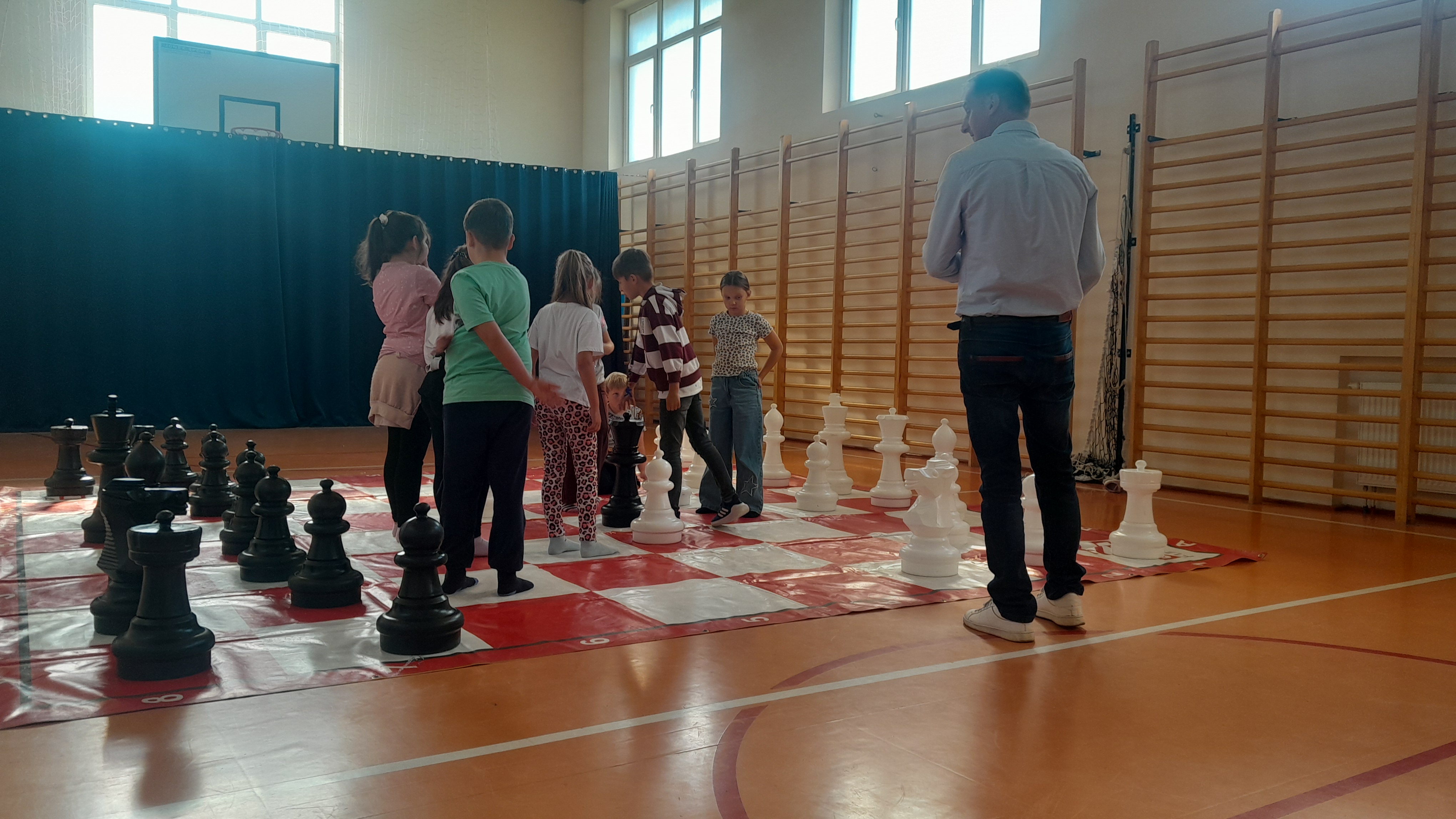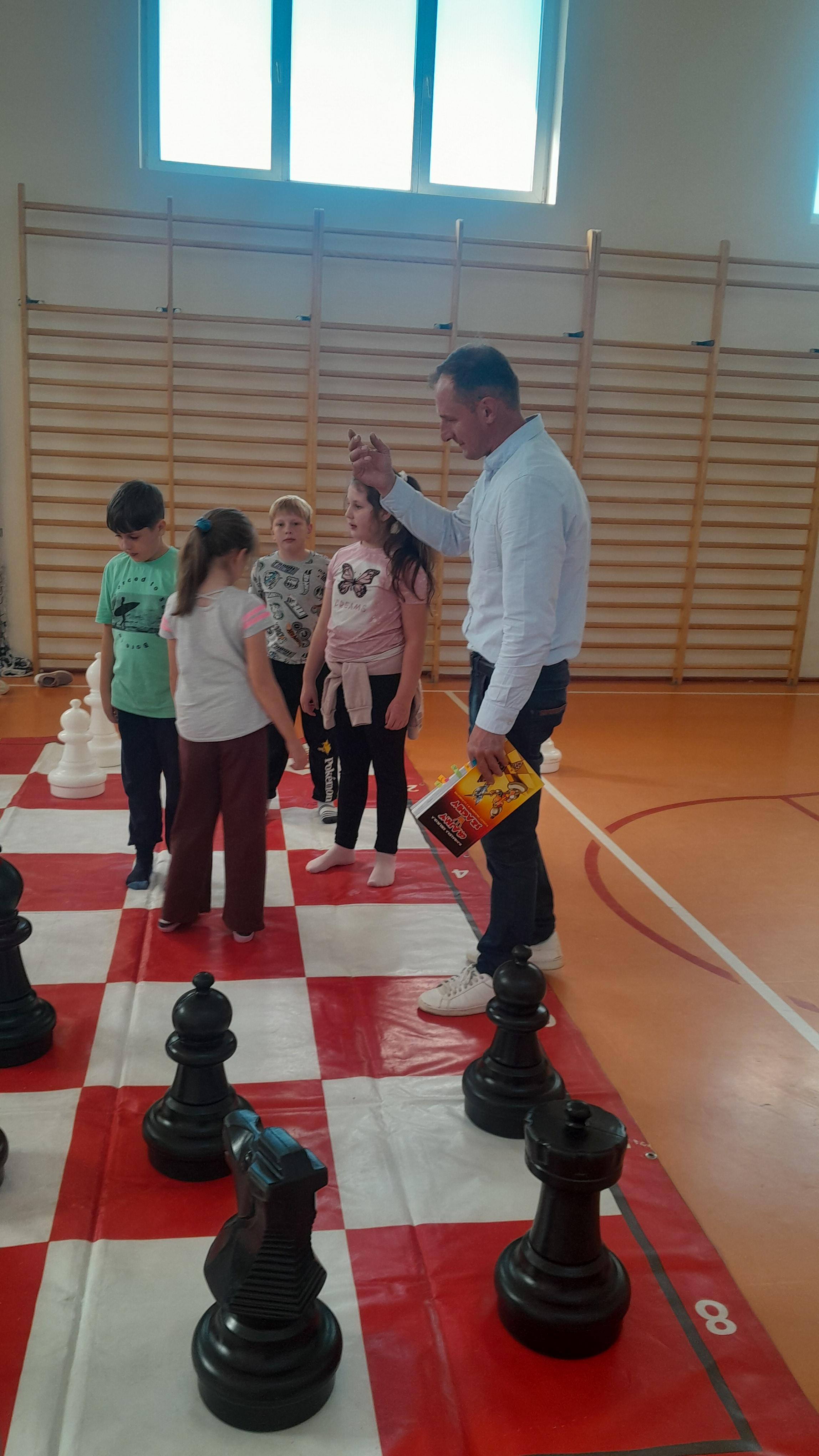 Zajęcia kreatywne to czas, w którym uczniowie mogą rozwijać swoje pasje, uczyć się współpracy i odkrywać nowe zainteresowania poprzez zabawę i różnorodne aktywności. To moment, w którym nauka łączy się z radością i inspiracją, a dzieci mają okazję doświadczać czegoś wyjątkowego. Dzisiejsze zajęcia rozwijające kreatywność w klasie II były wyjątkowe, bowiem uczniowie mogli sprawdzić swoje umiejętności w szachach plenerowych, gdzie pionki i figury miały naprawdę imponujące rozmiary. Dzięki uprzejmości pana Tomasza Bieleckiego – taty Kornela – dzieci mogły przenieść się w niezwykły świat królewskiej gry i poczuć się jak prawdziwi mistrzowie szachownicy. Pan Tomasz wraz z Kornelem nie tylko rozstawili szachy, ale i w ciekawy sposób opowiadali o zasadach gry. Wspólnie zdradzali różne patenty i strategie, które mogą pomóc w przyszłych rozgrywkach. Uczniowie mieli okazję zadawać pytania, rozwiązywać zagadki szachowe i sprawdzać swoją wiedzę w praktyce. Była to znakomita okazja, by niektórzy uczniowie poznali podstawowe zasady szachów, a inni mogli doszlifować swoje dotychczasowe umiejętności. Gra w tak dużej skali była dla dzieci świetną zabawą, a jednocześnie rozwijała ich logiczne myślenie, cierpliwość i umiejętność planowania. Takie zajęcia pokazują, że nauka może łączyć się z radością i inspiracją, a czas spędzony razem owocuje nie tylko zdobywaniem nowych umiejętności, lecz także integracją całej klasy. Serdecznie dziękujemy Panu Bieleckiemu oraz Kornelowi za przygotowanie i poprowadzenie tej wyjątkowej lekcji. Dzięki ich zaangażowaniu dzieci mogły odkrywać tajniki królewskiej gry w niecodzienny, inspirujący sposób.