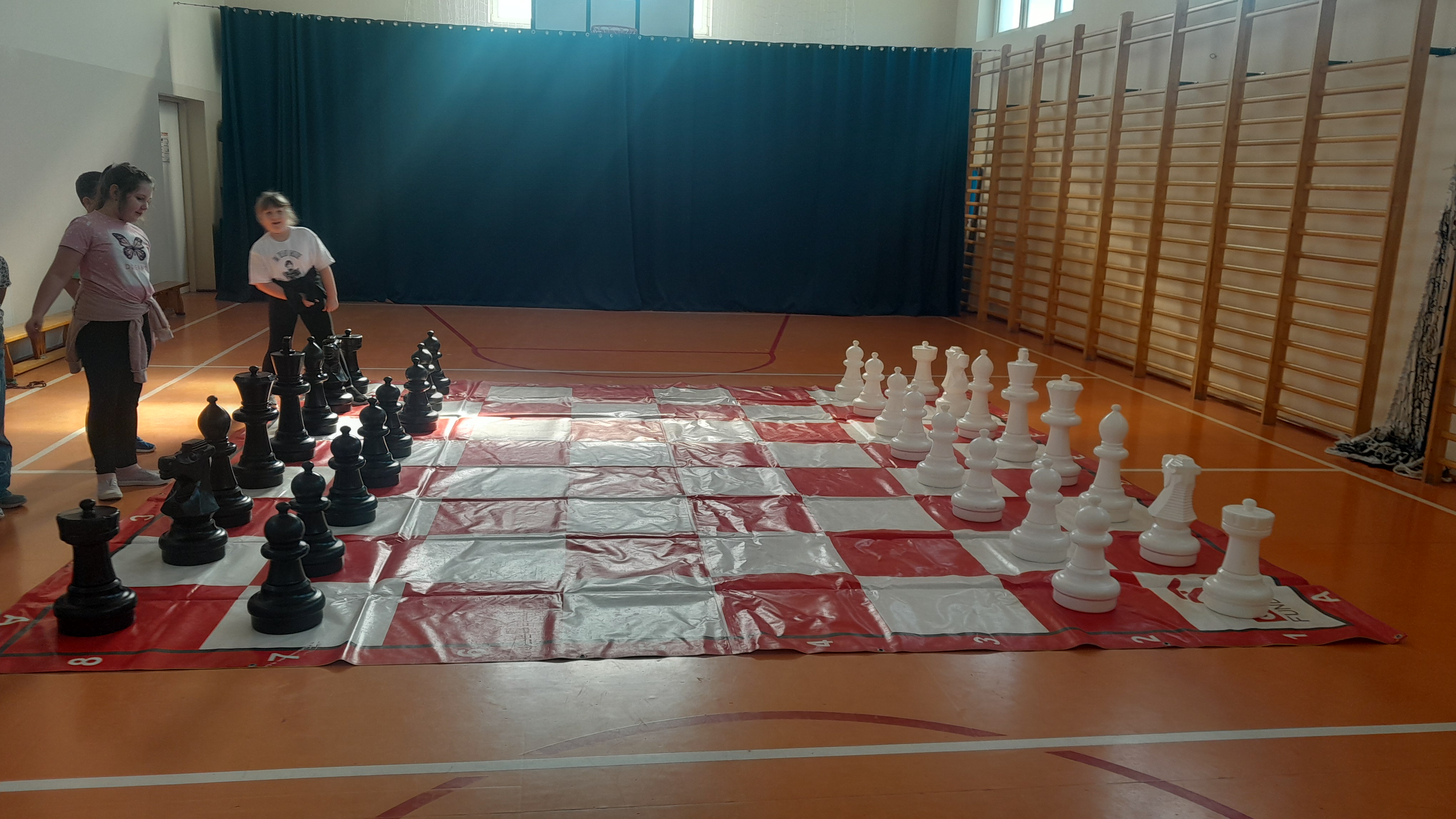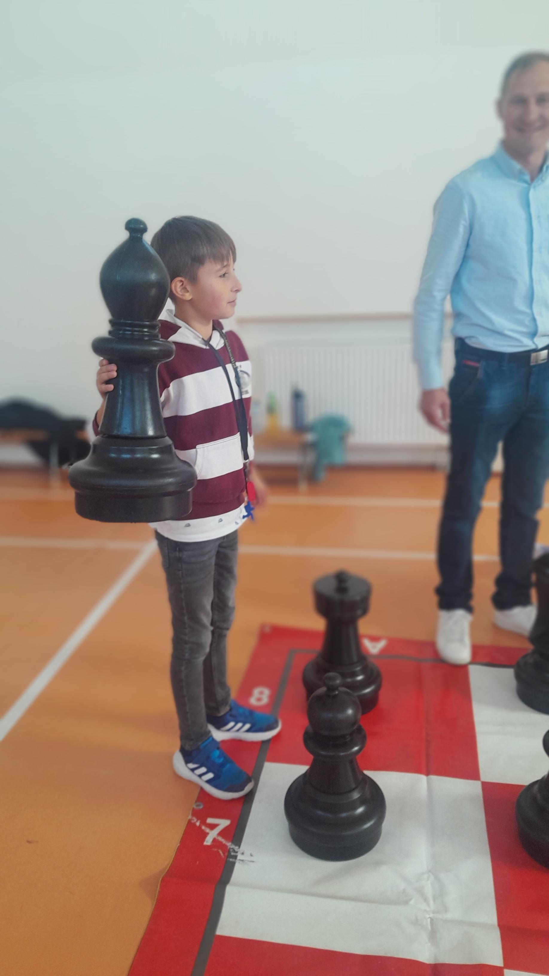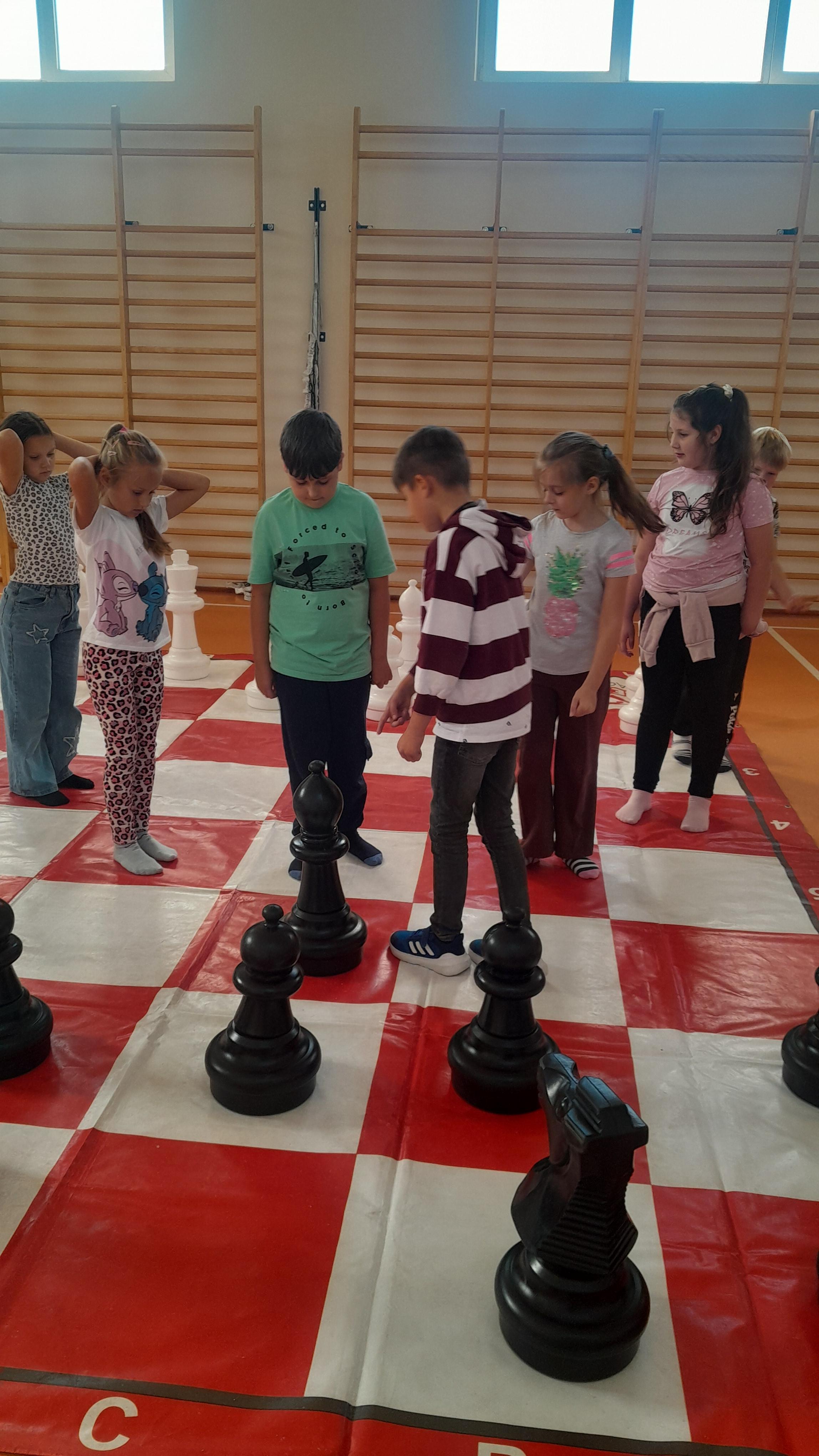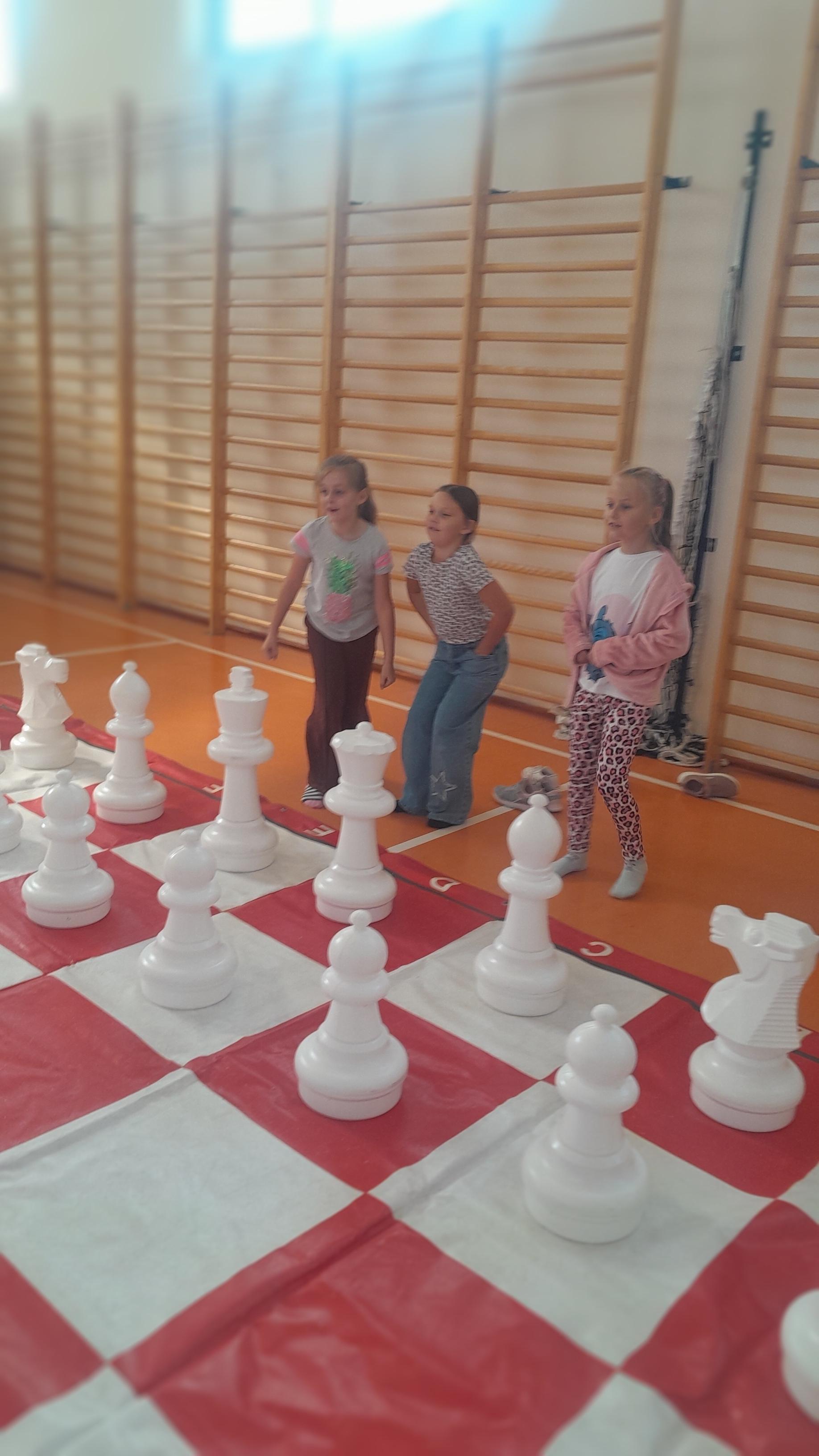 Zajęcia kreatywne to czas, w którym uczniowie mogą rozwijać swoje pasje, uczyć się współpracy i odkrywać nowe zainteresowania poprzez zabawę i różnorodne aktywności. To moment, w którym nauka łączy się z radością i inspiracją, a dzieci mają okazję doświadczać czegoś wyjątkowego. Dzisiejsze zajęcia rozwijające kreatywność w klasie II były wyjątkowe, bowiem uczniowie mogli sprawdzić swoje umiejętności w szachach plenerowych, gdzie pionki i figury miały naprawdę imponujące rozmiary. Dzięki uprzejmości pana Tomasza Bieleckiego – taty Kornela – dzieci mogły przenieść się w niezwykły świat królewskiej gry i poczuć się jak prawdziwi mistrzowie szachownicy. Pan Tomasz wraz z Kornelem nie tylko rozstawili szachy, ale i w ciekawy sposób opowiadali o zasadach gry. Wspólnie zdradzali różne patenty i strategie, które mogą pomóc w przyszłych rozgrywkach. Uczniowie mieli okazję zadawać pytania, rozwiązywać zagadki szachowe i sprawdzać swoją wiedzę w praktyce. Była to znakomita okazja, by niektórzy uczniowie poznali podstawowe zasady szachów, a inni mogli doszlifować swoje dotychczasowe umiejętności. Gra w tak dużej skali była dla dzieci świetną zabawą, a jednocześnie rozwijała ich logiczne myślenie, cierpliwość i umiejętność planowania. Takie zajęcia pokazują, że nauka może łączyć się z radością i inspiracją, a czas spędzony razem owocuje nie tylko zdobywaniem nowych umiejętności, lecz także integracją całej klasy. Serdecznie dziękujemy Panu Bieleckiemu oraz Kornelowi za przygotowanie i poprowadzenie tej wyjątkowej lekcji. Dzięki ich zaangażowaniu dzieci mogły odkrywać tajniki królewskiej gry w niecodzienny, inspirujący sposób.