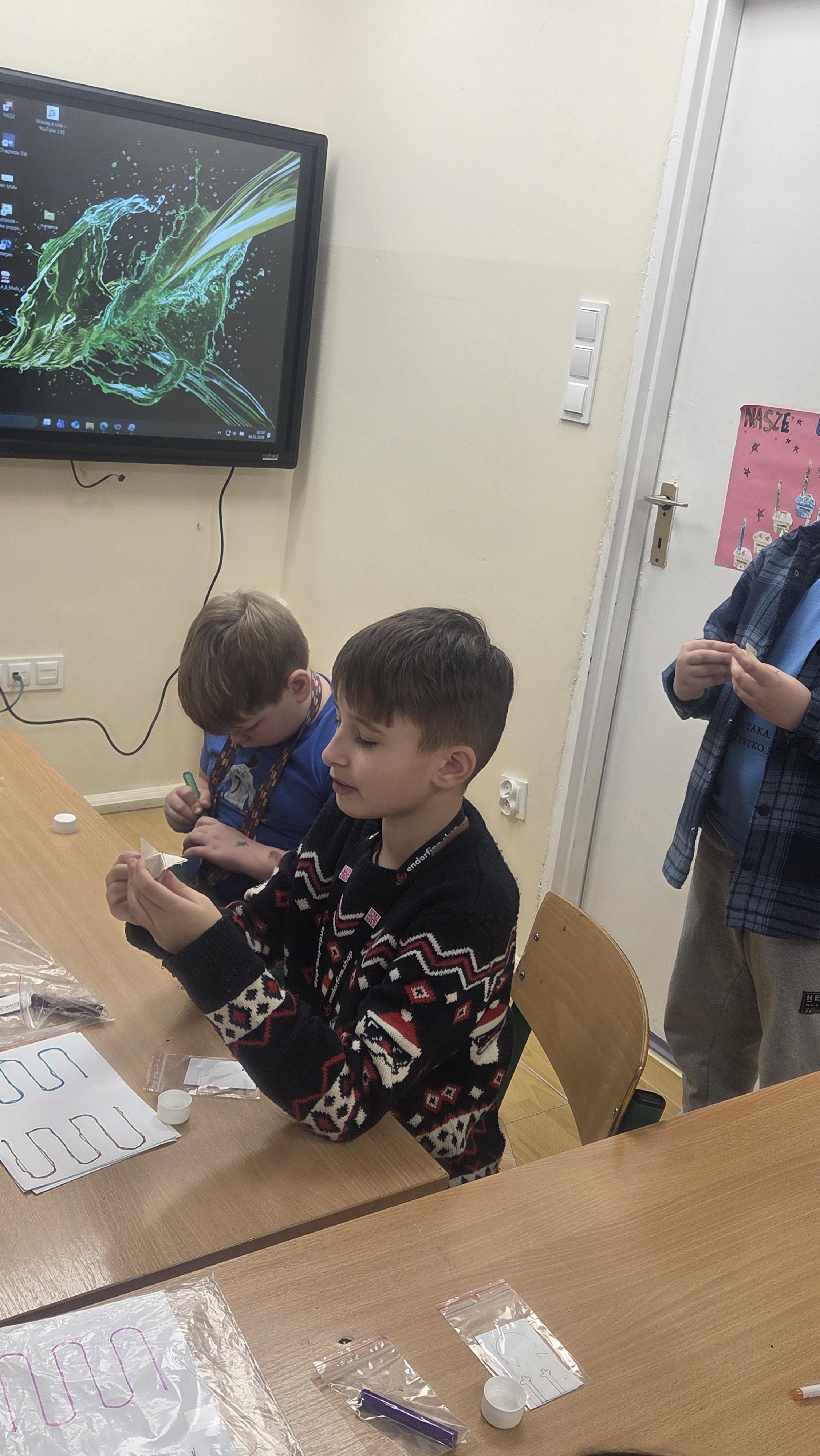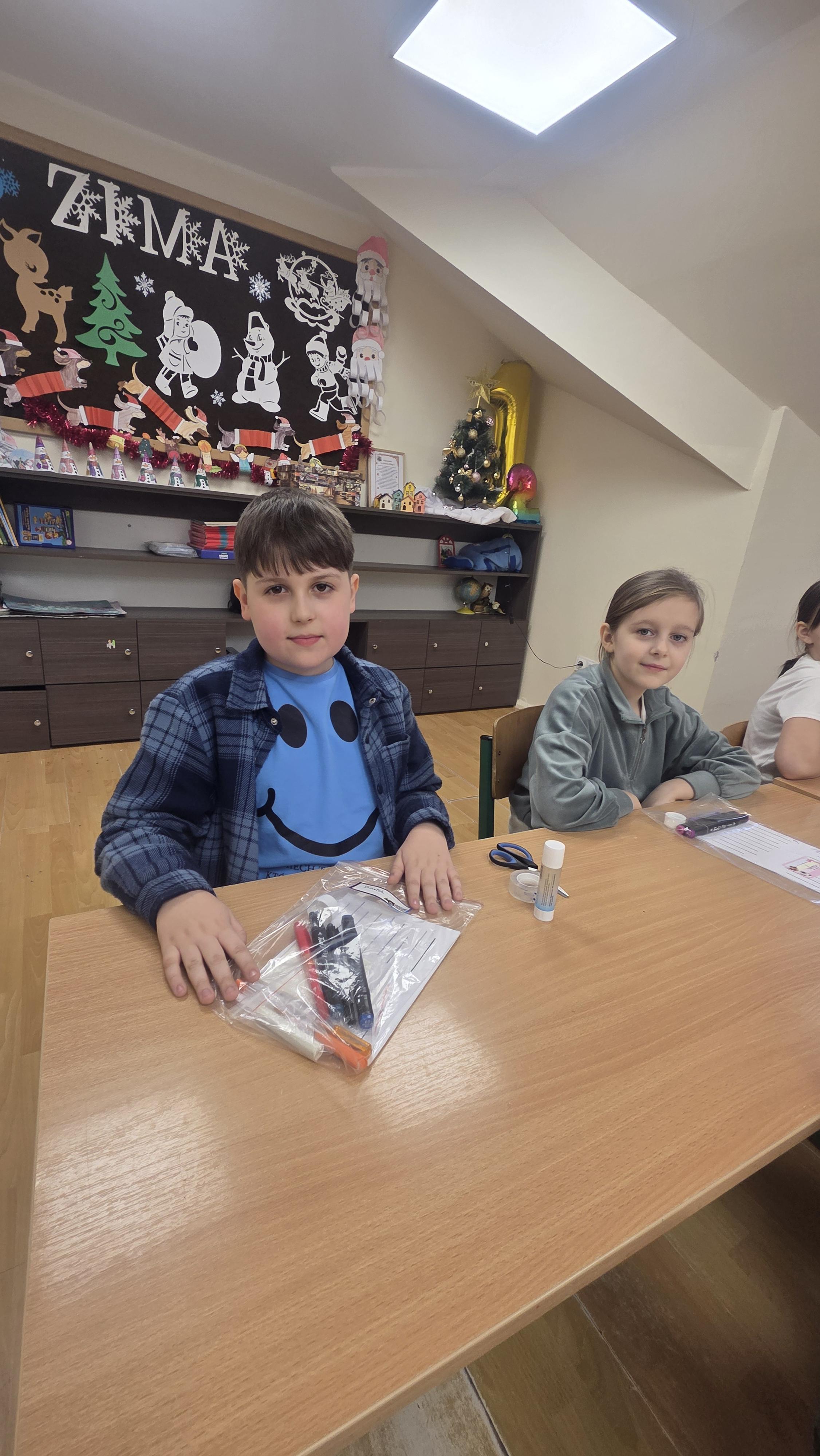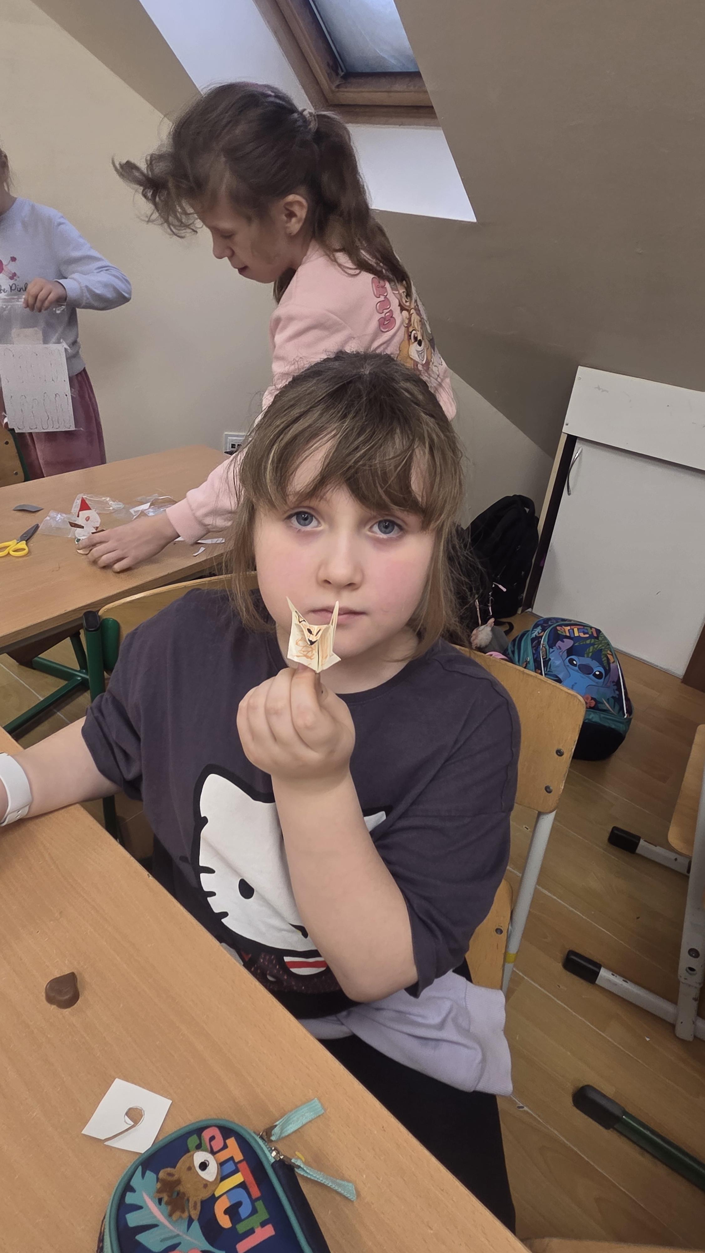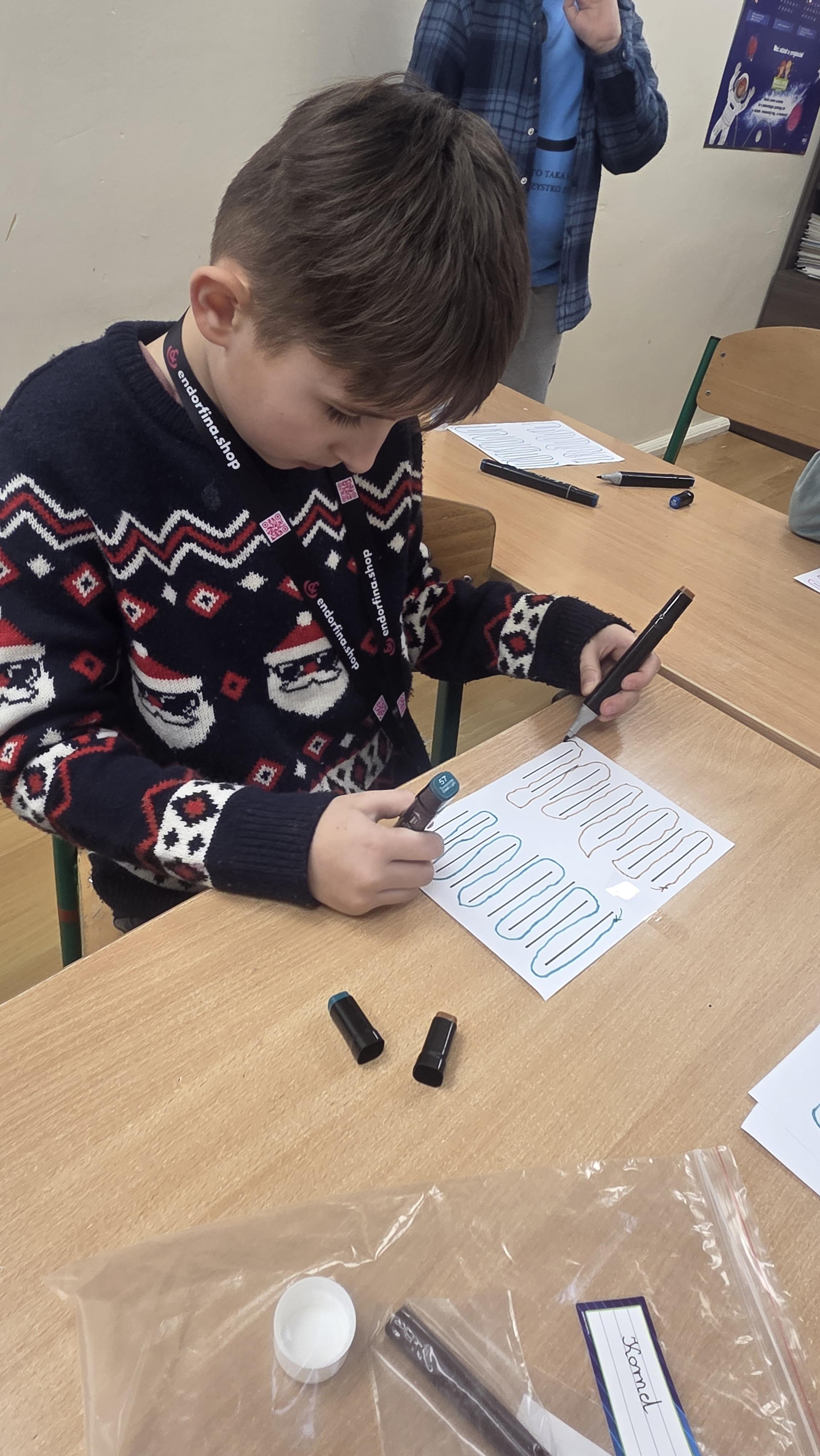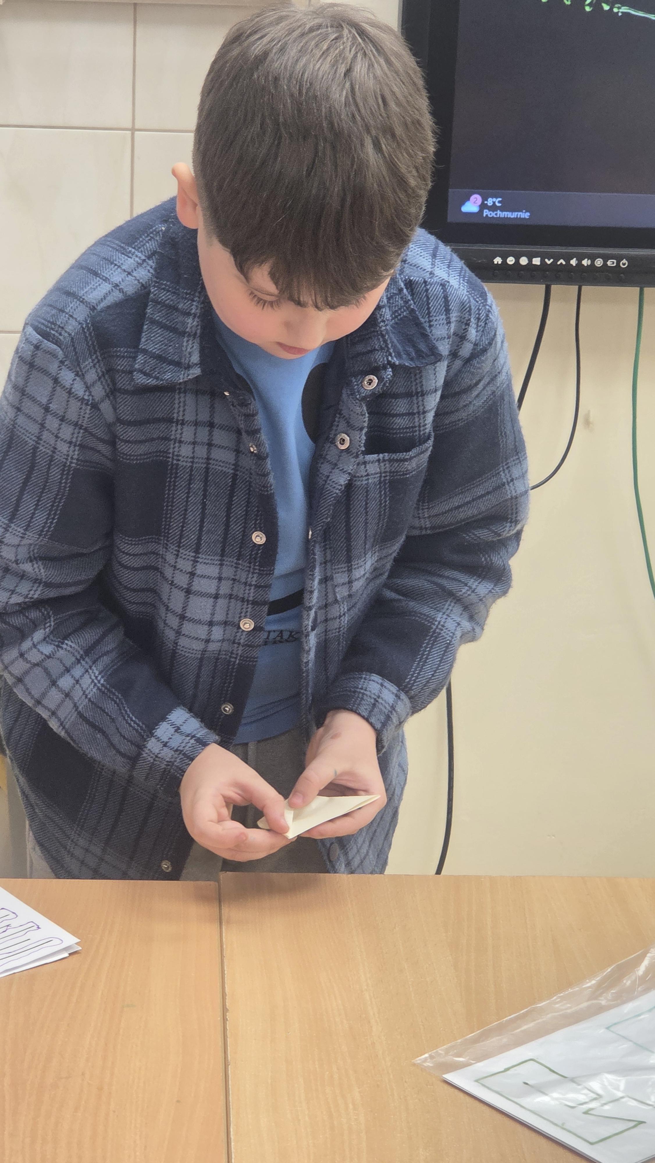 Uczniowie klasy drugiej wzięli dziś udział w niezwykle ciekawych i pełnych radości zajęciach kreatywnych, które tym razem poprowadził Bartek Zelma. Program spotkania był wyjątkowo różnorodny i wszechstronny - łączył ćwiczenia manualne, działania artystyczne oraz aktywności wspierające rozwój obu półkul mózgowych. Pierwszym punktem zajęć było rysowanie dwustronne, czyli jednoczesne tworzenie wzorów obiema rękami. To niecodzienne ćwiczenie dostarczyło dzieciom mnóstwo zabawy, a jednocześnie wspierało harmonijną pracę lewej i prawej półkuli mózgu, poprawiając koncentrację, koordynację wzrokową - ruchową oraz sprawność grafomotoryczną. Następnie uczestnicy tworzyli liska z origami. Ta część zajęć wymagała precyzji, cierpliwości i logicznego myślenia, a jednocześnie rozwijała wyobraźnię przestrzenną oraz zdolności manualne. Dzieci z dumą obserwowały, jak z prostego kawałka papieru powstaje uroczy lisek. Na zakończenie uczniowie z zakrętki, plasteliny oraz własnoręcznie przygotowanych przez Bartka szablonów wykonali bałwanka. To zadanie pozwoliło im na swobodną ekspresję twórczą i kreatywne wykorzystanie różnorodnych materiałów plastycznych w nieoczywisty sposób. Warto podkreślić, że Bartek przez całe zajęcia udzielał dzieciom szczegółowych instrukcji, cierpliwie tłumacząc każdy etap pracy. Opowiadał również, jakie umiejętności rozwija każde zadanie i jaki jest jego cel, dzięki czemu uczestnicy lepiej rozumieli sens wykonywanych aktywności i mogli świadomie angażować się w proces twórczy. Dzisiejsze zajęcia przyniosły dzieciom wiele korzyści: rozwijały kreatywność, sprawność manualną, koncentrację oraz wiarę we własne możliwości. Na szczególne uznanie zasługuje fakt, że wszystkie pomoce zostały przygotowane samodzielnie - to dowód ogromnego zaangażowania, pomysłowości i serca włożonego przez prowadzącego. Serdecznie dziękujemy Bartkowi za inspirujące, pełne pasji i profesjonalizmu zajęcia. Gratulujemy świetnie poprowadzonych warsztatów. Bartku, Twoja kreatywność, energia i zaangażowanie naprawdę robią wrażenie.